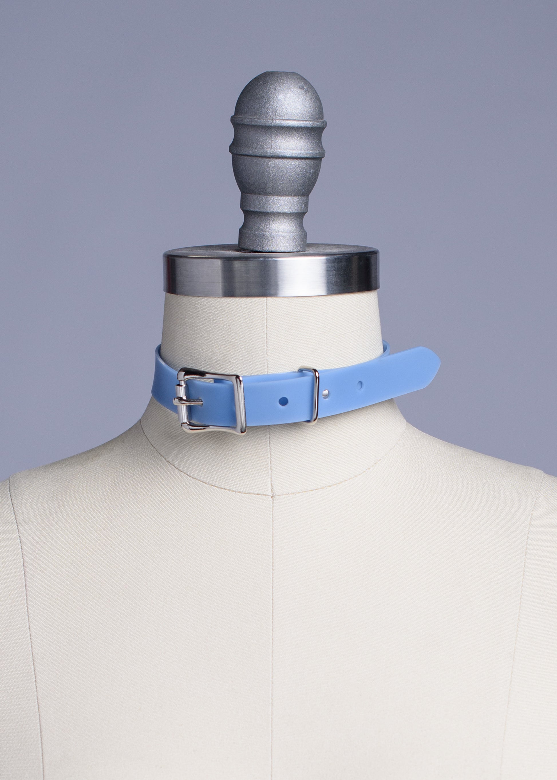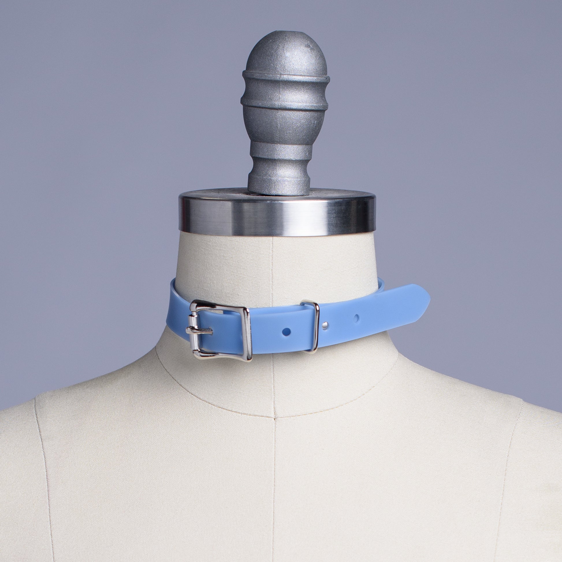 Classic, minimal collar design in pastel periwinkle blue matte finish jelly PVC. Fit is adjustable with buckle. Wear with buckle in front or back.