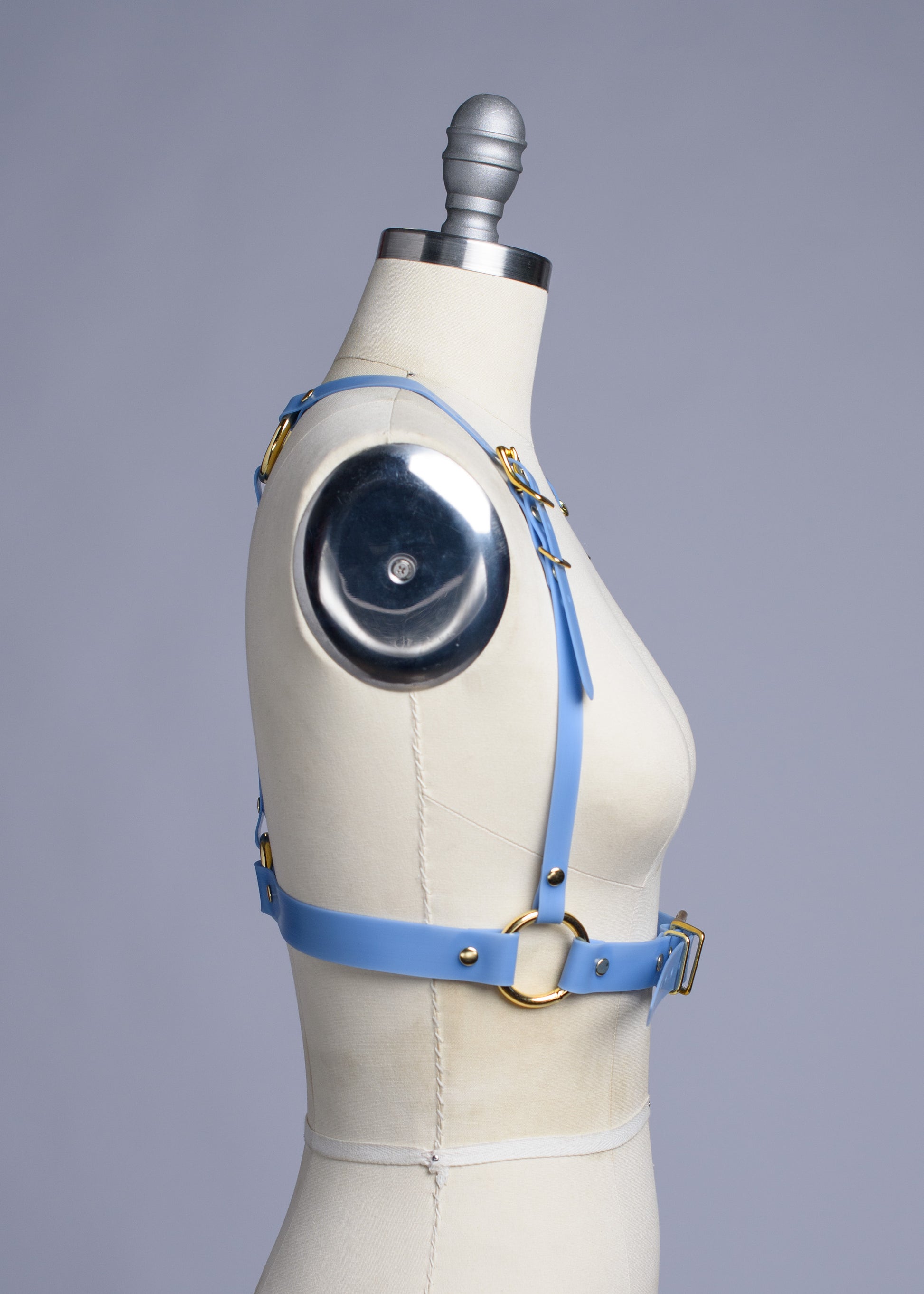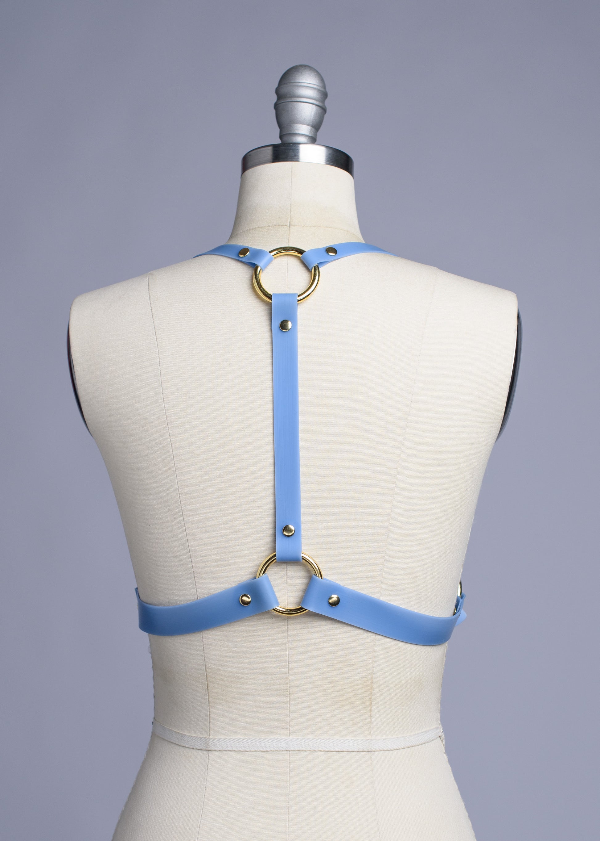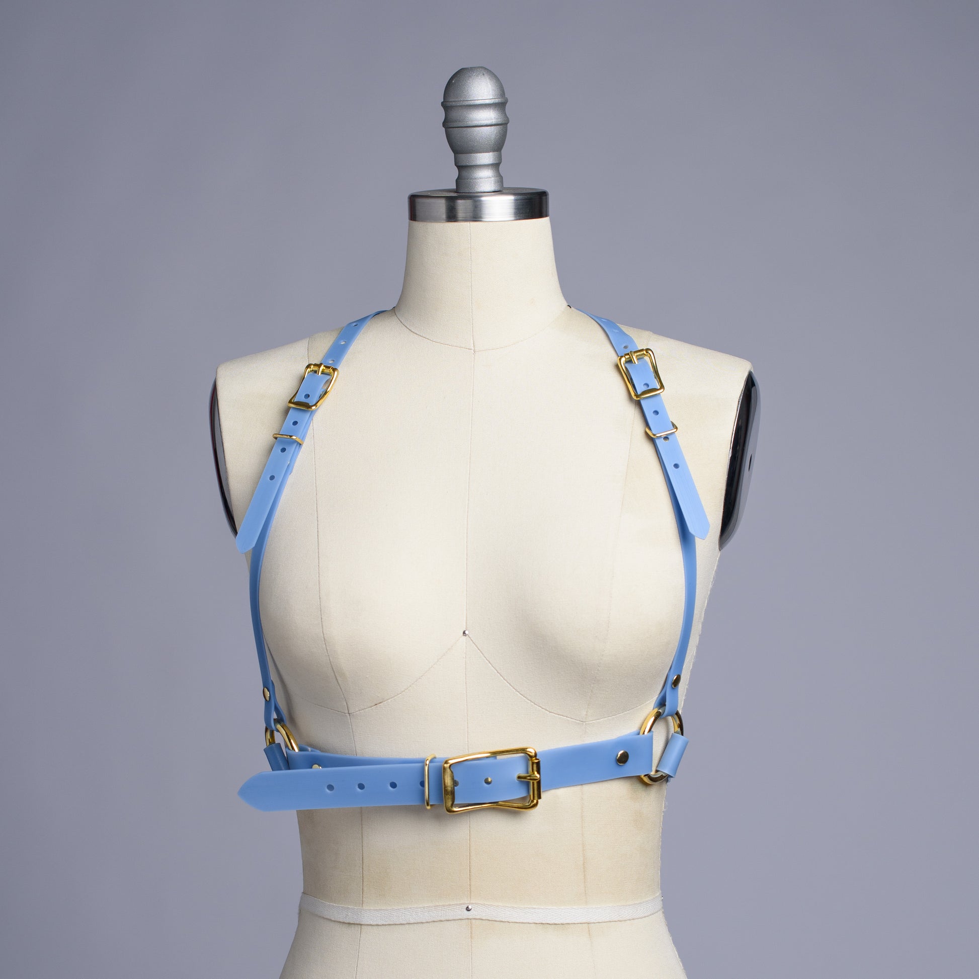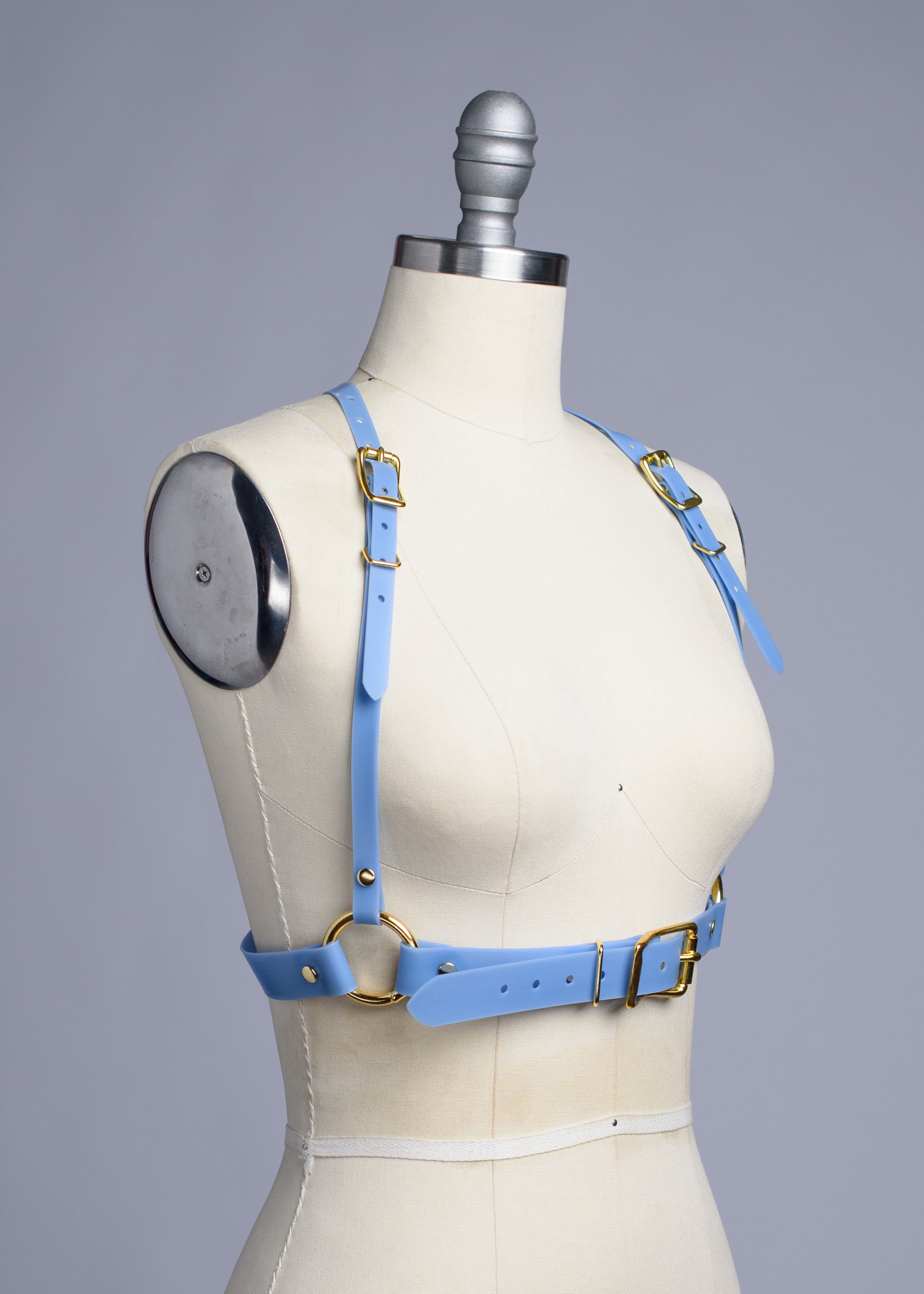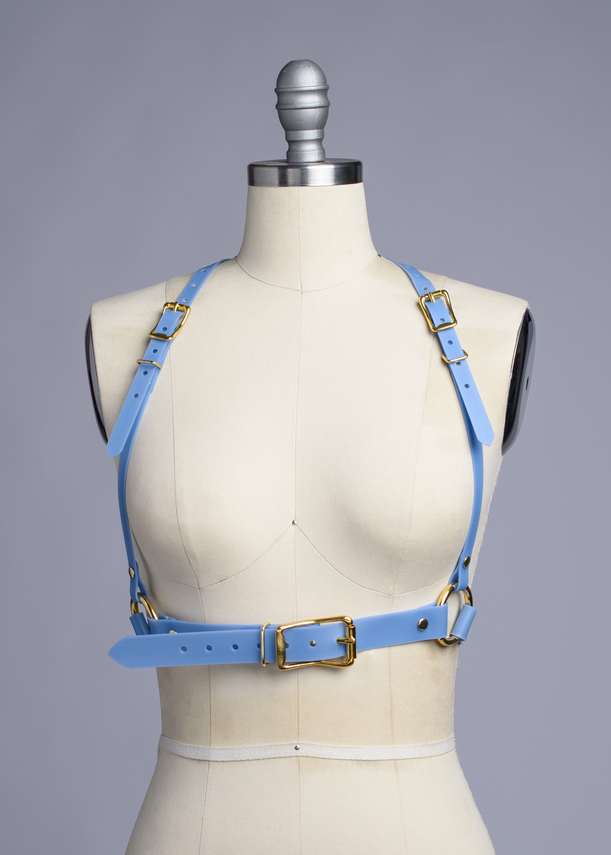 Classic harness styling meets a unique pastel pop of color! This underbust harness is handmade in matte "jelly finish" periwinkle blue pastel PVC. Fit is adjustable with buckles and straps.
