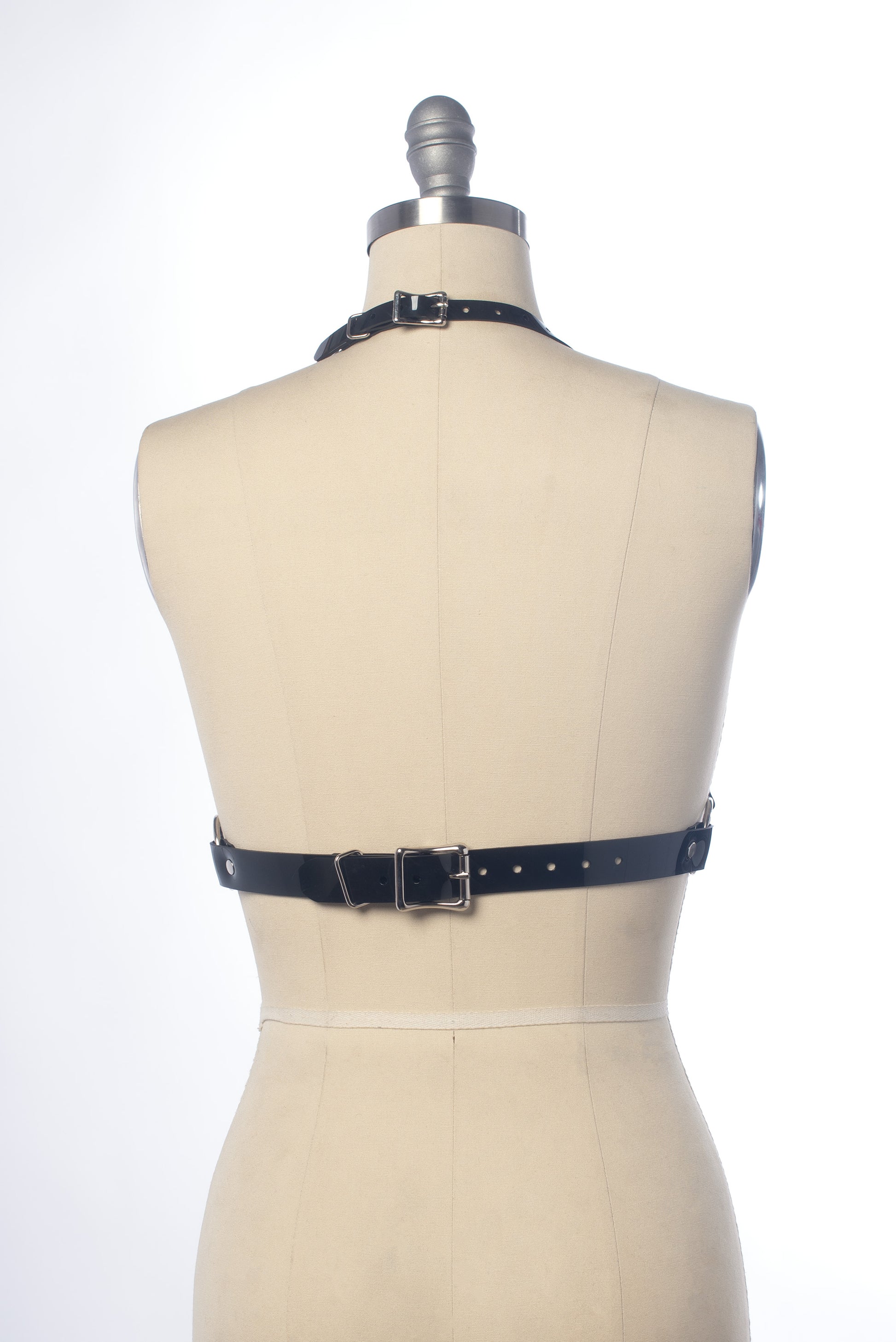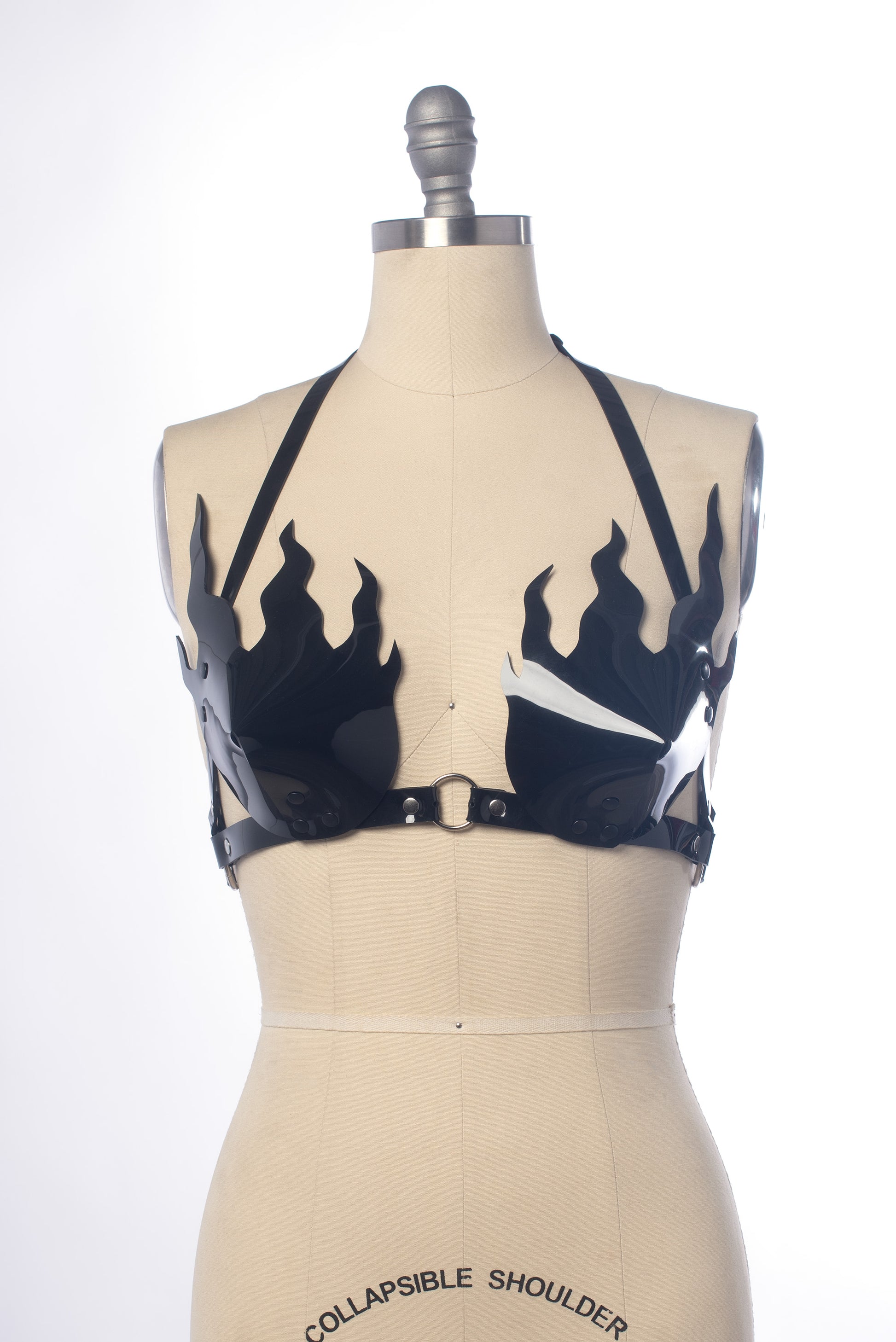 The Black Flame Harness Bra is inspired by black metal and witchy 70s gothic novel covers. Wear alone or layered and add a touch of drama to any outfit.