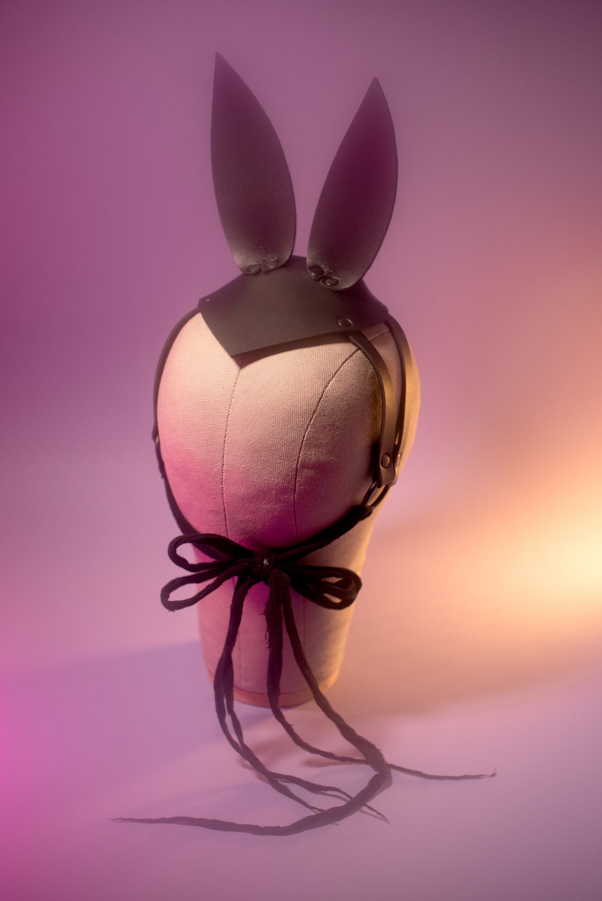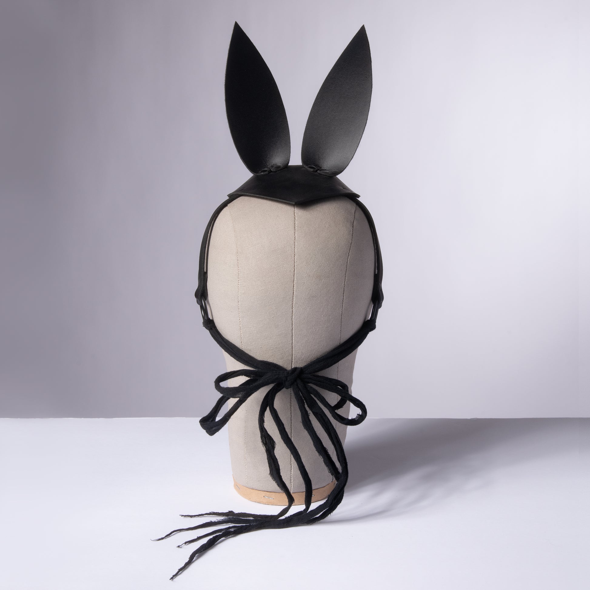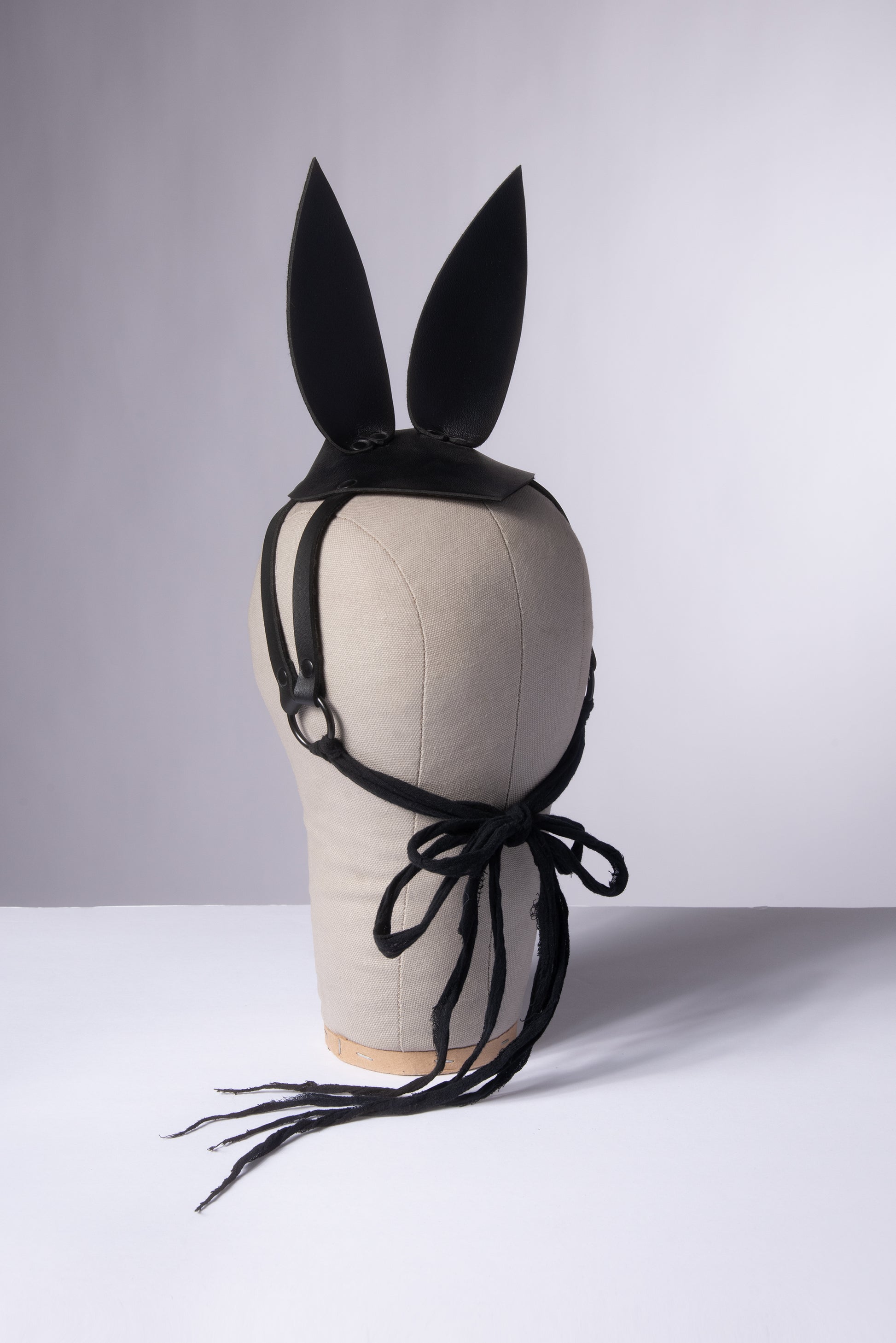 Make a statement in this harness fascinator headpiece with bunny ears. Attaches to the hair with a comb and gauze ties that can be tied in the back of the head or under the chin.
