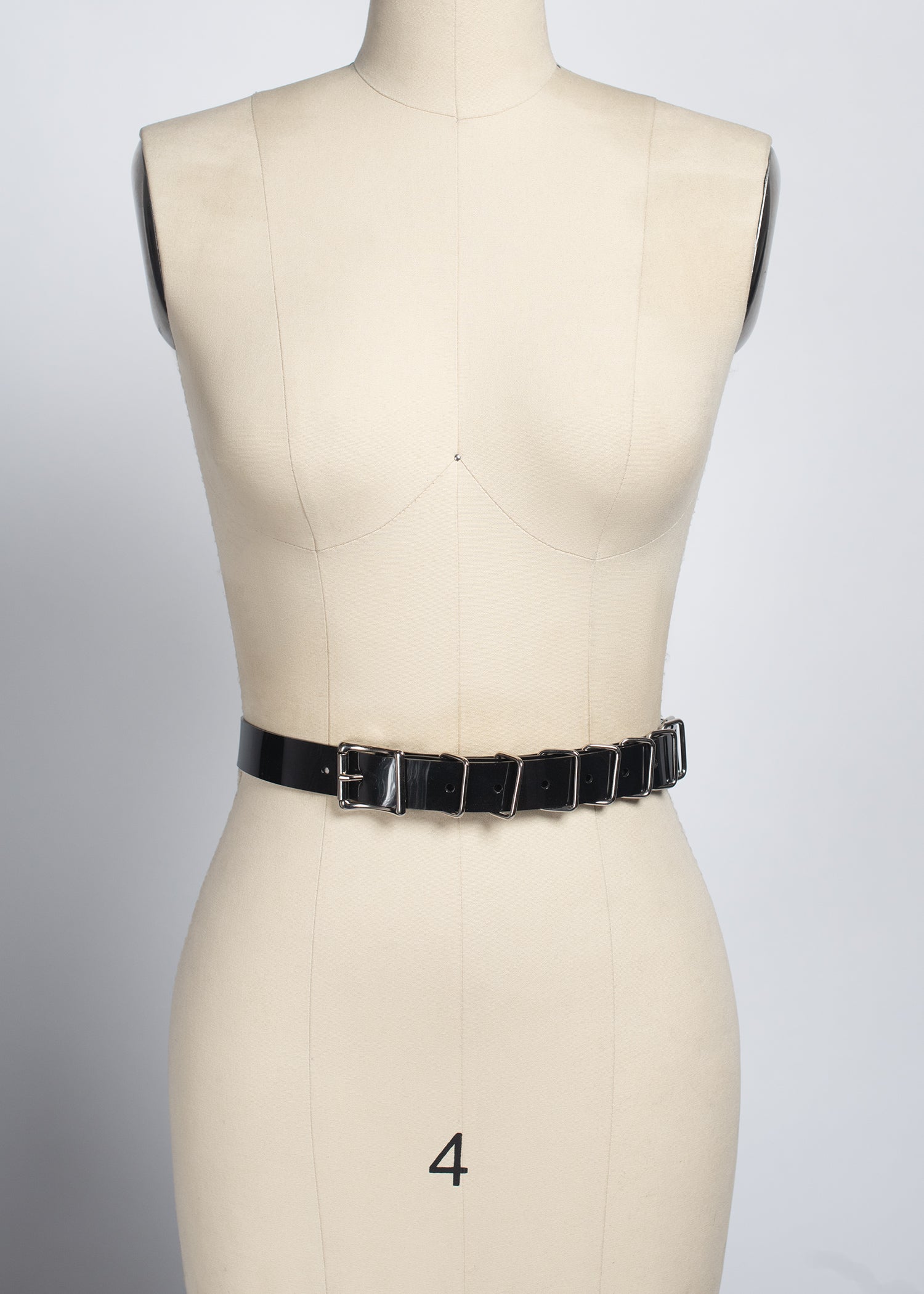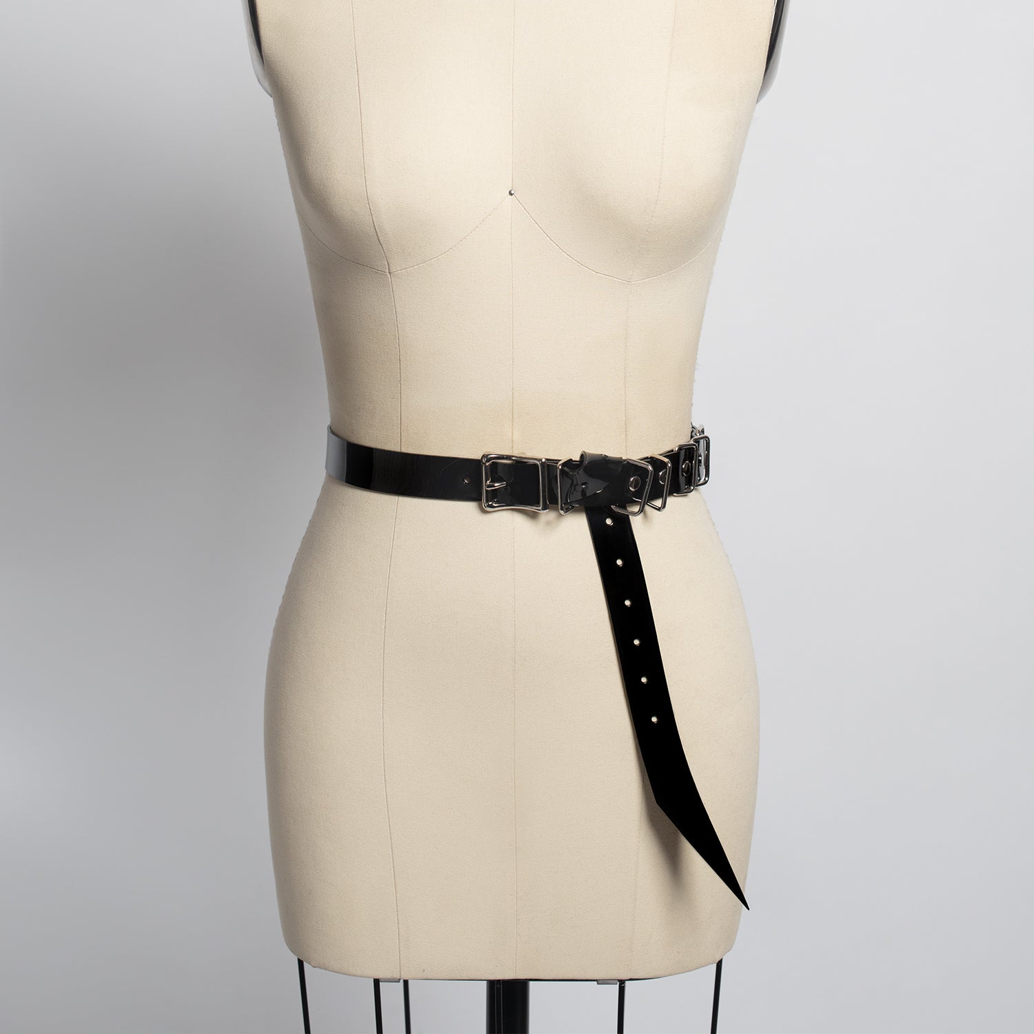 Belt is 1" wide. Strap end is cut to an angular "sharp" point for that extra industrial edge. Can be worn at the waist, with the strap end long and wrapped under (as shown) or at the hips.