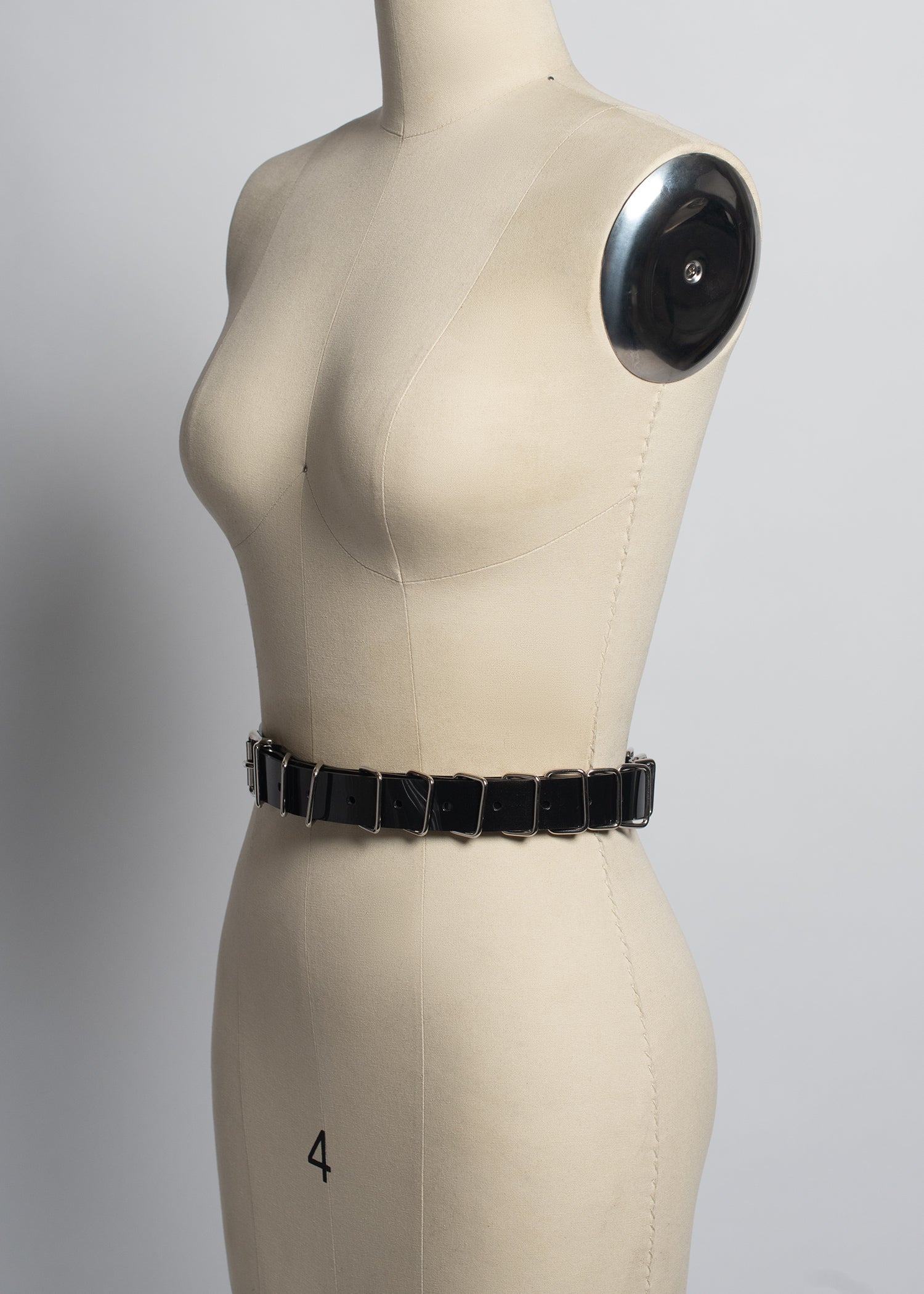 High quality, cyberpunk inspired waist belt in black vegan leather or PVC with dozens of square metal belt keepers.