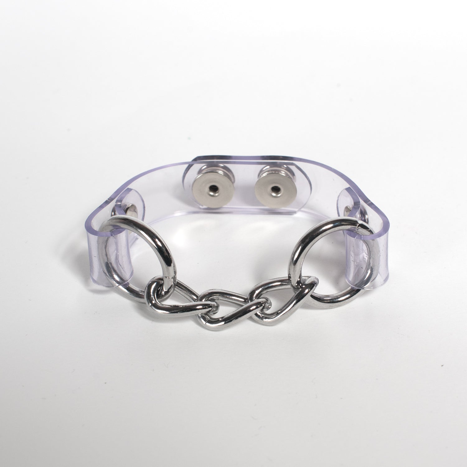 The Industrial Chained Bracelet pairs PVC and metal hardware together, showcasing it in a way that allows the metal to stand out and be the main event.