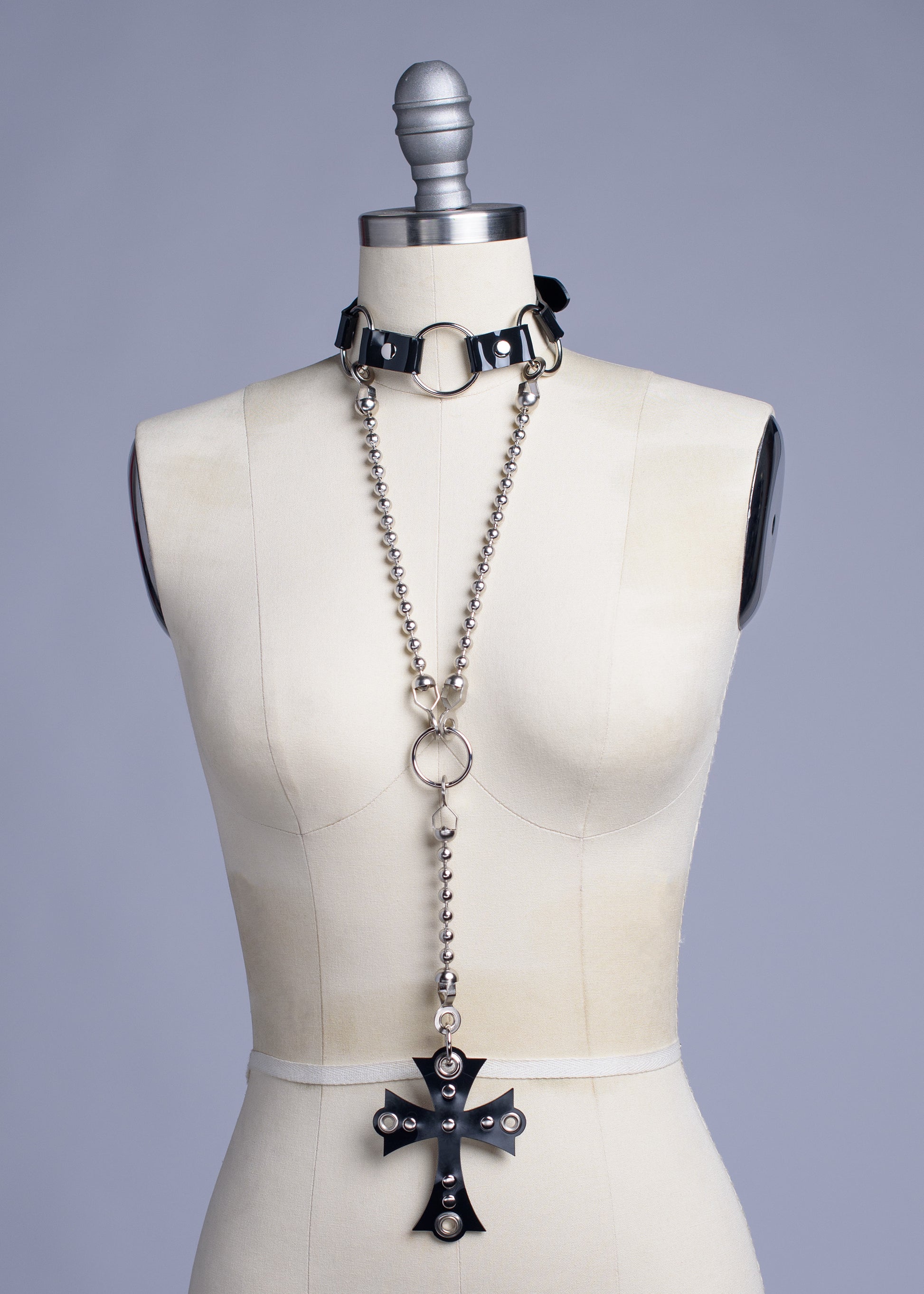Triple o-ring choker with long, attached rosary-inspired chunky ball chain and a large grommet and rivet-adorned cross. For that extra opulent layered necklaces look all in once piece!