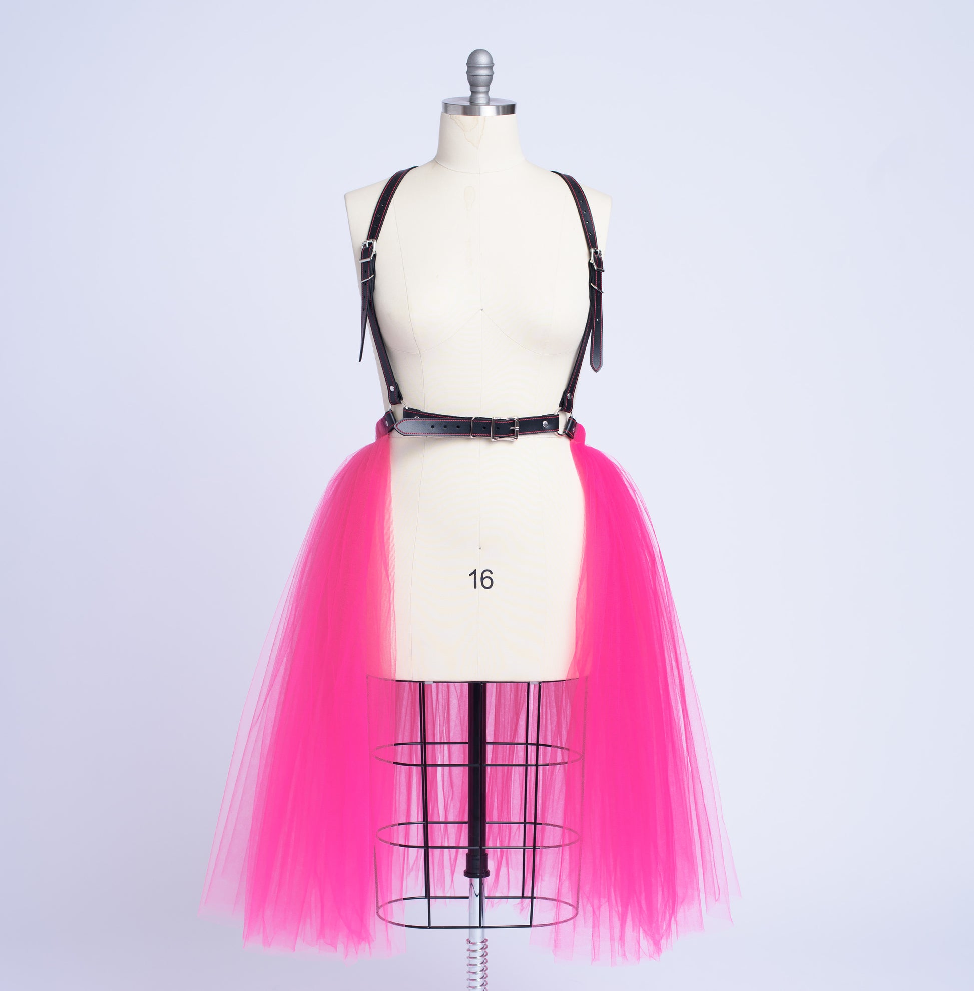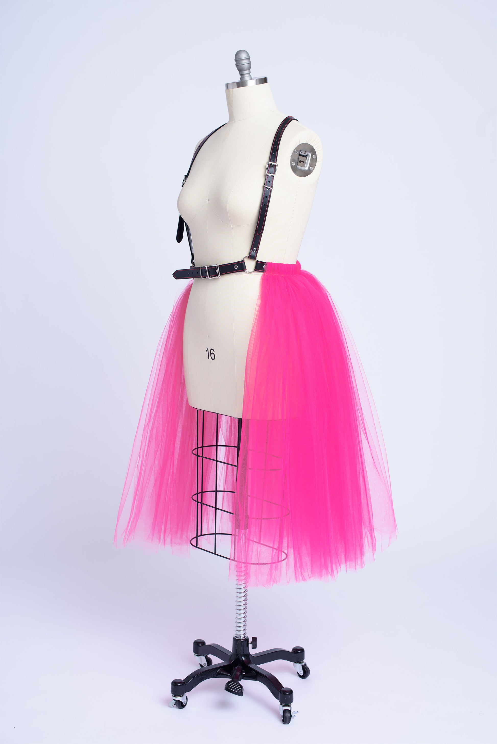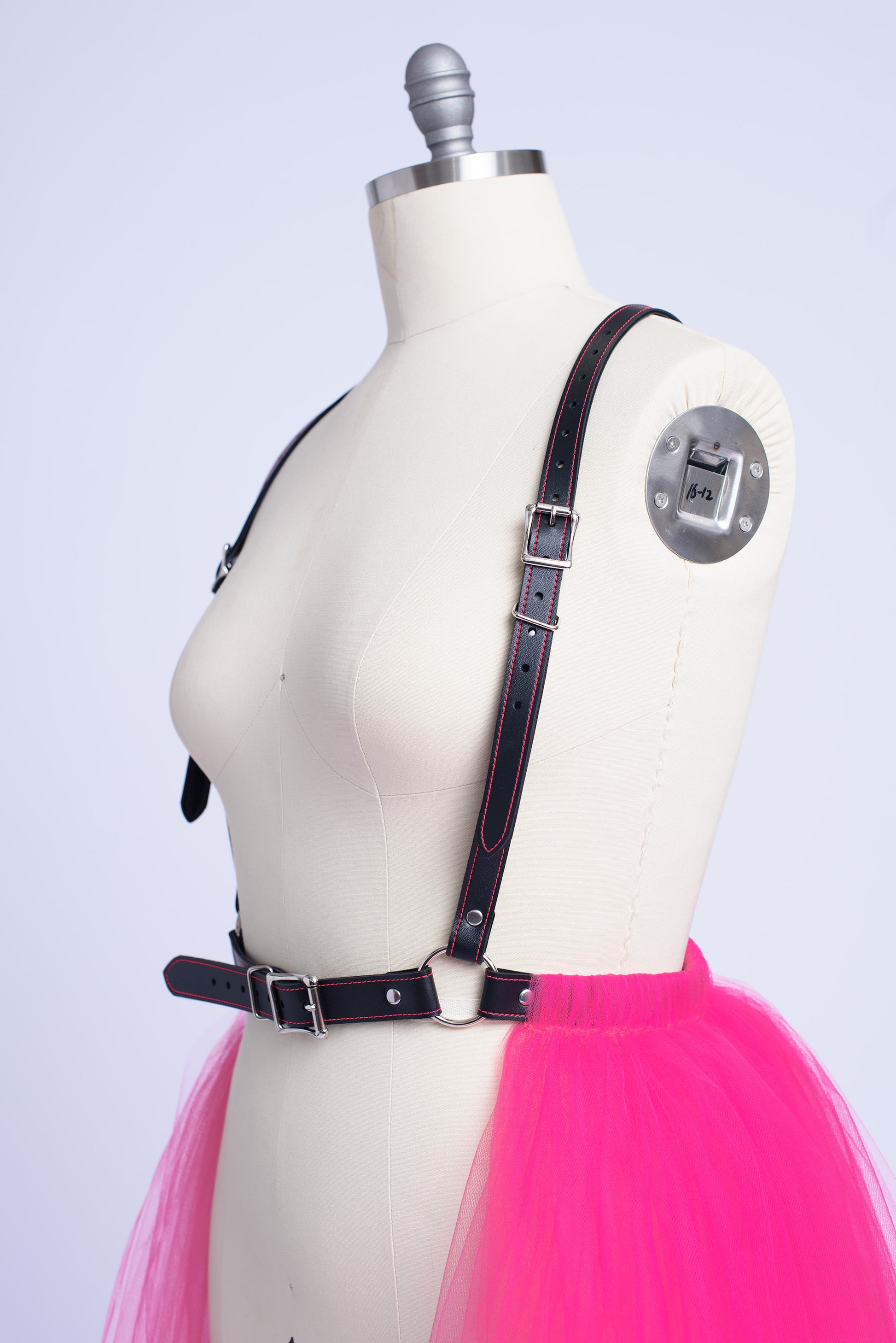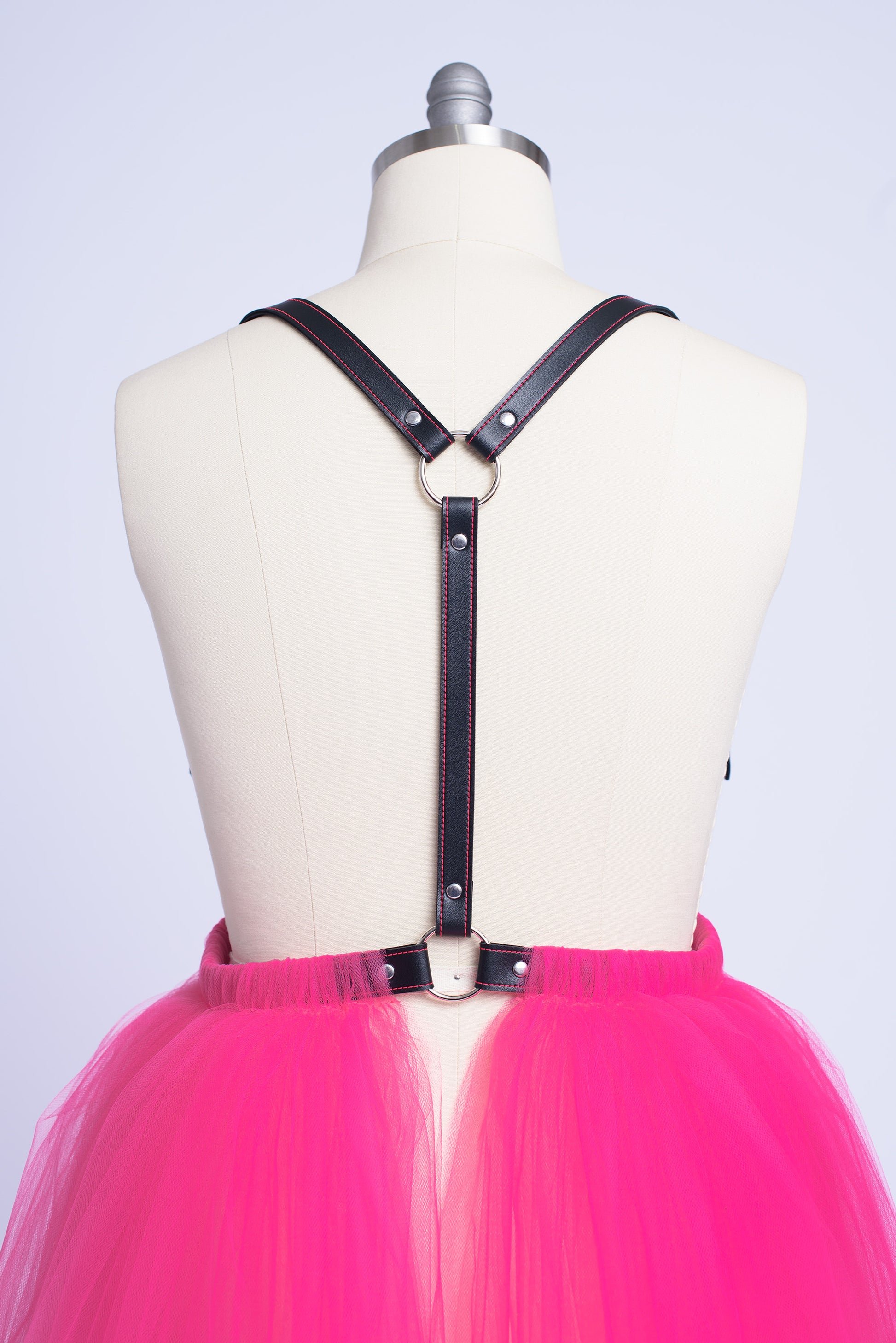 The Coraline Harness Skirt is a classic harness style updated with a full and flouncy long tulle skirt. Available in faux vegan leather and elevated with bright hot pink topstitching. Silver toned nickel plated steel hardware. Fit is adjustable at shoulders and waist. Designed to fit at the natural waist.