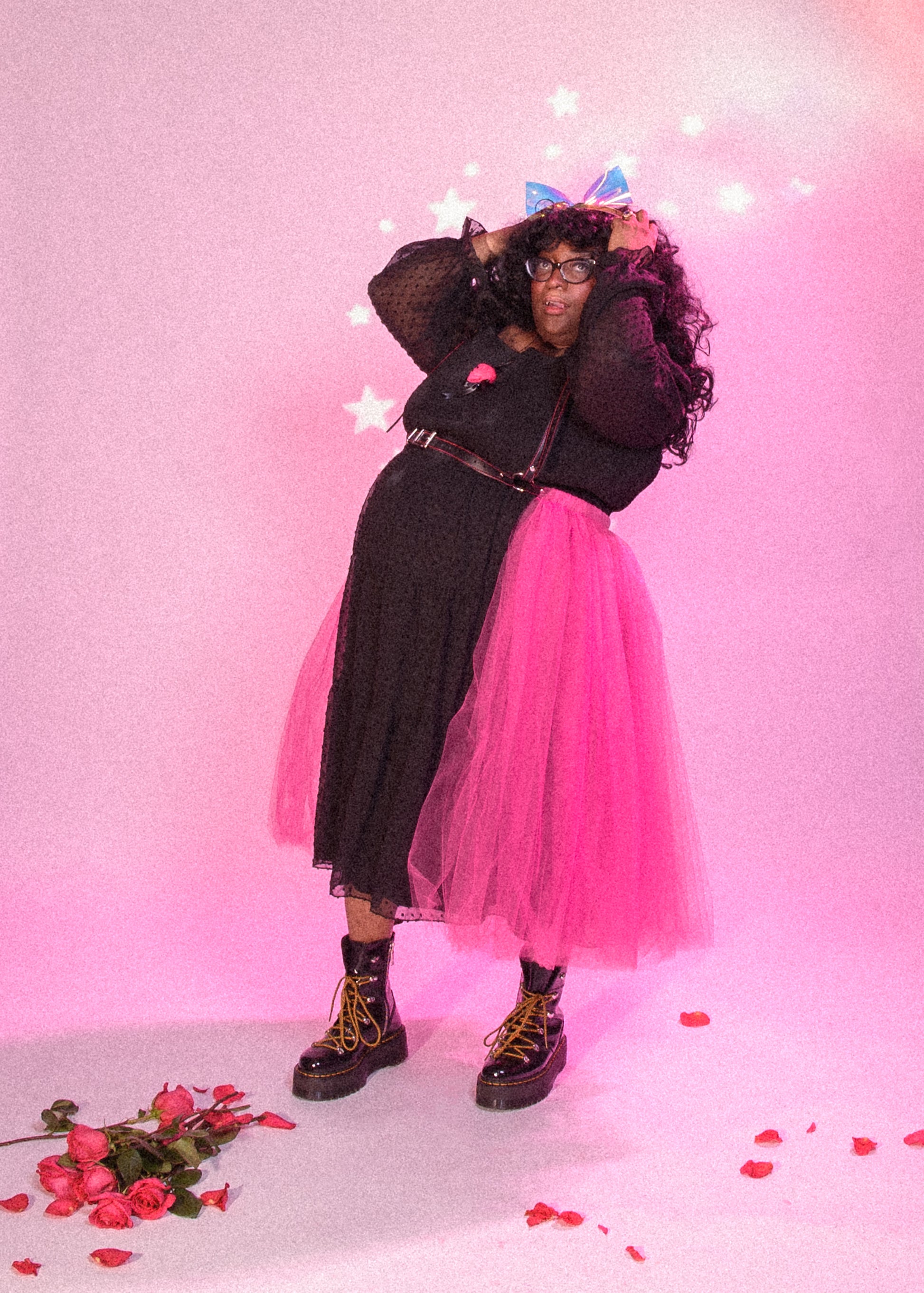 This is a one-off sample in size 3X and was worn once for a photoshoot for about an hour. This sample has polyester tulle in a slightly lighter shade of pink than the product photos (see the on-model photos), while all made-to-order garments have nylon tulle.