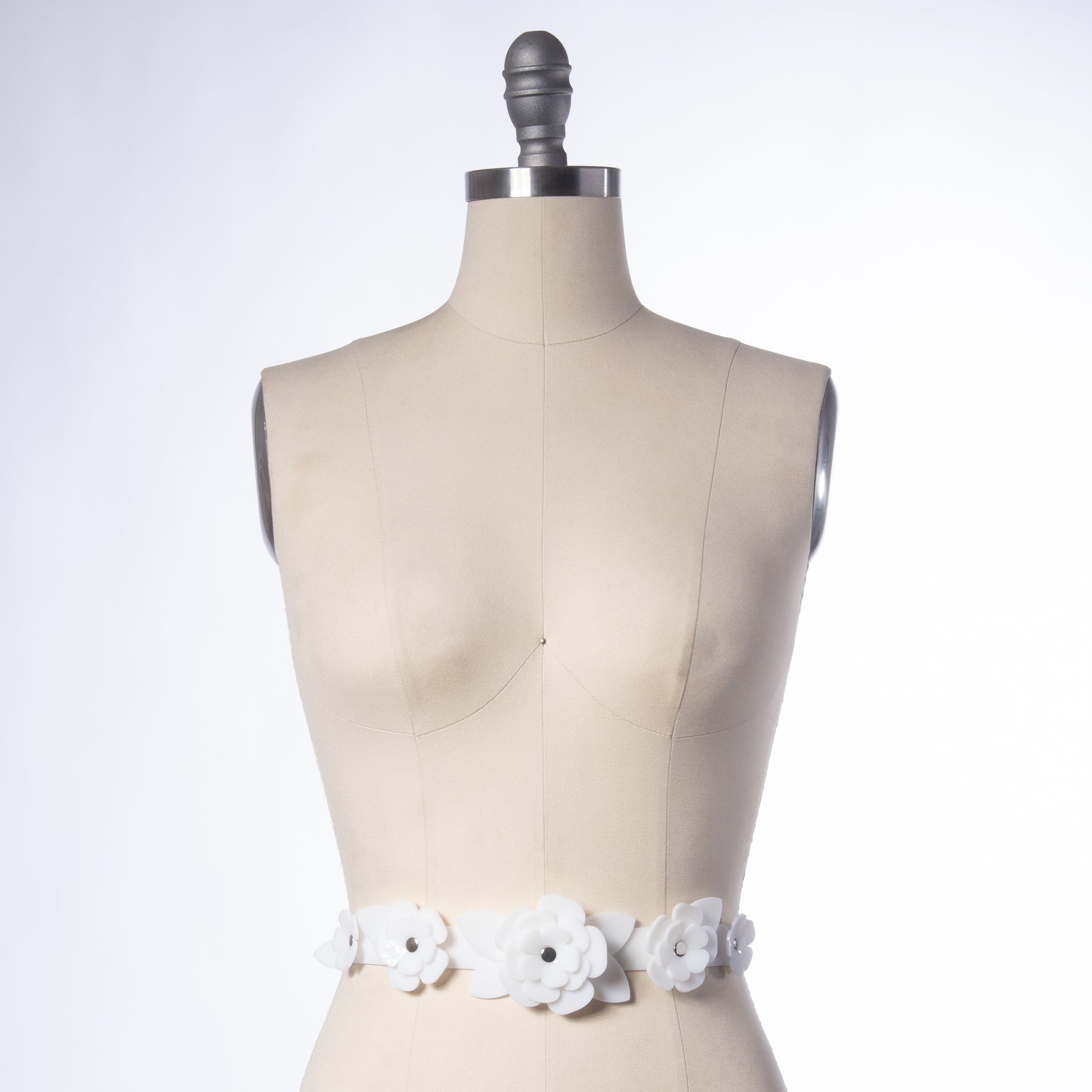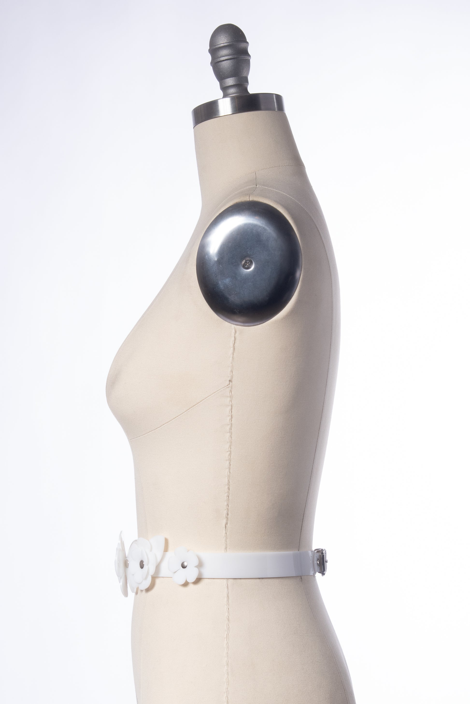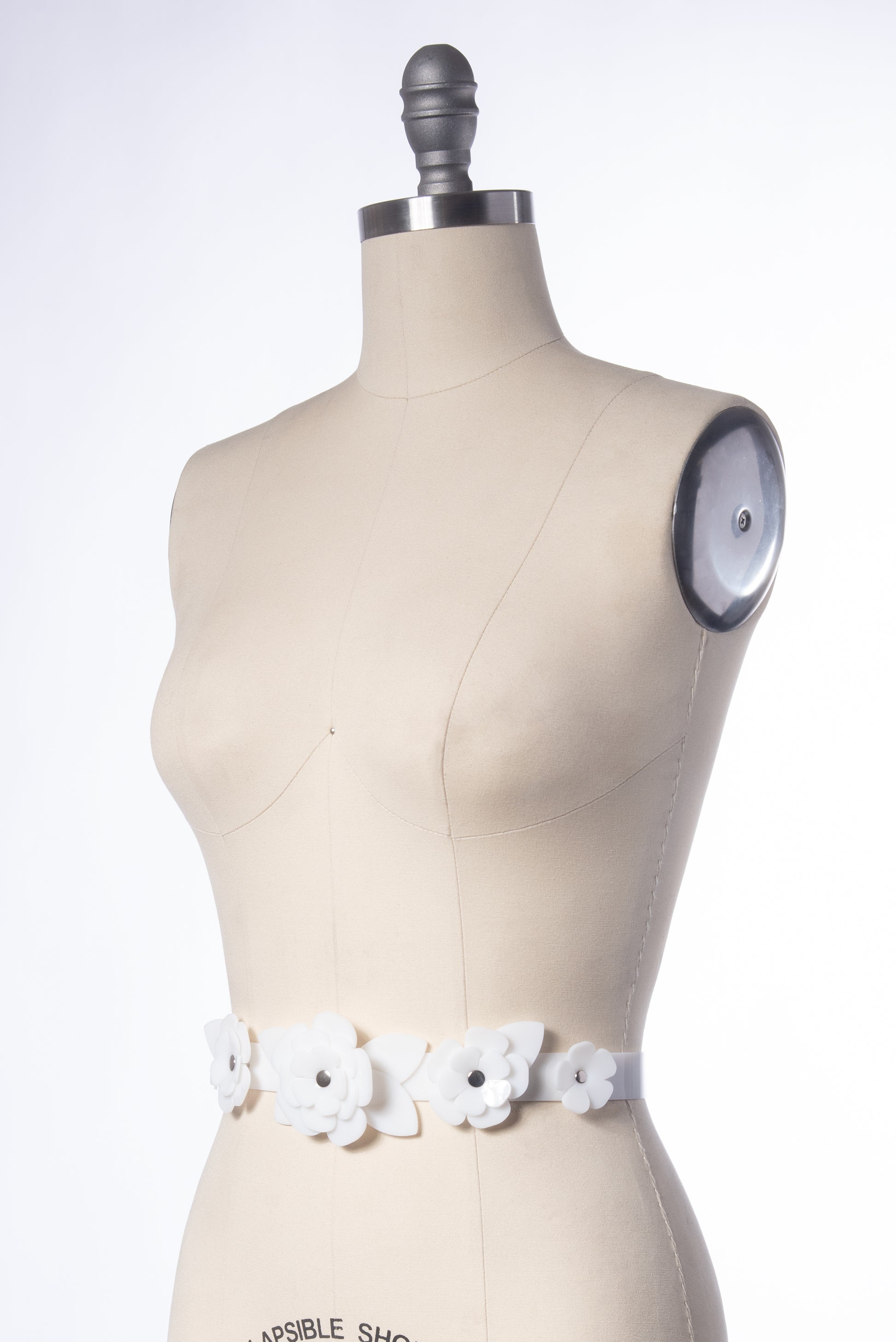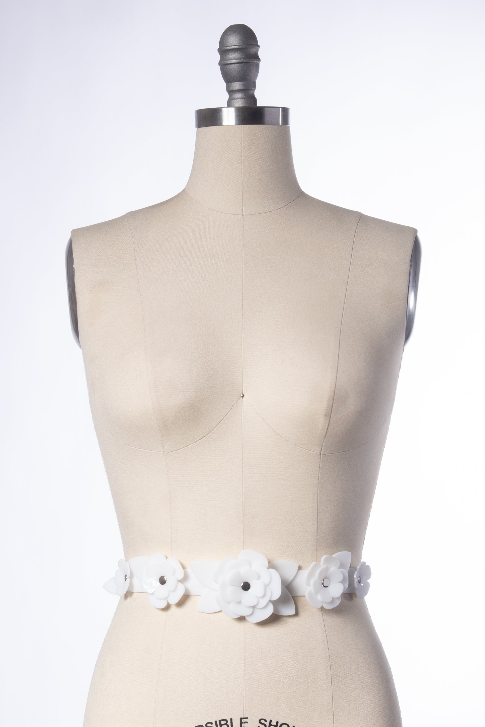 Delicate waist belt with a layered rose design in milky white PVC. This floral design is created with stacked and layered petals and leaves. Fit is adjustable with buckle in back. Sized to fit at the natural waist.