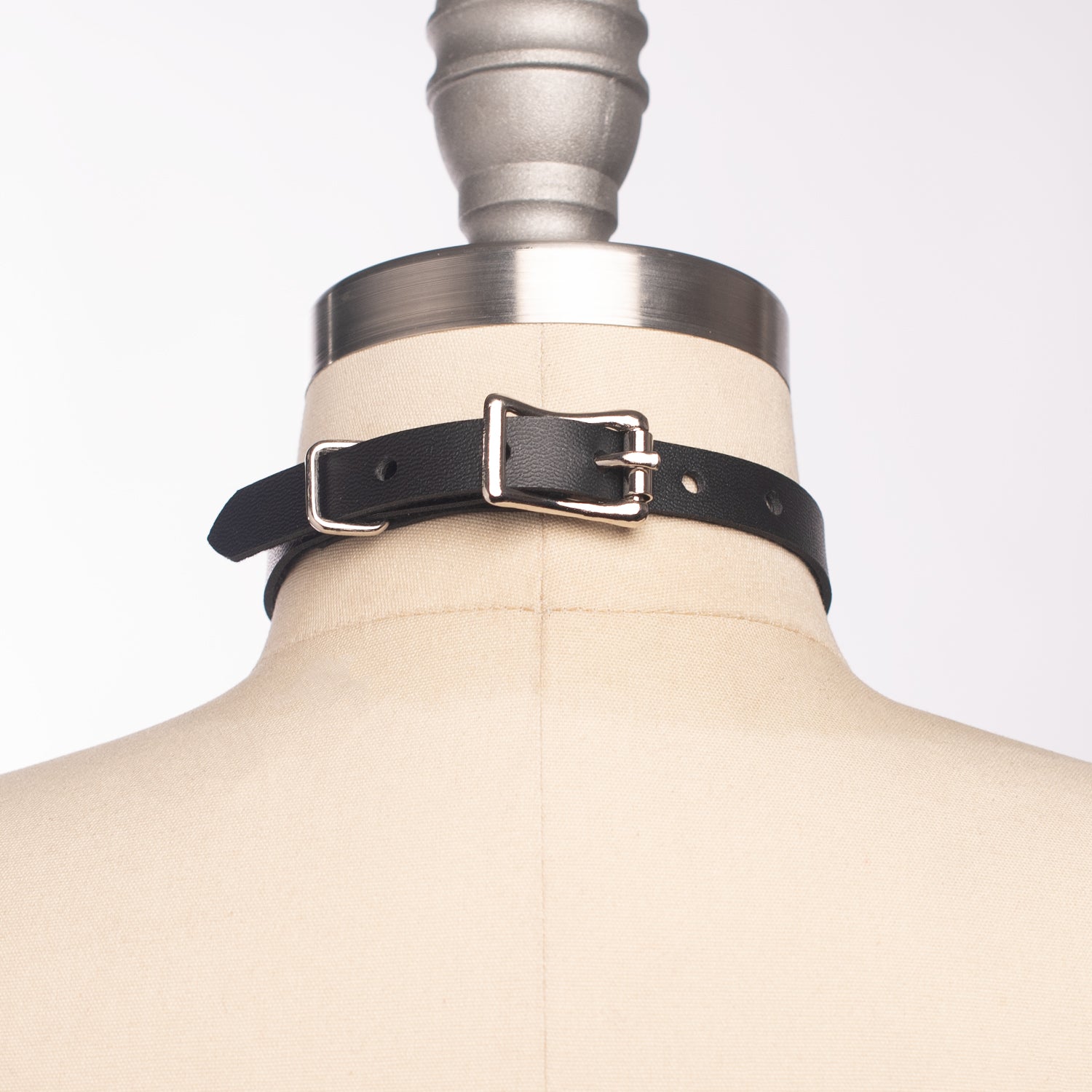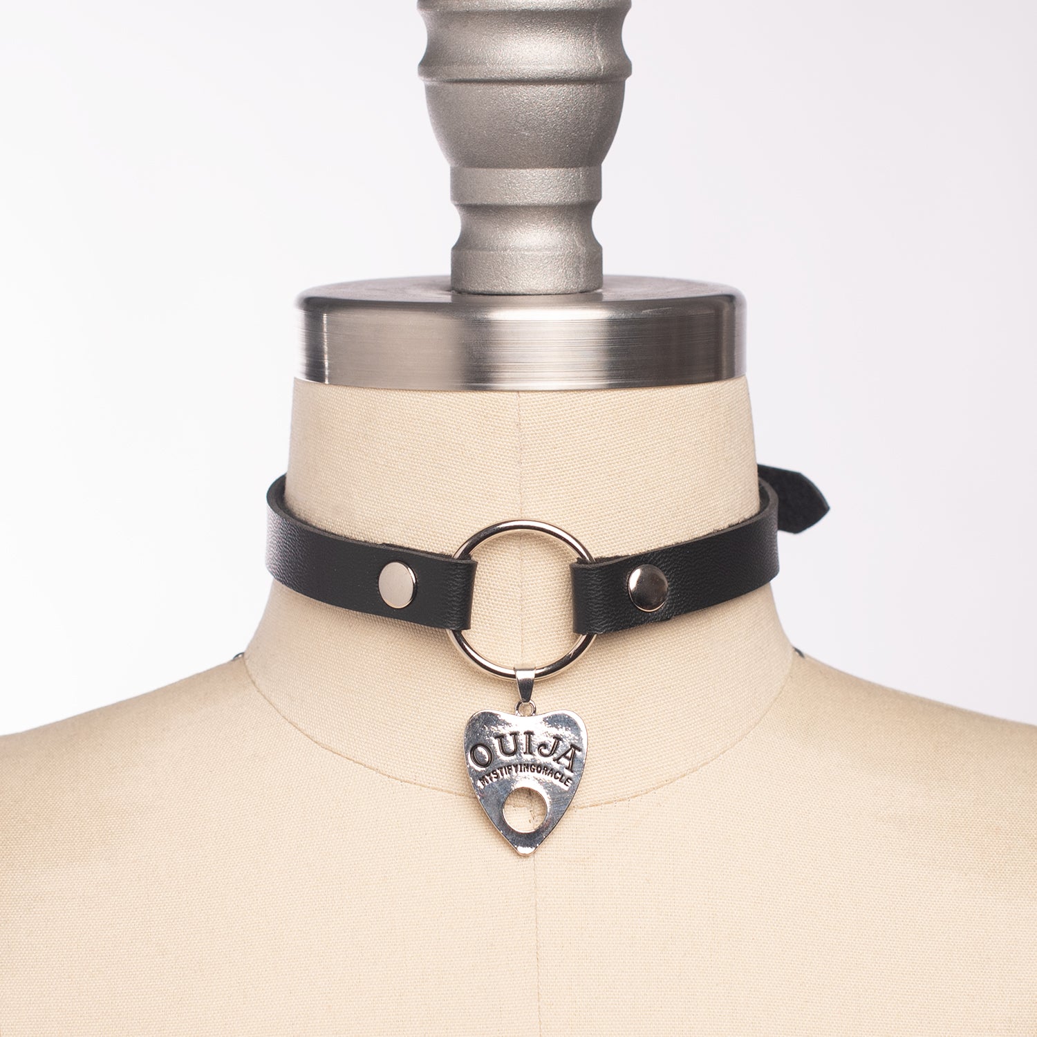 Delicate and slim choker in black or clear PVC, vegan leather, or leather. A silver ouija planchette charm adorns the center o-ring. Delicate and fancy!