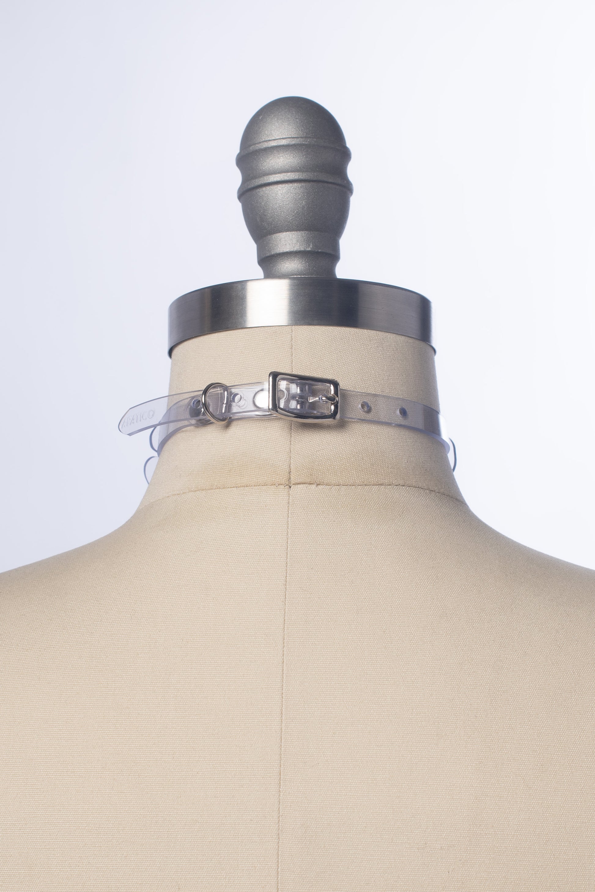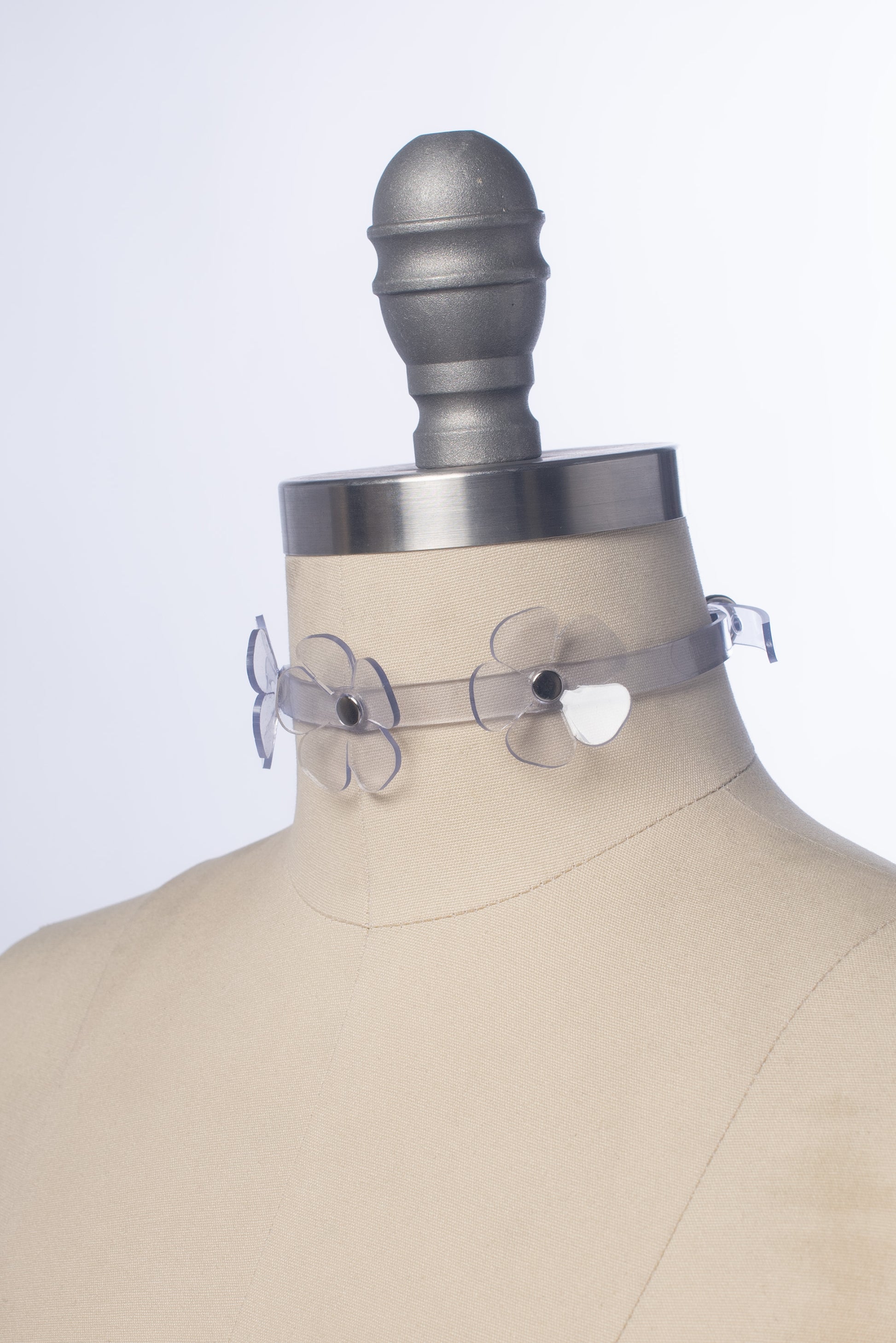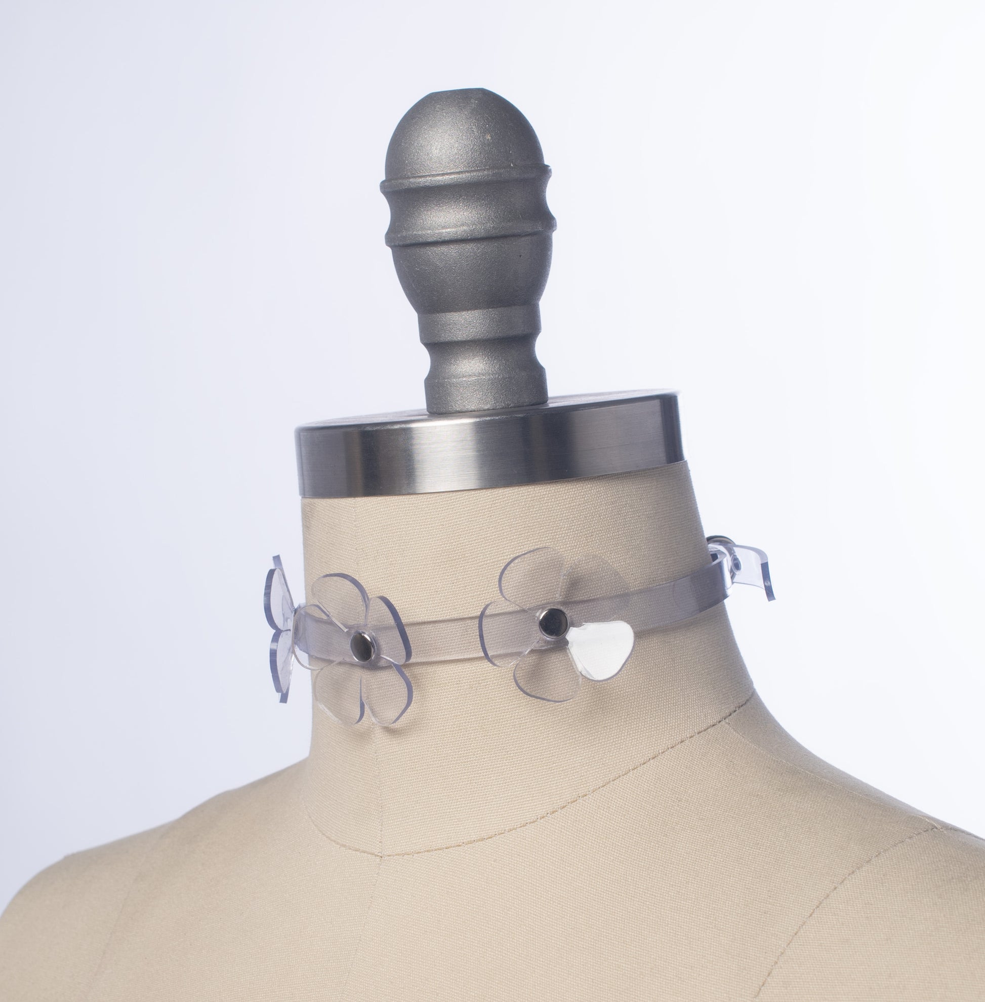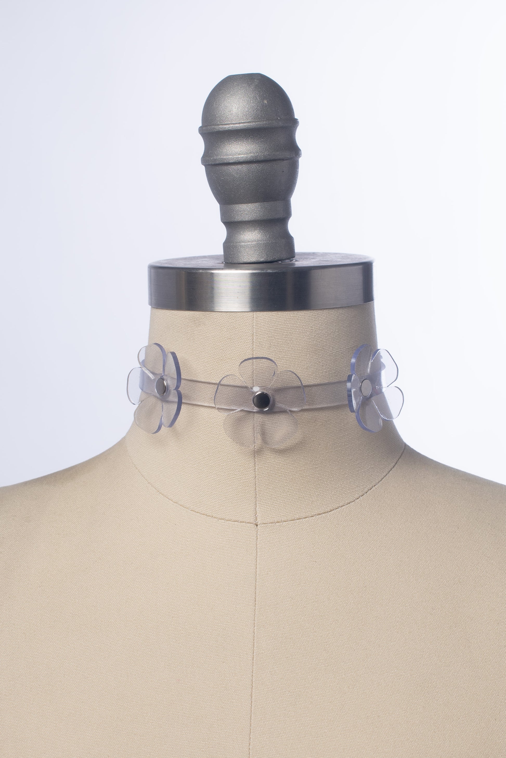 Delicate choker with a dimensional triple floral design in clear PVC. Inspired by wintery ice sculptures and glass flowers in fairytales. Fit is adjustable with buckle in back.