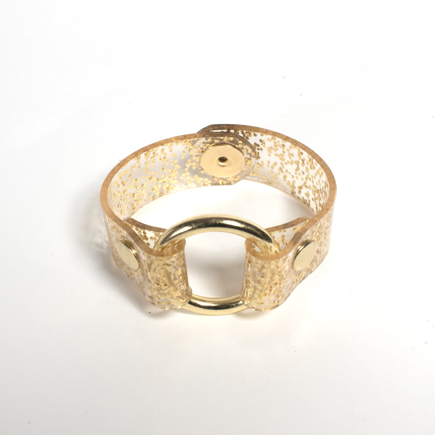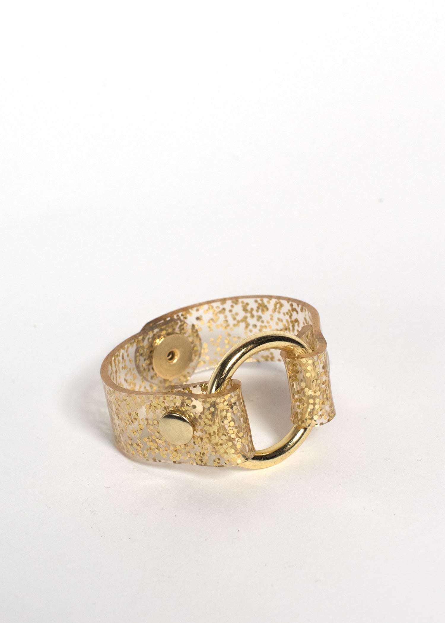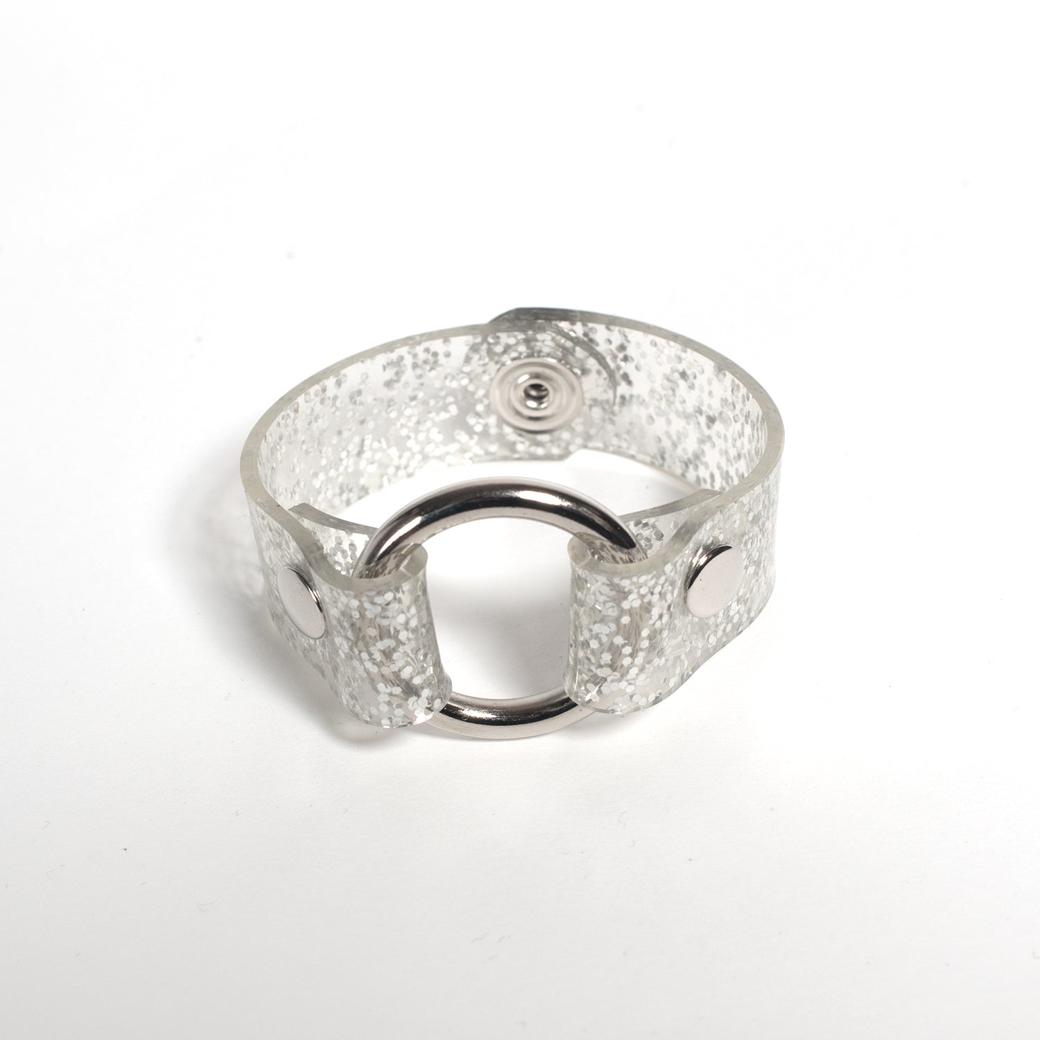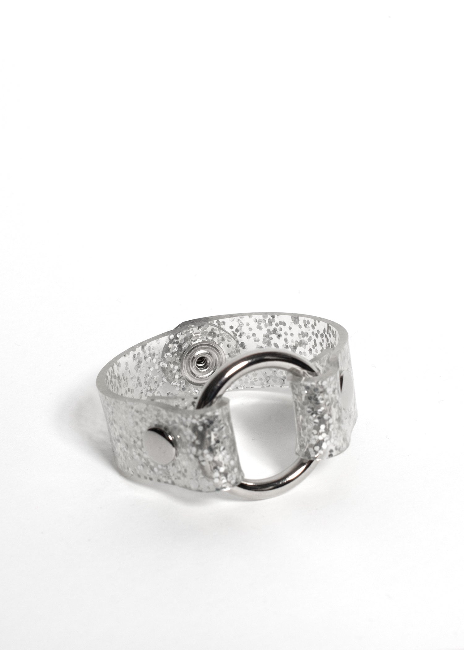 The Glitter O Ring Bracelet finishes off your holiday look with just the right amount of edge and sparkle, for days when you just want to add a hint of toughness. Available in gold or silver glitter PVC.