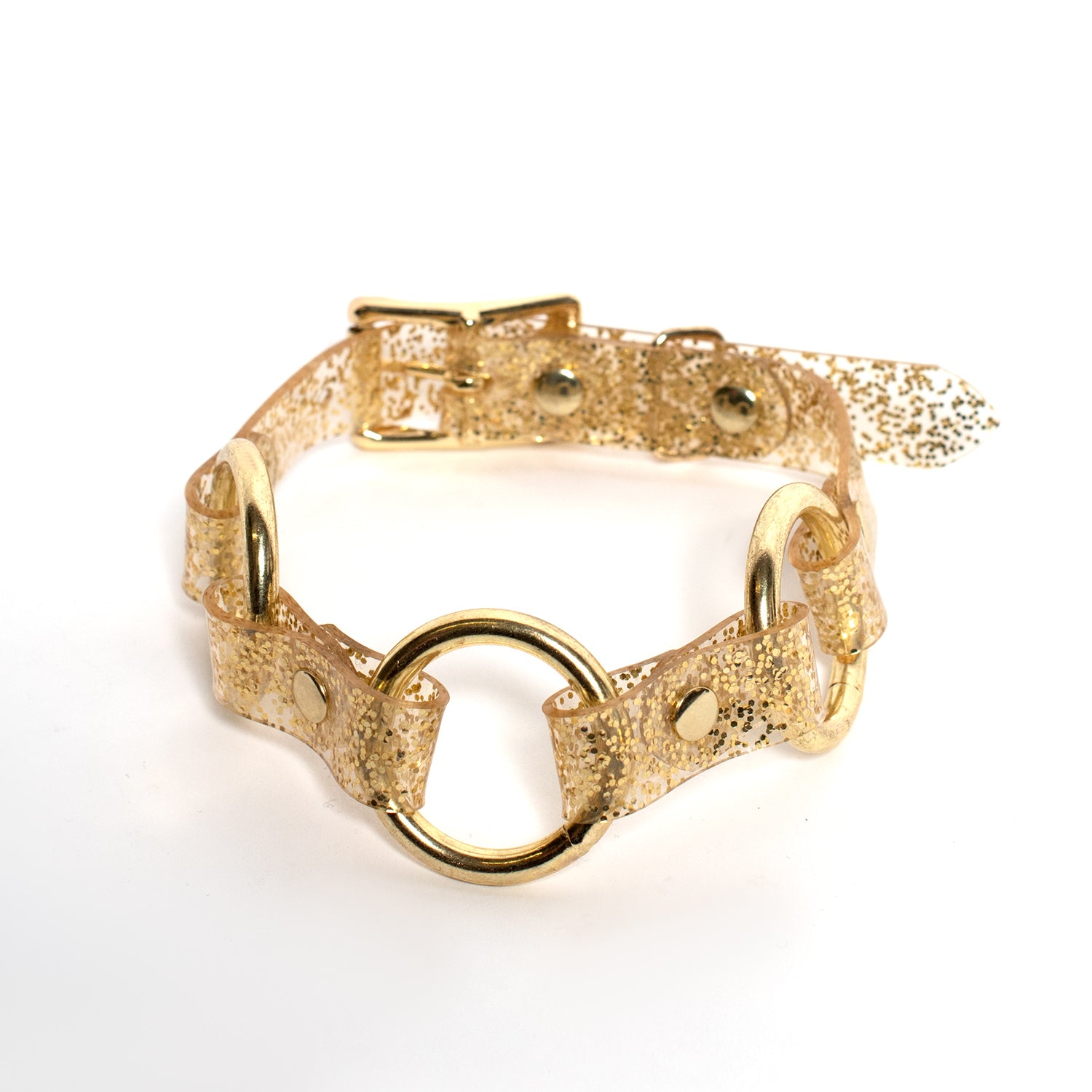 Linked o-ring choker in stunning metallic, glitter PVC. Three o rings are linked together by heavy duty o-rings. Buckles in back.