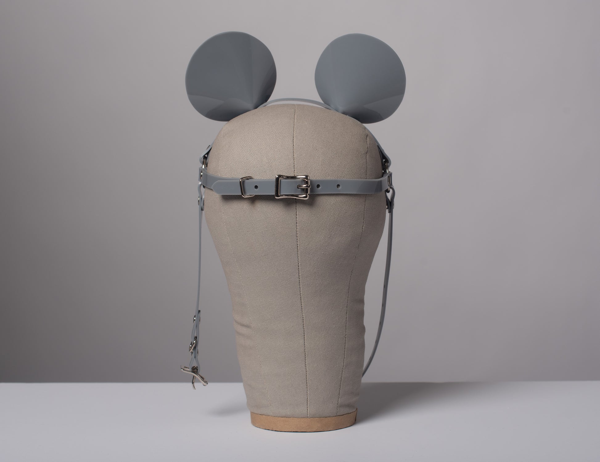 High quality, adorable mouse ears harness headpiece made in new gray opaque PVC. Fit is adjustable with buckle in back of head. Chin strap/buckle are detachable (snaps on and off with a heavy duty snap).