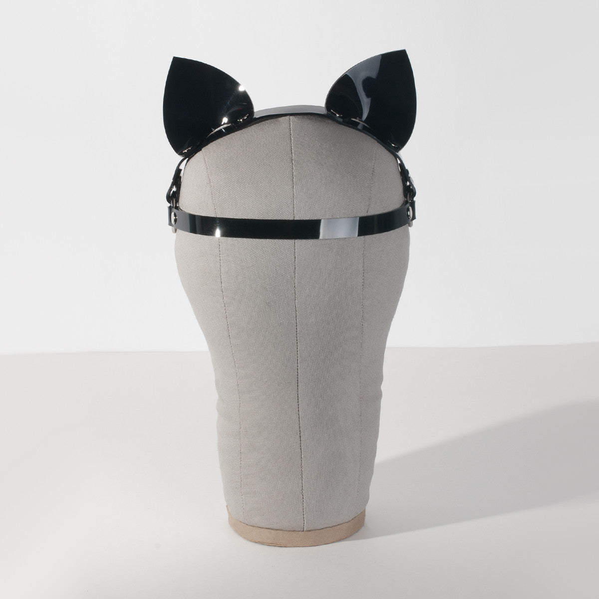 High quality, adorable kitty cat ears harness headpiece made in PVC, vegan leather, or leather. Fit is adjustable with buckle in back of head.