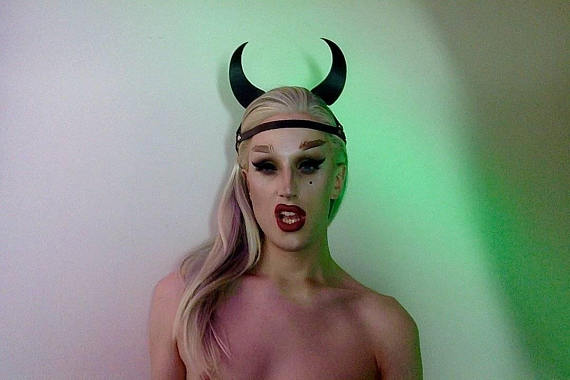 Make a statement in this harness headpiece with curved, spiked demon or devil horns. As seen on the ethereal and fabulous Max (RPDR Season 7) Handmade in PVC, leather, or vegan leather. Fit is adjustable with buckles in back of head and under chin.