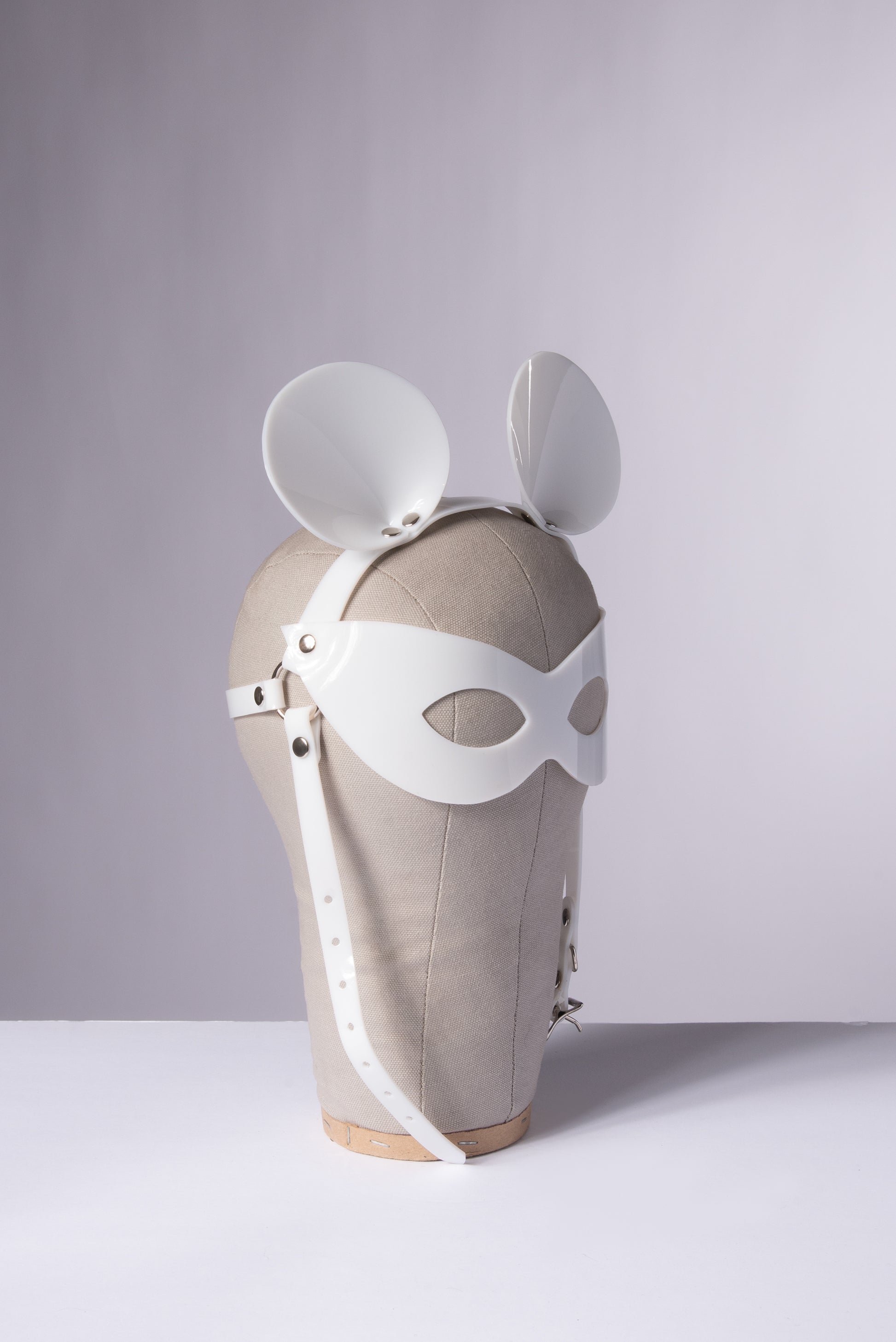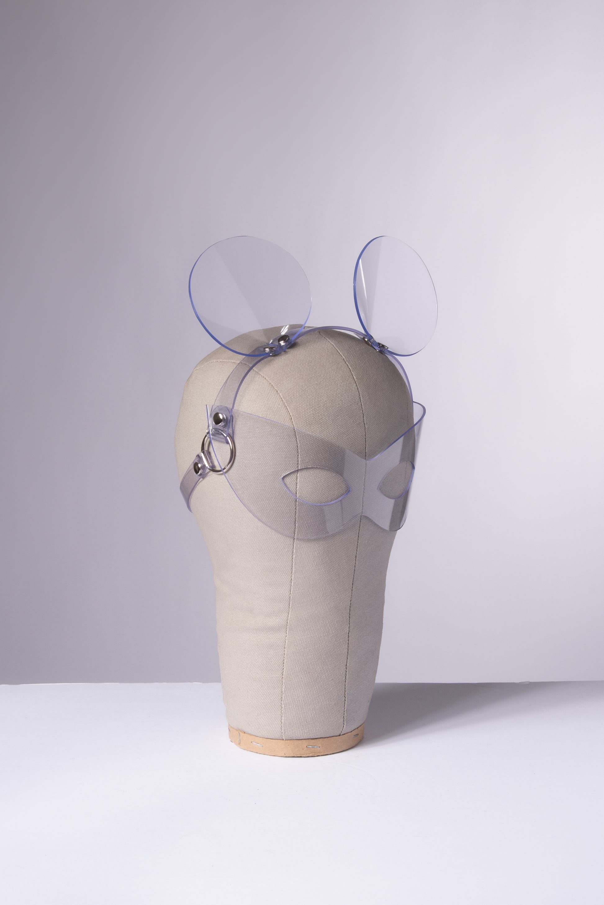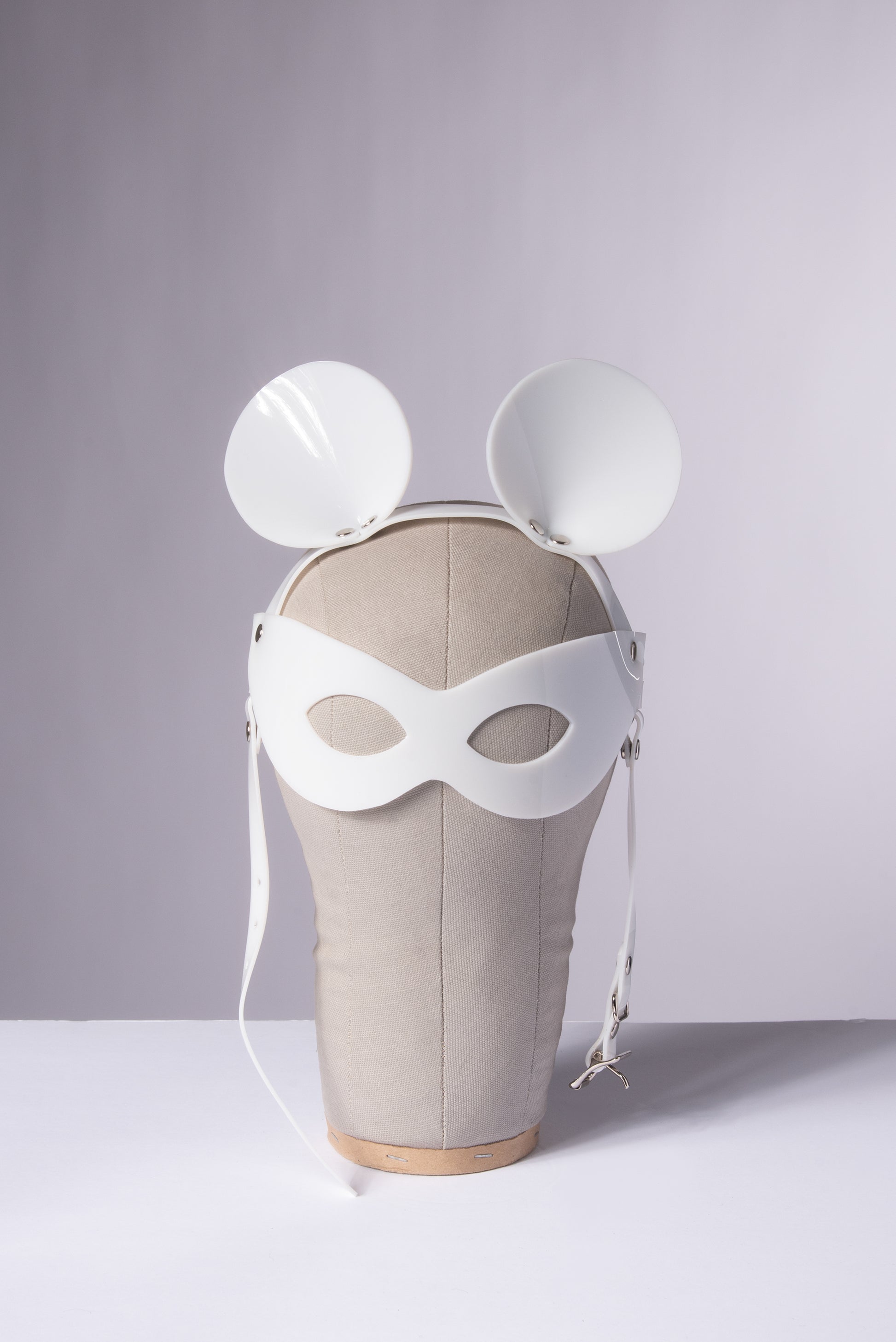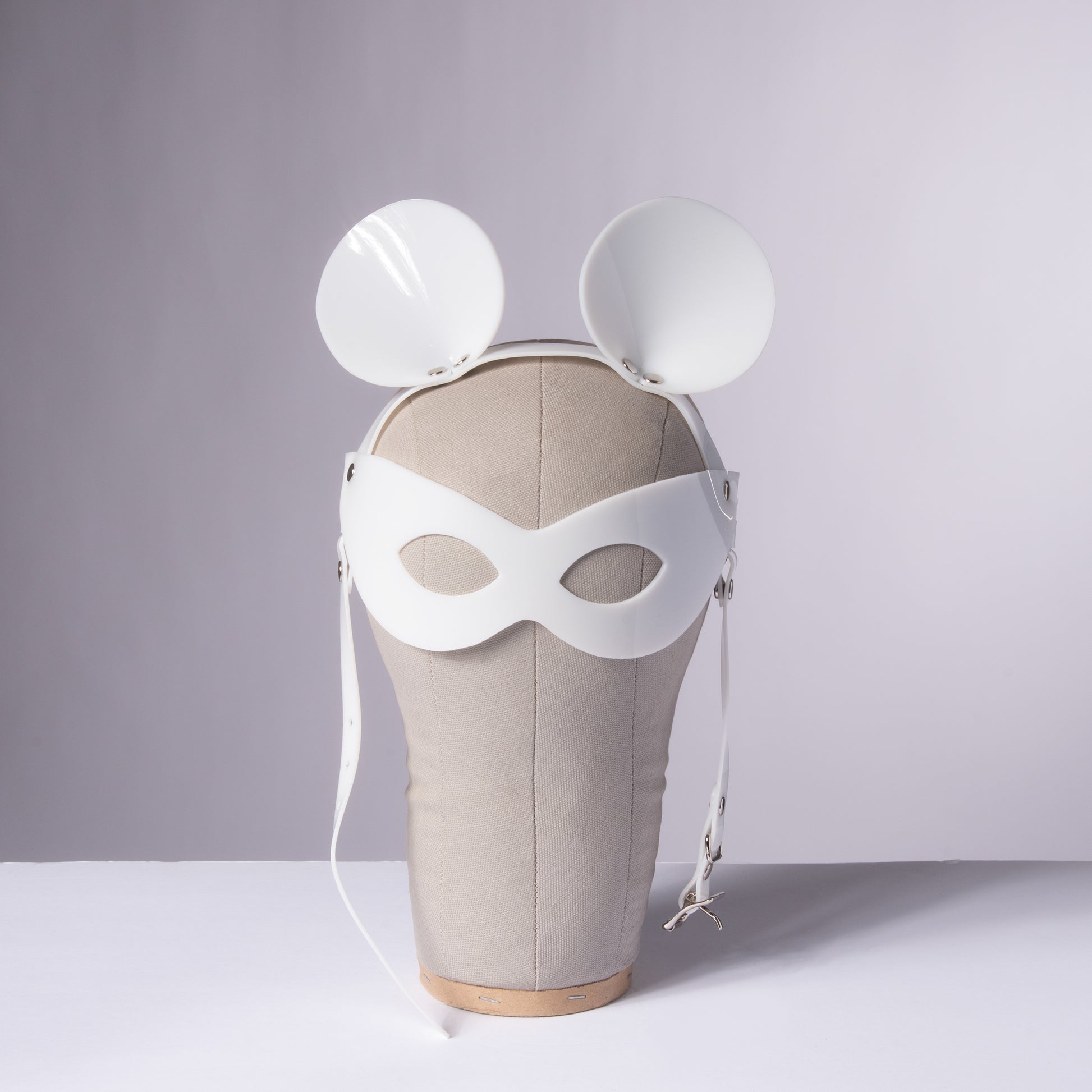 High quality, adorable mouse ears harness mask headpiece made in thick PVC, leather, or black vegan leather. Fit is adjustable with buckle in back of head.