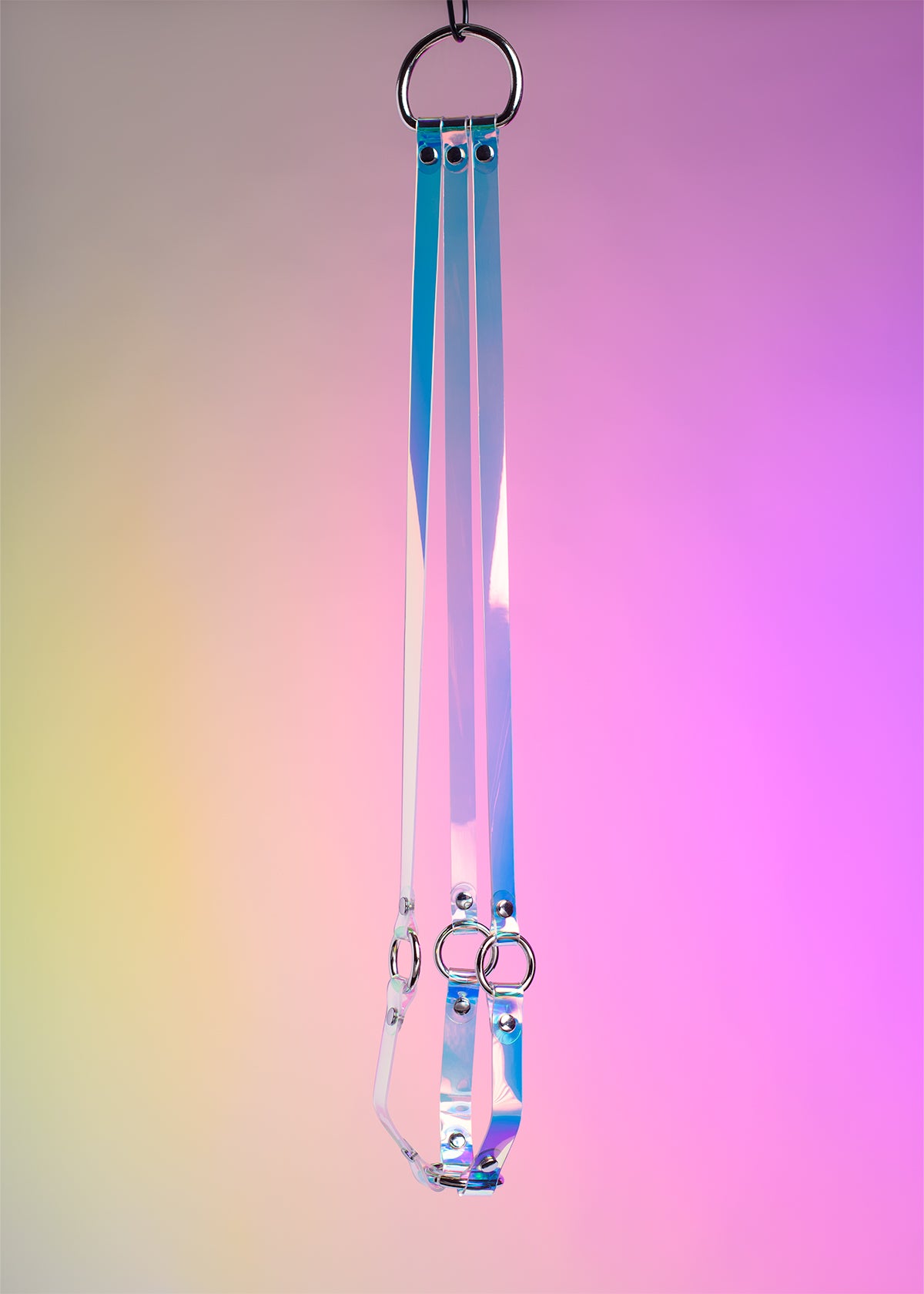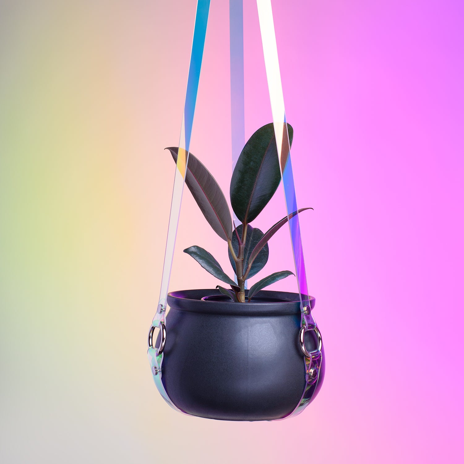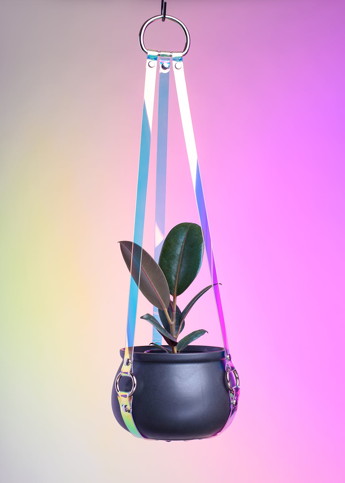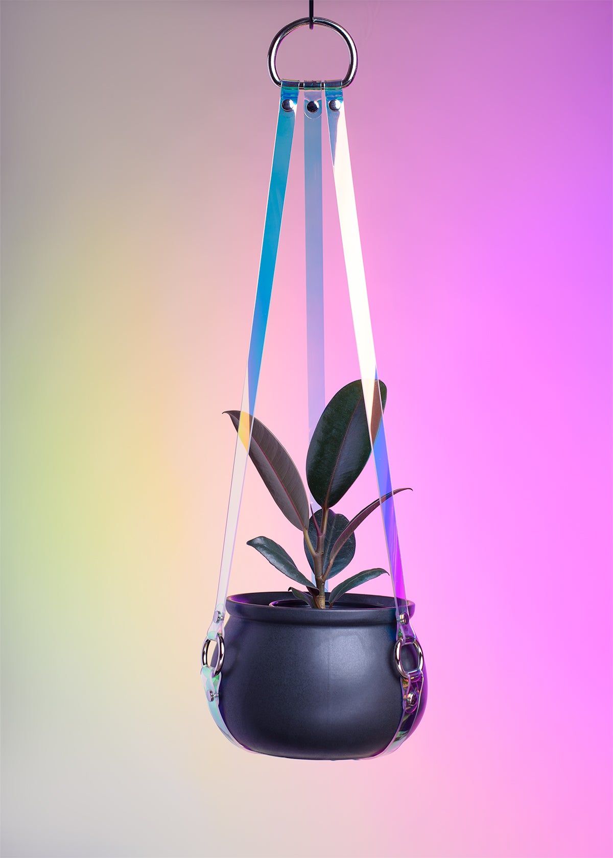 This plant hanger is designed with harness aesthetics, yet is still simple and sleek enough to let the plant steal the show. Iridescent, holographic 2mm thick PVC in "blue" has a cool color shift and adds a lovely, prismatic touch to any room.