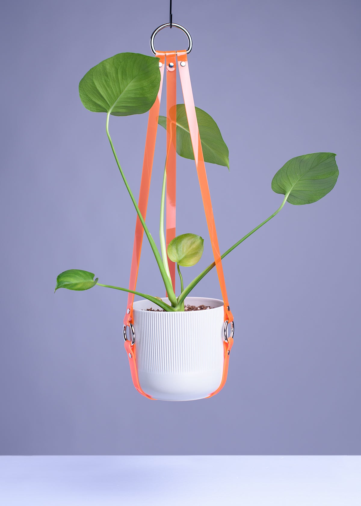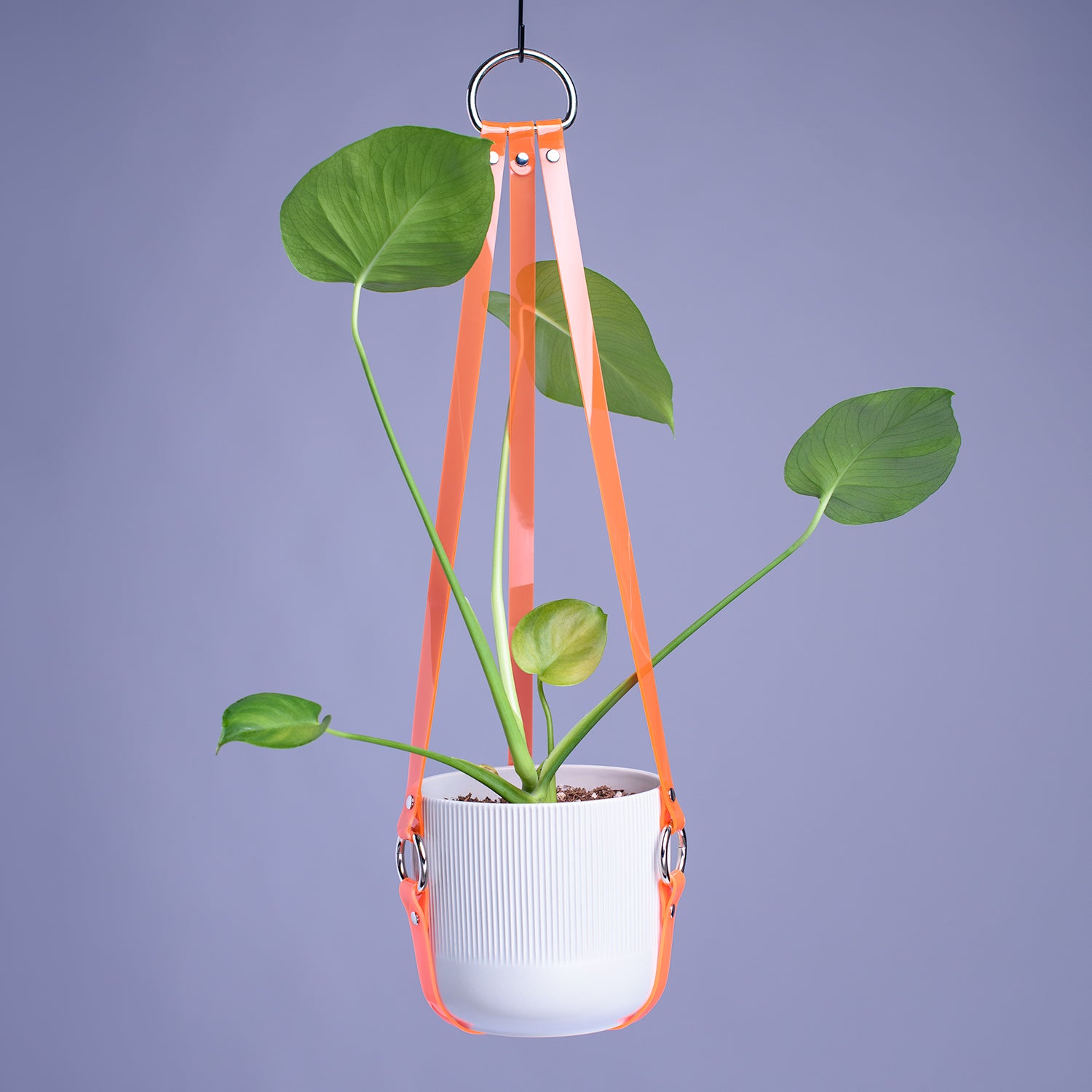 This plant hanger is designed with harness aesthetics, yet is still simple and sleek enough to let the plant steal the show. Transparent neon orange 2mm thick PVC edges up the decor in every room. This orange is UV and glows in black lights!