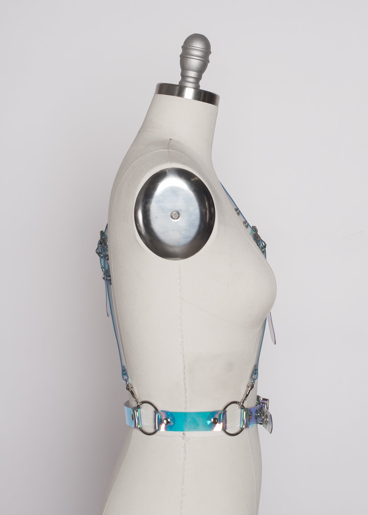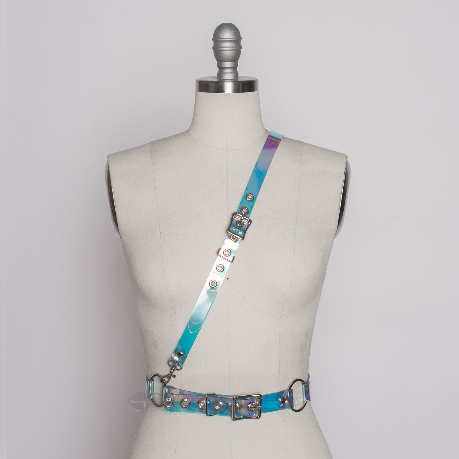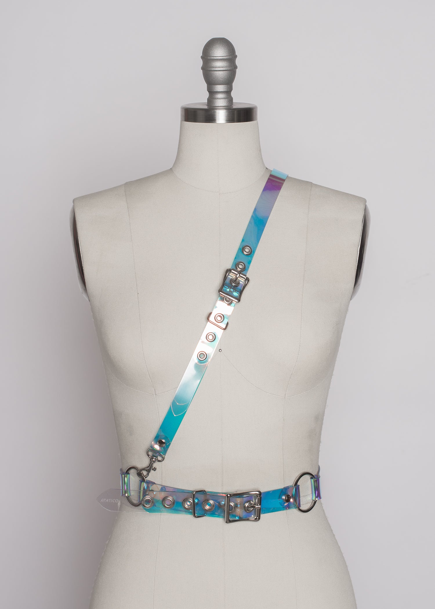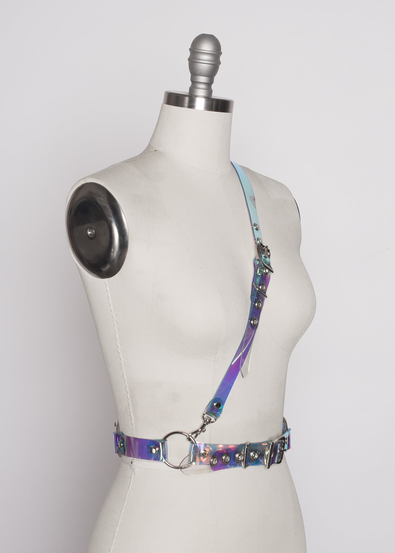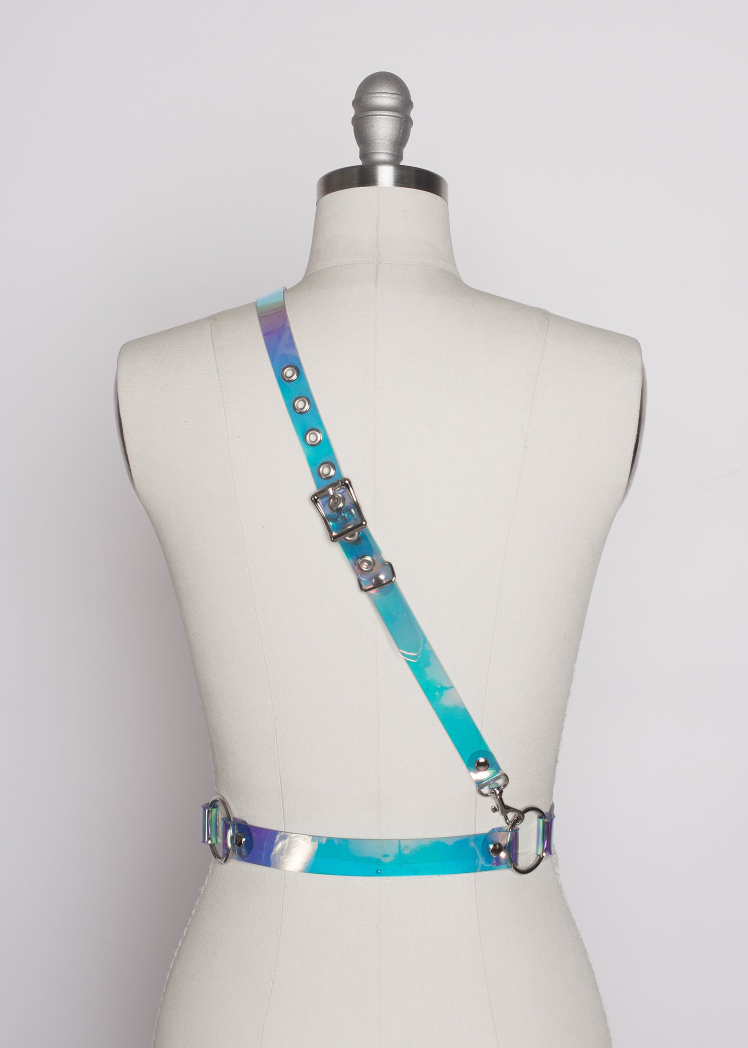The Holographic Bandolier Harness is a minimalistic, military inspired belt with a detachable, asymmetrical shoulder strap. The belt features 4 o-rings so you can attach the strap any way you like. Iridescent PVC sparkles and shines with all the colors of the rainbow and adds the perfect, eye-catching pop of color to any outfit.