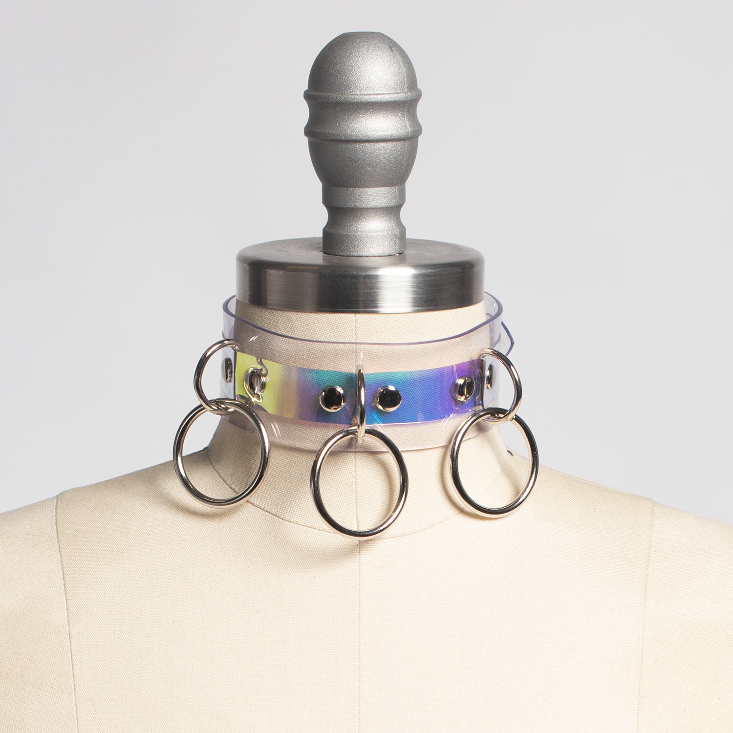 As seen in Teen Vogue June/July 2016 issue, now available with holographic iridescent PVC! This magical color shifting vinyl is layered over clear.