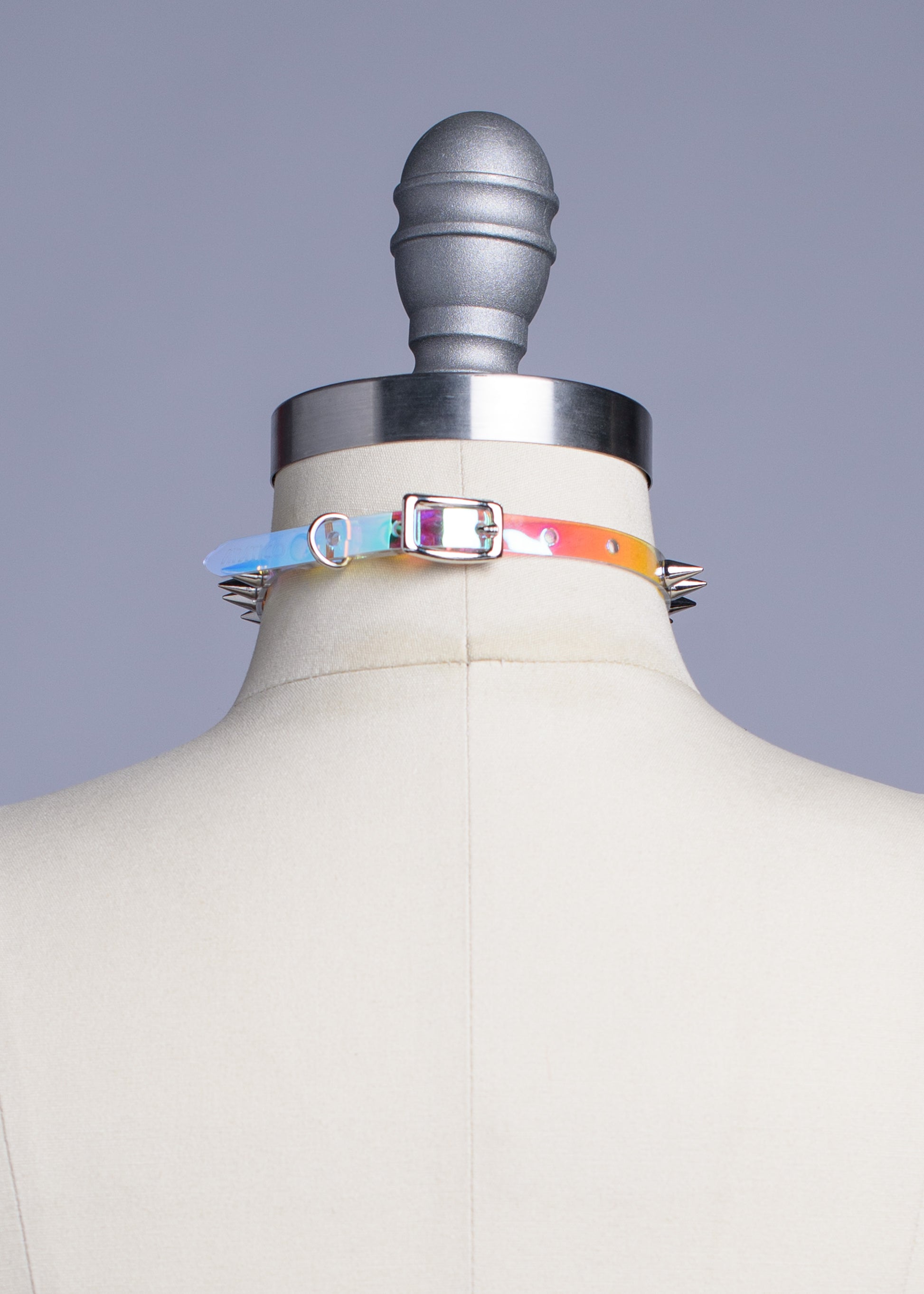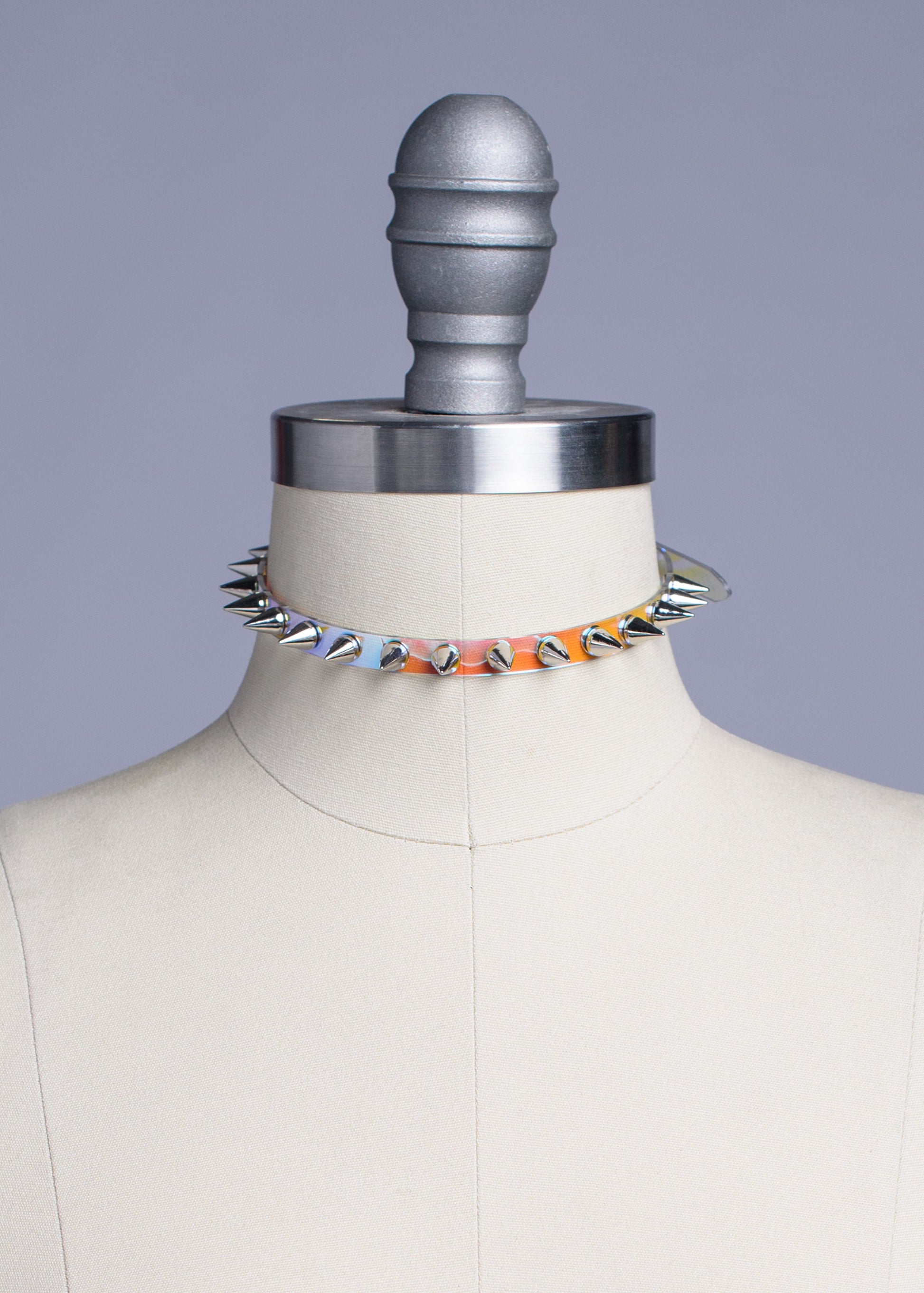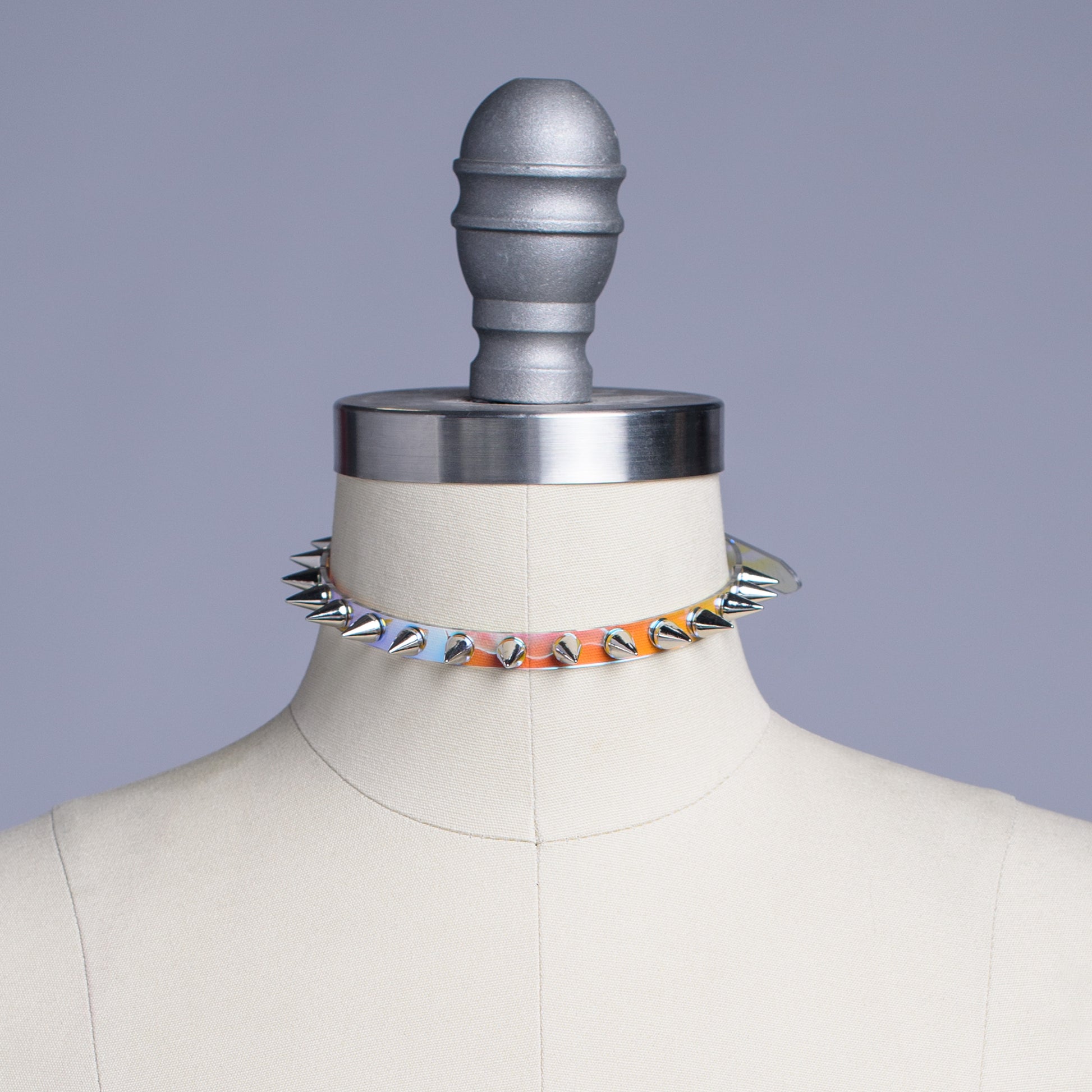 The tiniest, iridescent PVC version of the spiked classic choker collar with silver 9mm spikes attached evenly throughout. Adjustable buckle in back. An essential item for any goth or punk who also love a little color.