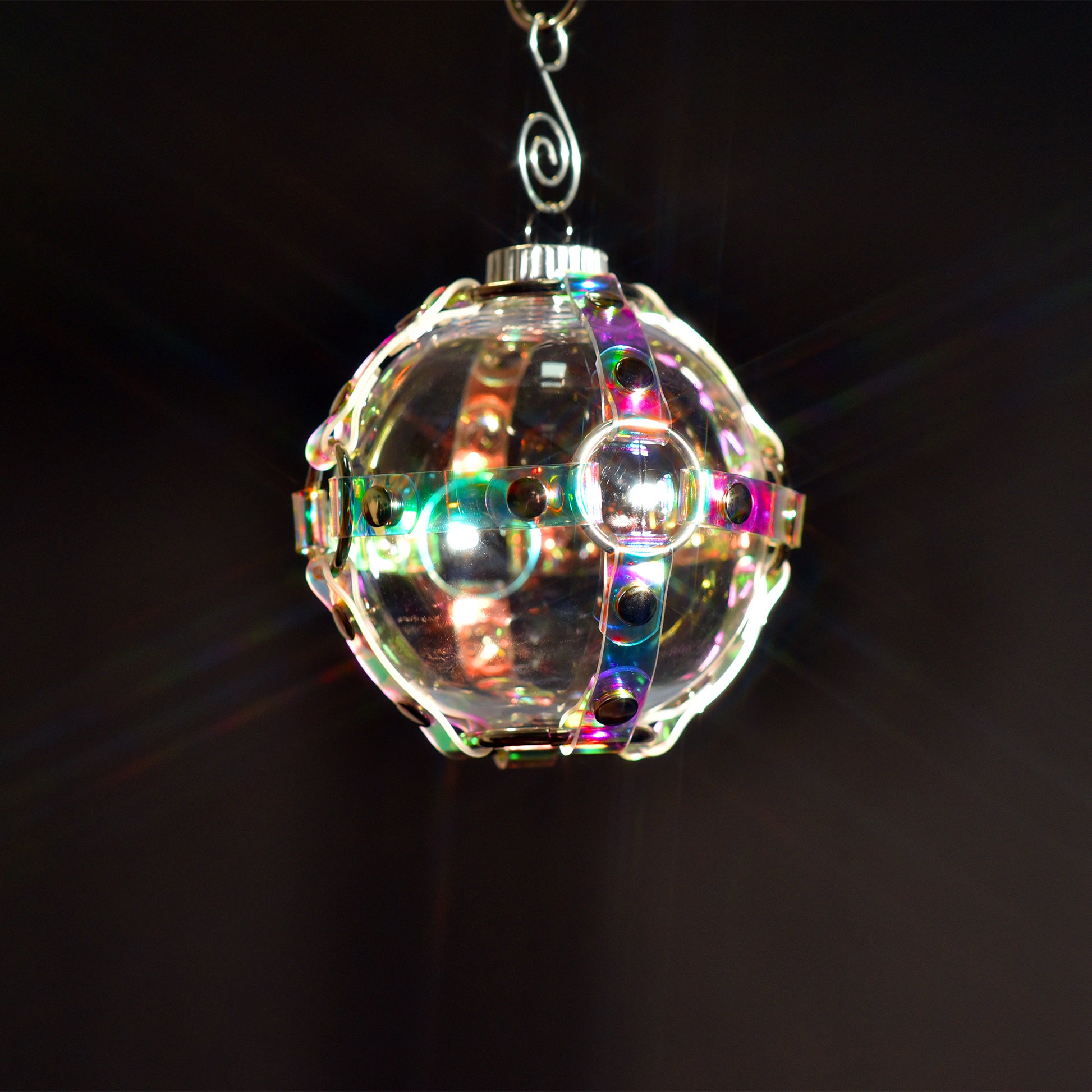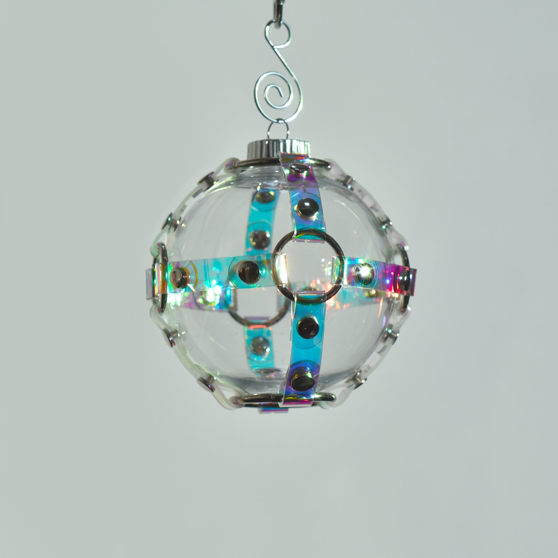 Put a harness on all the things! These harness ornaments are the perfect way to sass up and goth out a holiday tree. Clear 100mm wide globes are adorned with iridescent, holographic rainbow pvc harness cages. Scroll ornament hanger included.