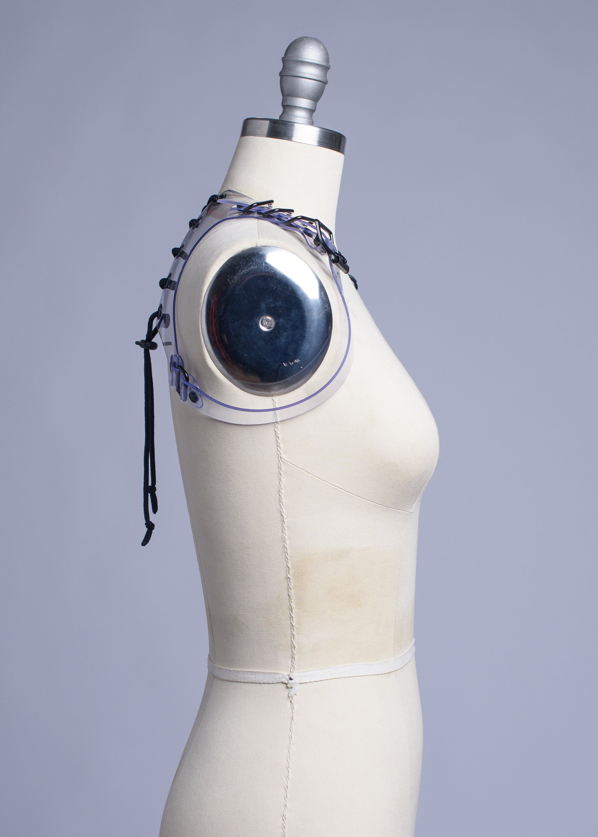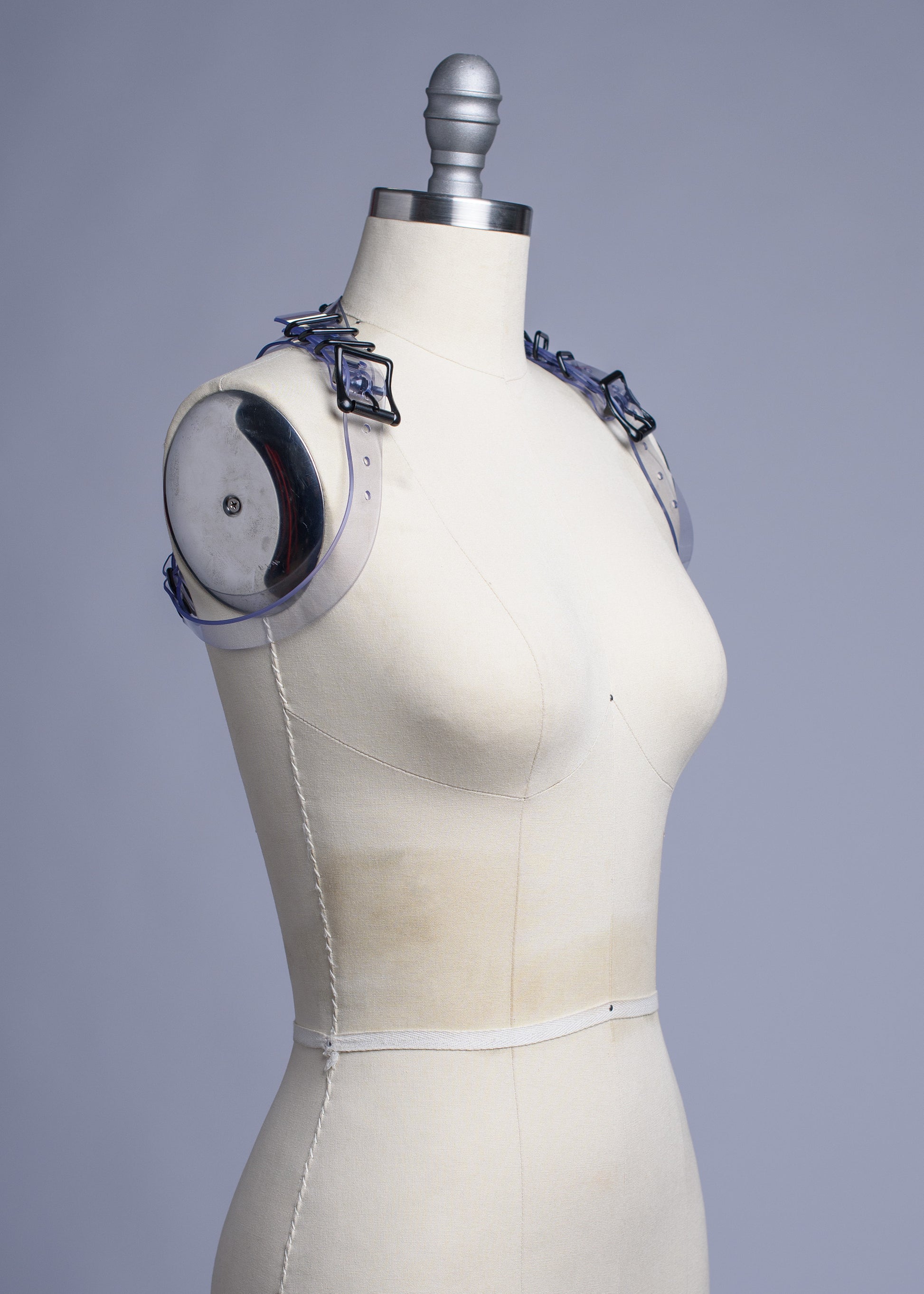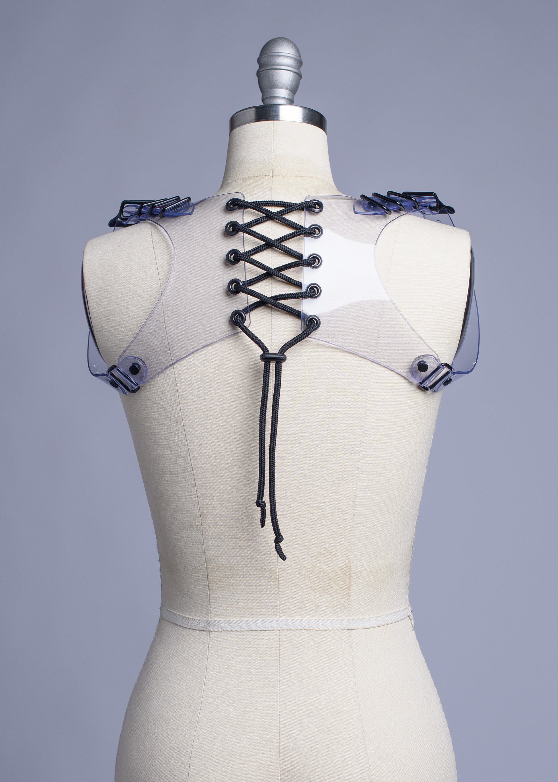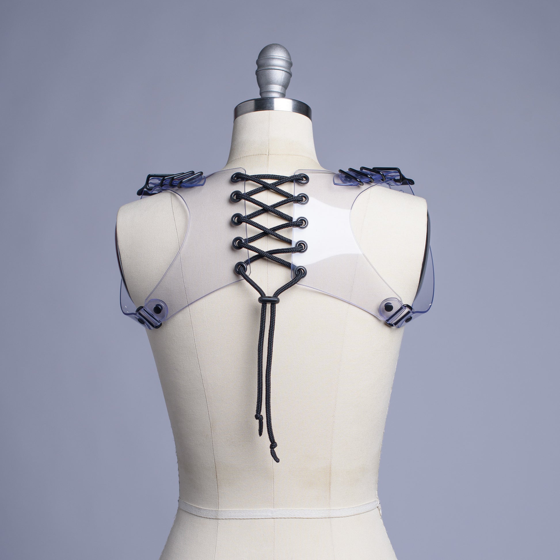 This shoulder harness vest is made of clear PVC. All black hardware. Shoulder straps buckle at the shoulders. Laces up in back with black nylon cord which adds another layer of adjustability and visual interest.