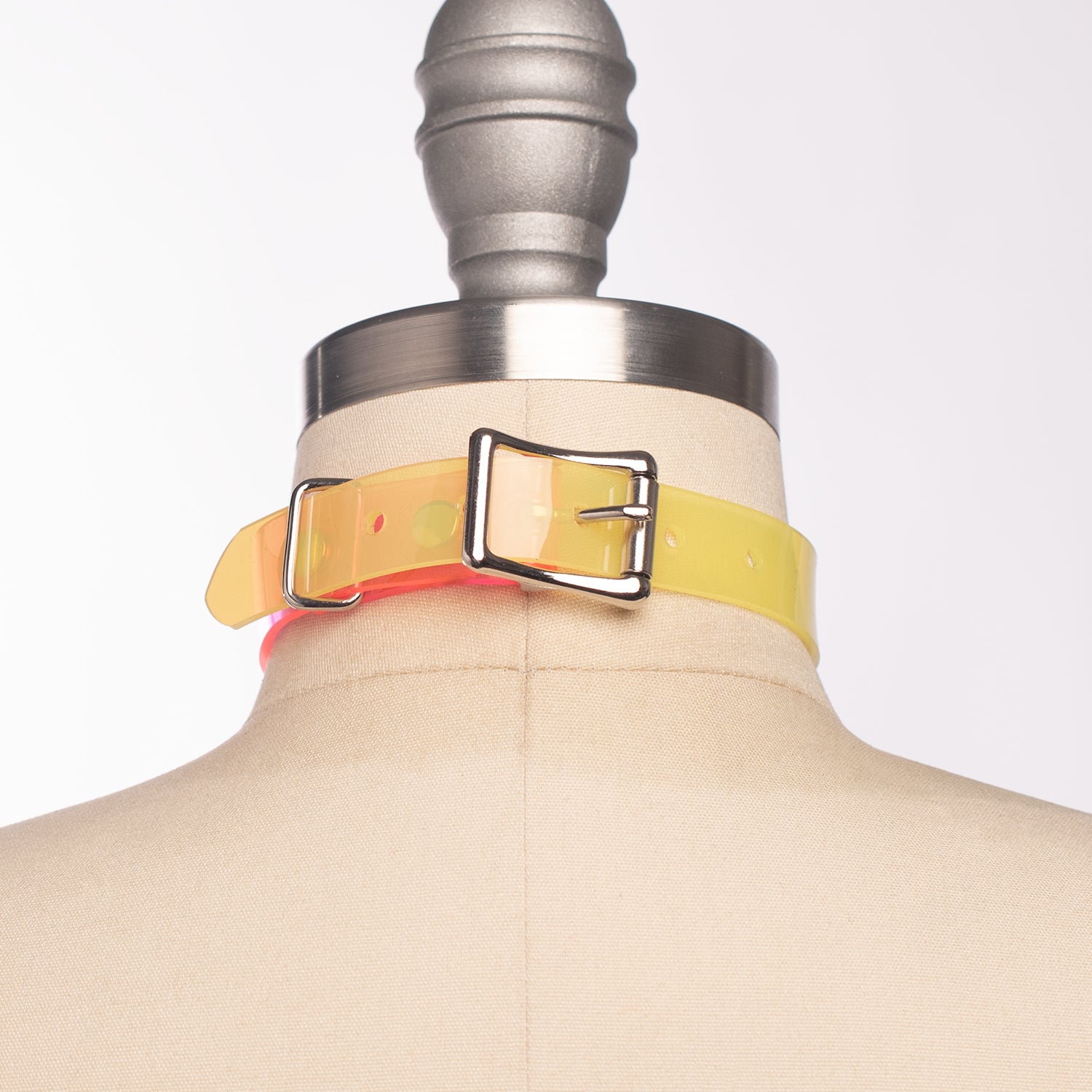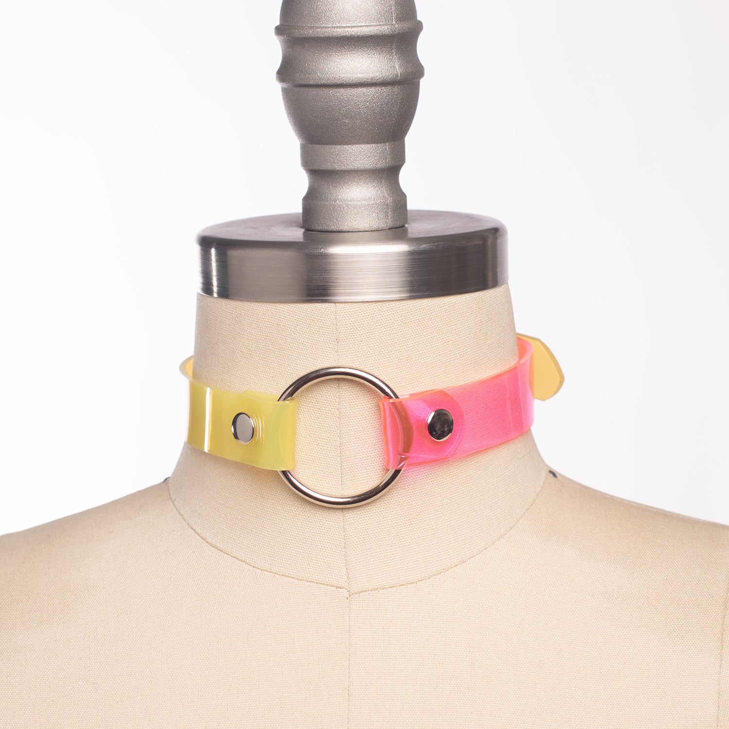 Classic o-ring collar in two different colors - lush lemon yellow and transparent uv pink PVC. Fit is adjustable with buckle.