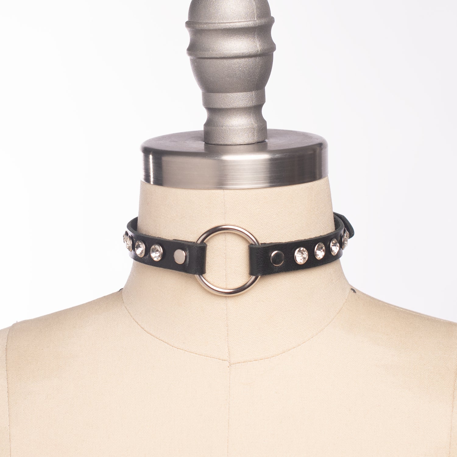 Delicate and slim choker in black PVC, vegan leather, or leather. Sparkling crystals frame an o-ring center for an elegant take on the classic collar design.