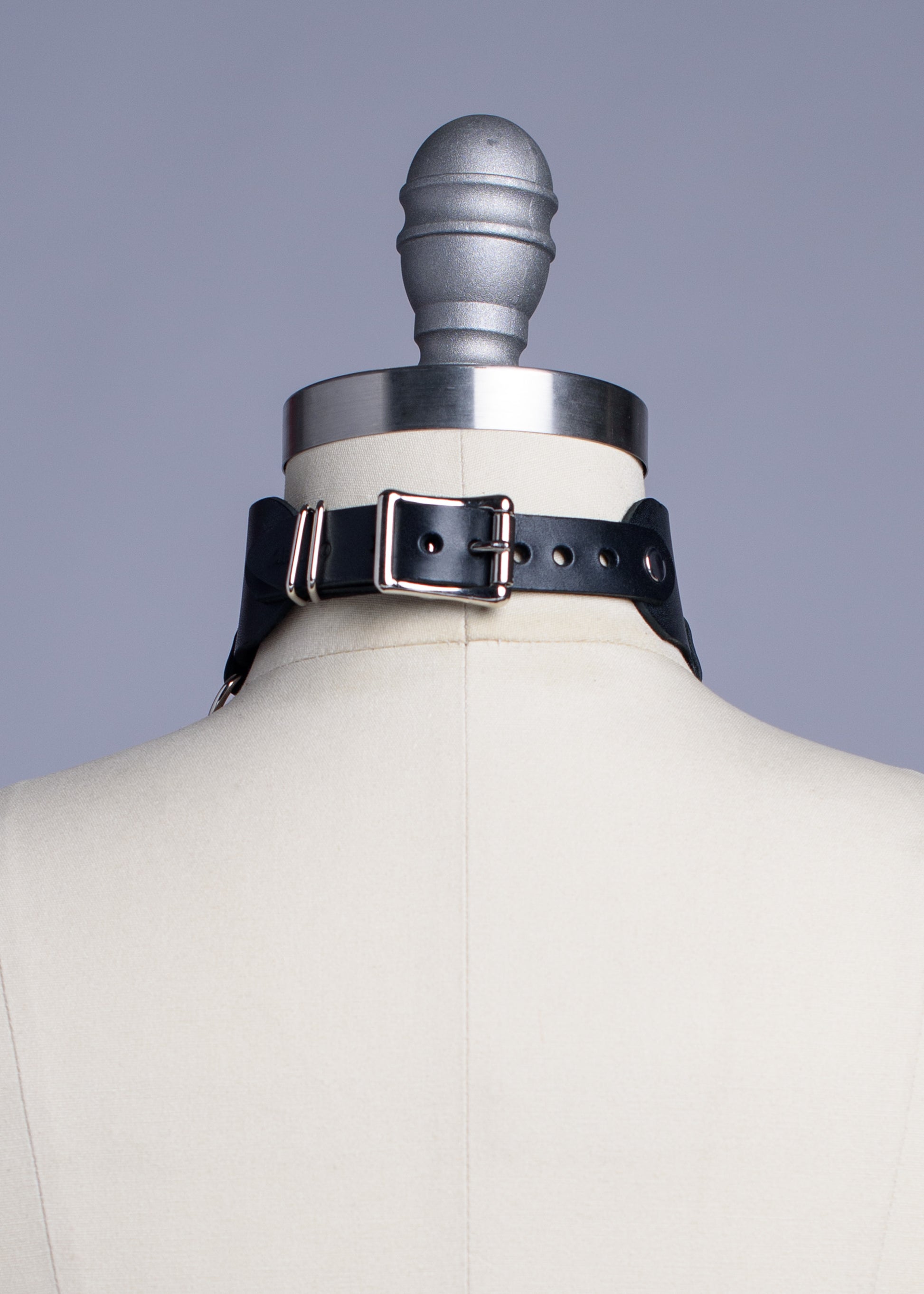 Shown in Black Leather. Also available in black vegan leather and PVC.