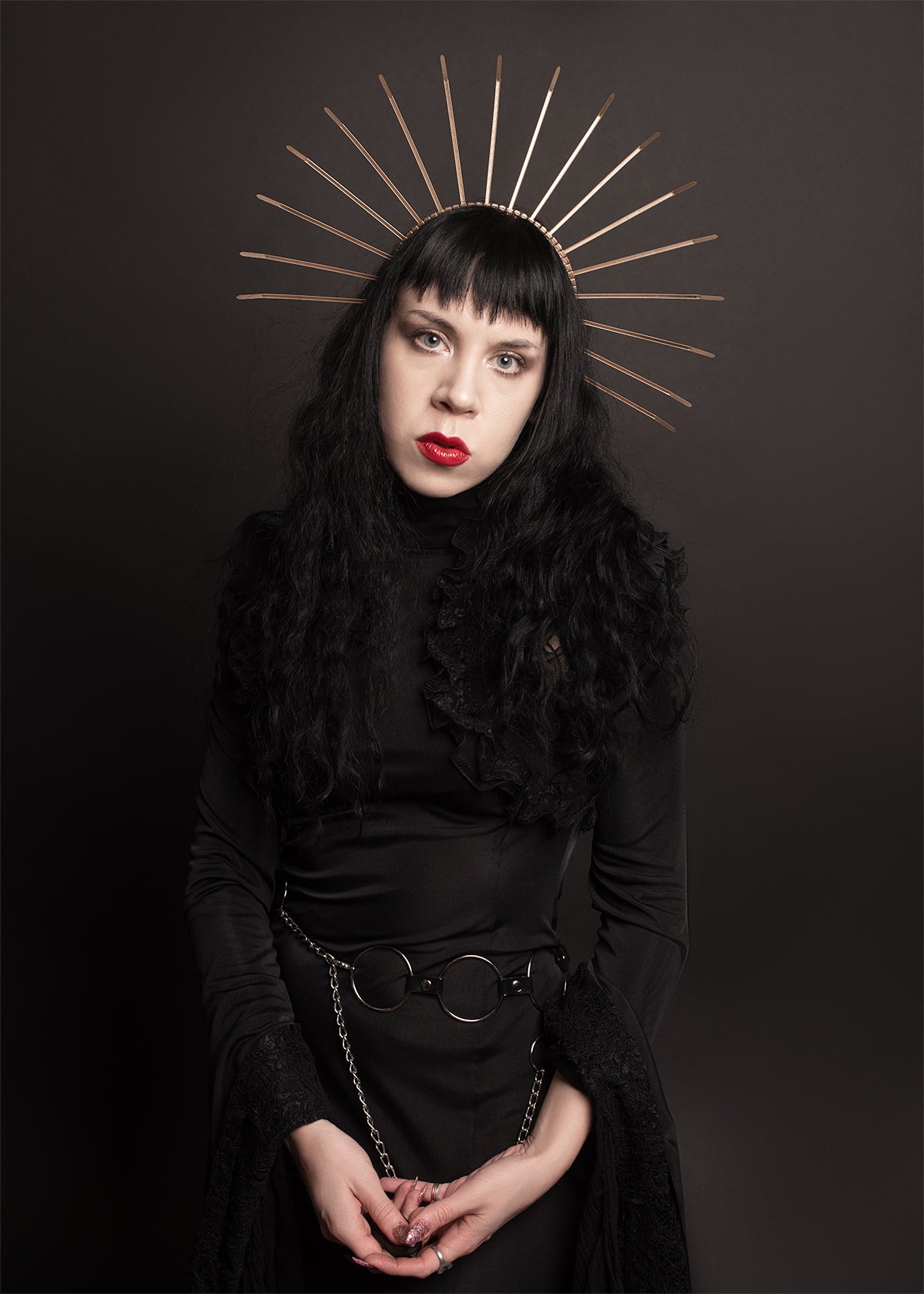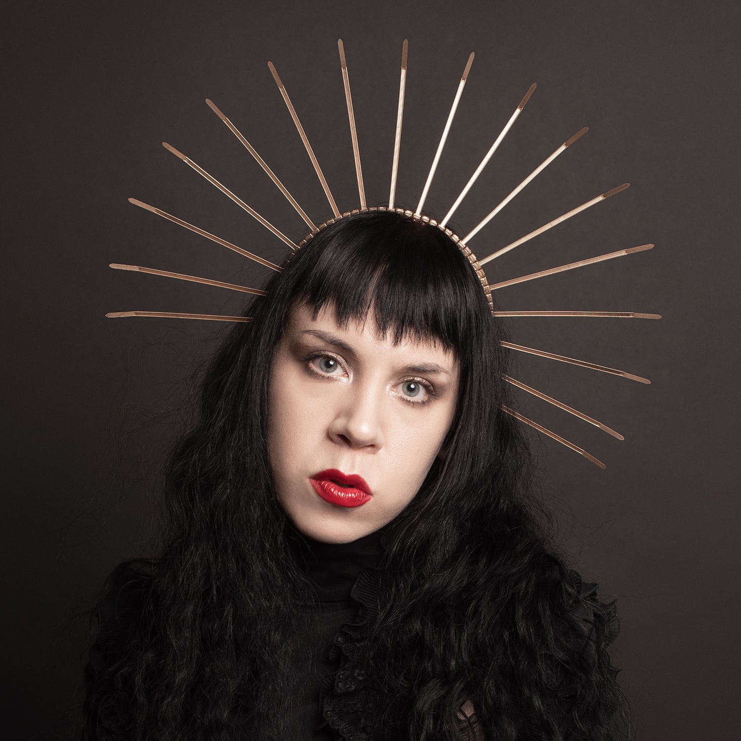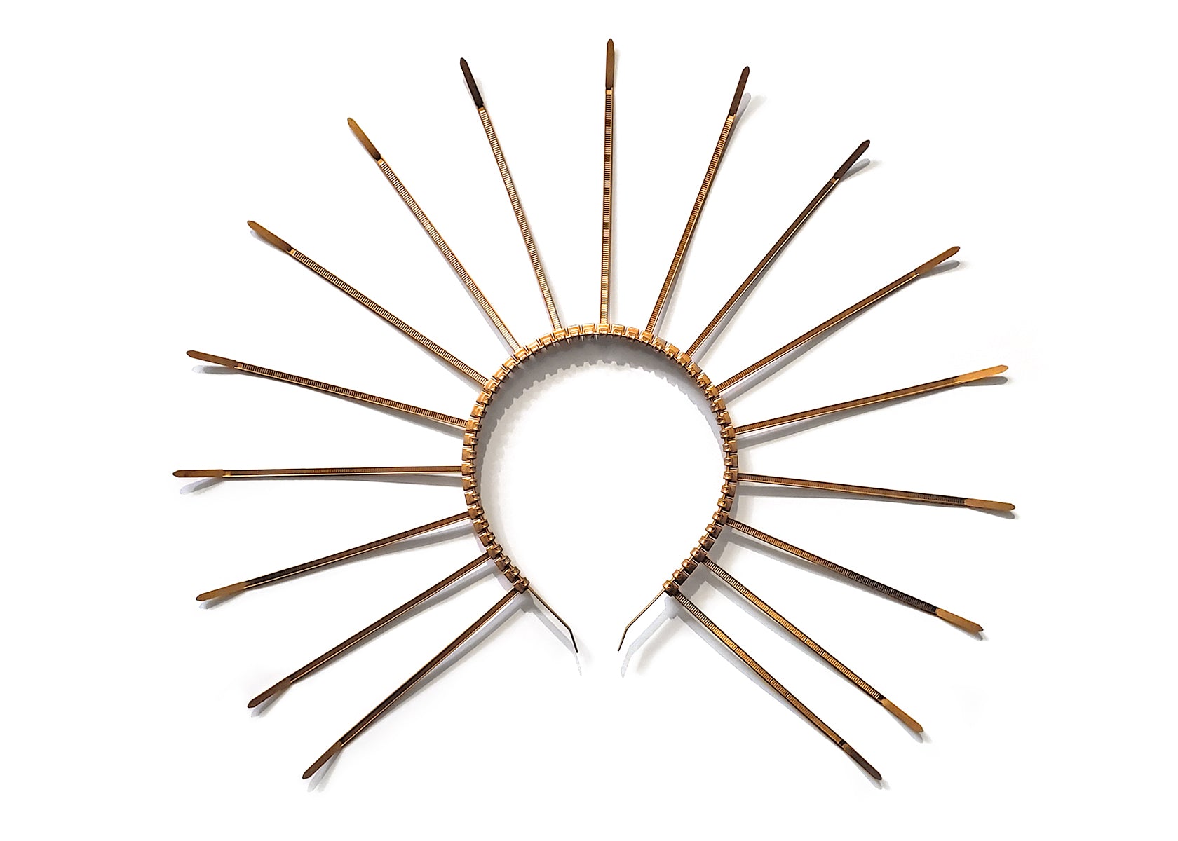 Inspired by classic images of the Virgin Mary in Catholic art and imagery and Dia De Los Muertos, angels, saints, the Monica Crown is a striking spiked headband crown made of perfectly spaced, hand painted plastic zip ties on a slim metal headband. Worn alone or paired with a floral headdress or veil, this avant garde headpiece is a unique statement piece. Available in many colors, including black and gold (shown).