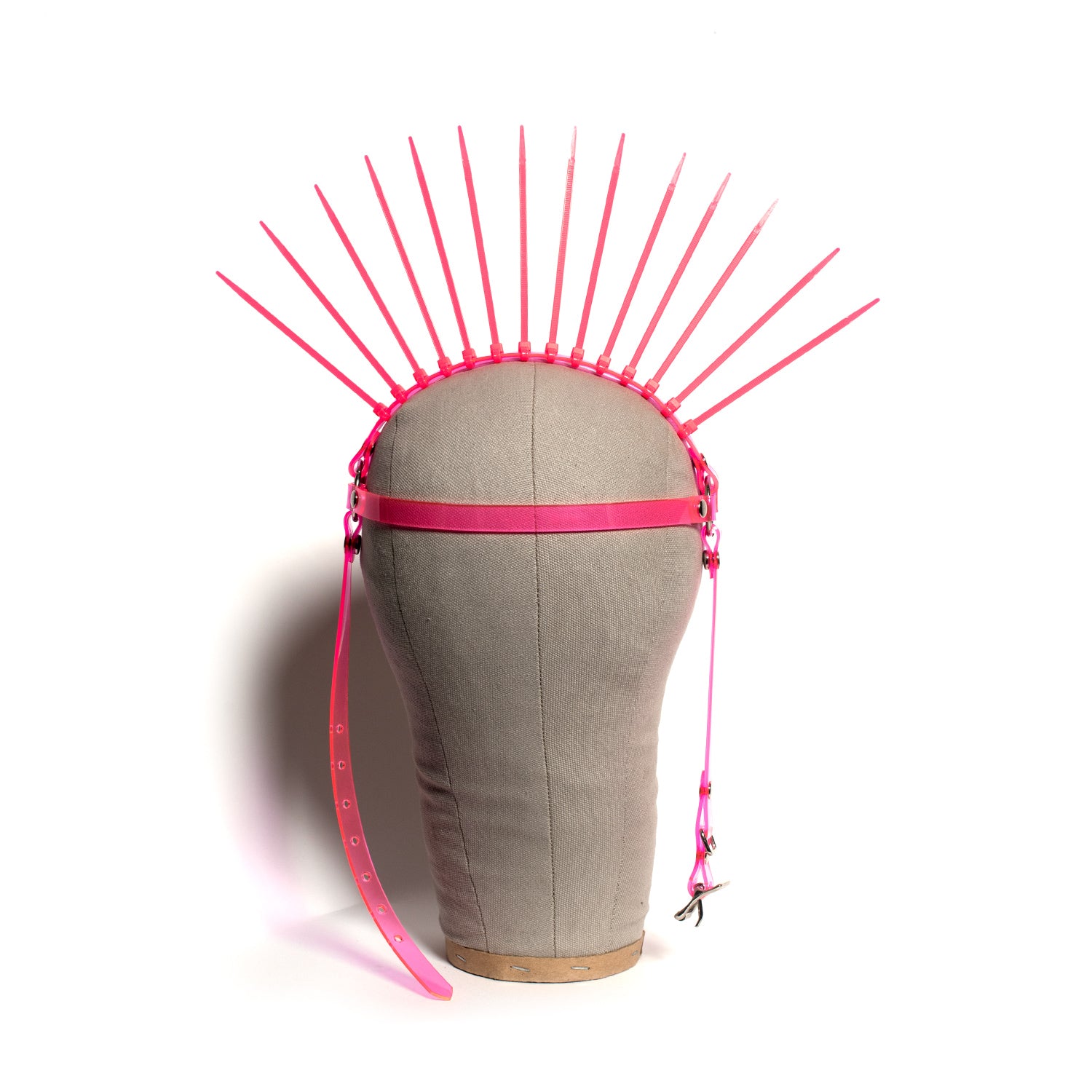 This UV-reactive, neon version of the spiked Metropolis Harness Headpiece is a striking combination of our popular Metropolis Crown and harness headpieces. The result is a killer look that's part cyberpunk, part art deco villainess.