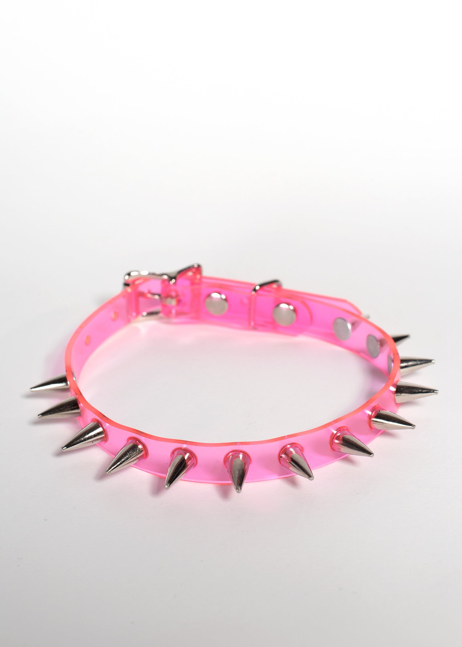 Classic choker collar with a colorful twist. Silver 1/2" spikes riveted evenly throughout. Adjustable buckle in back. Available in PVC, leather, or vegan leather. An essential item for any goth or punk who likes a little bit of color, festival or clubkids-inspired looks.