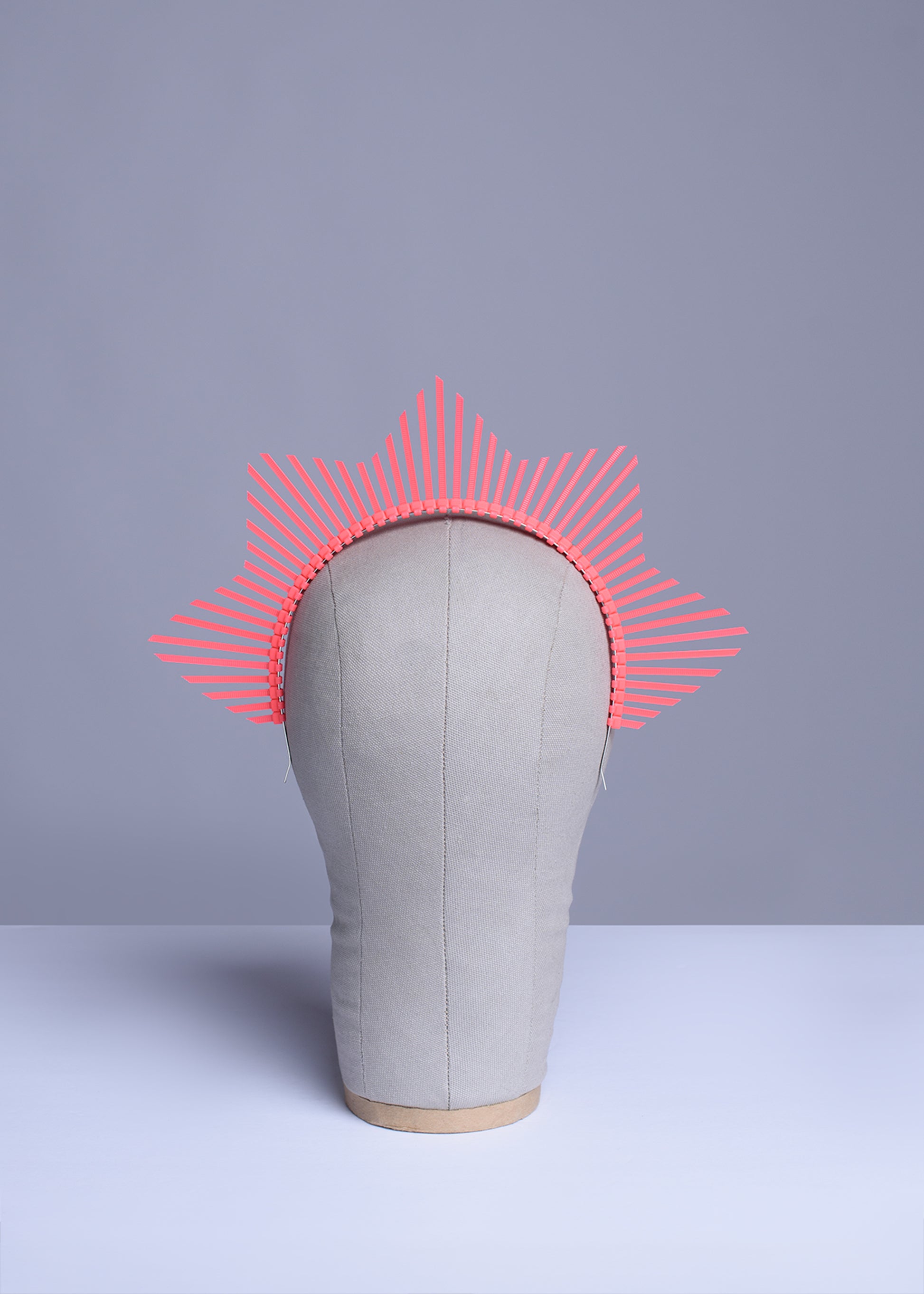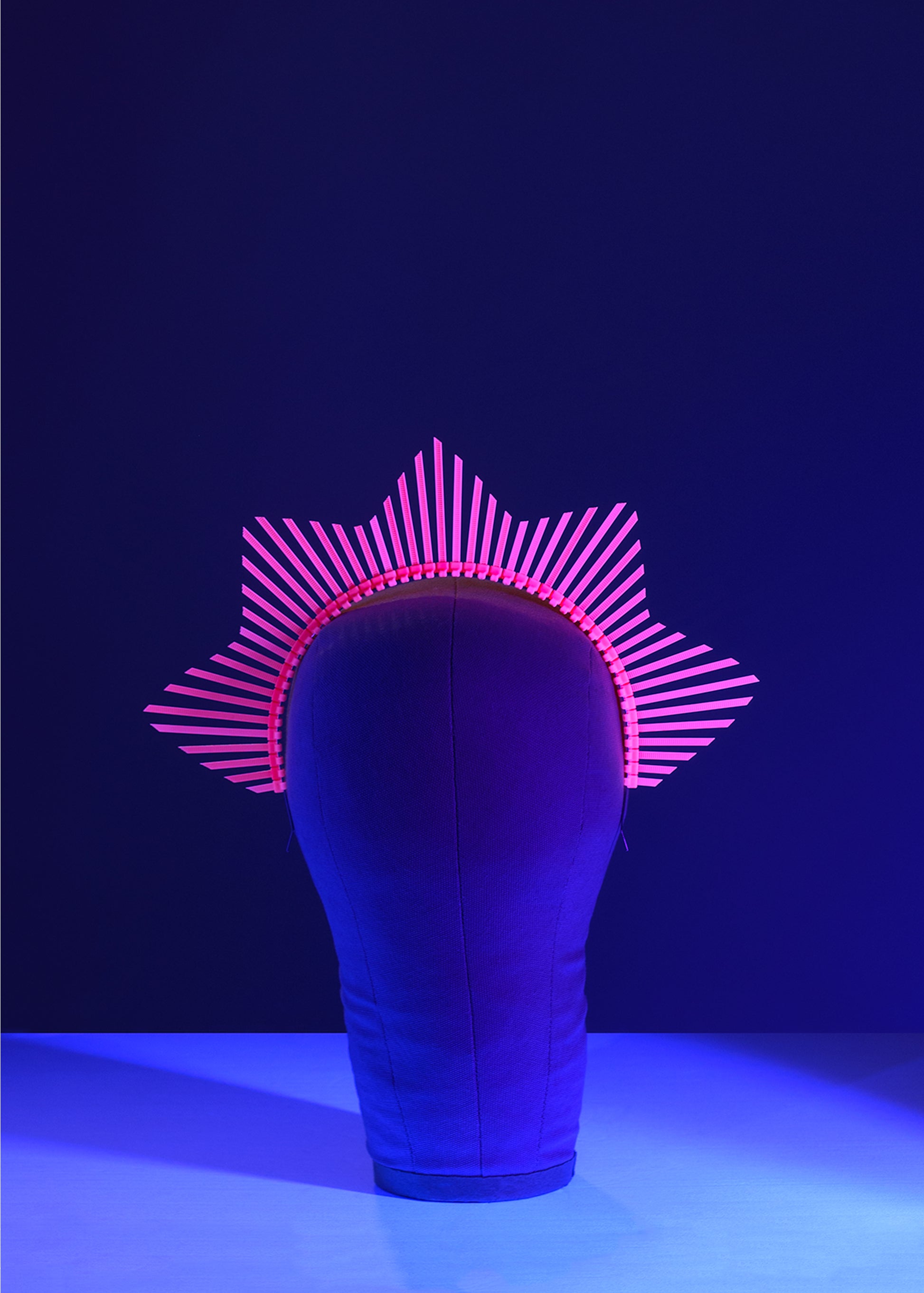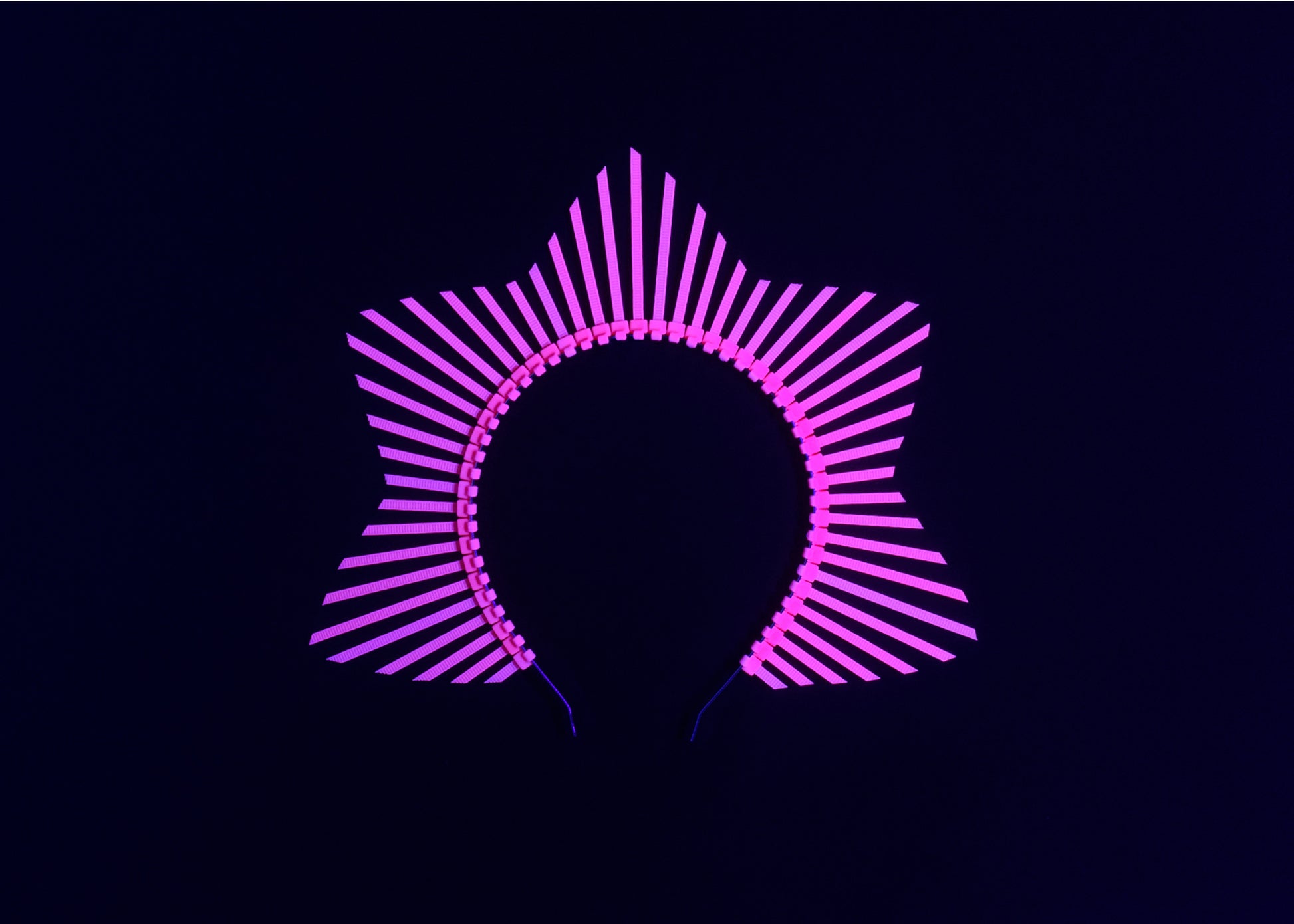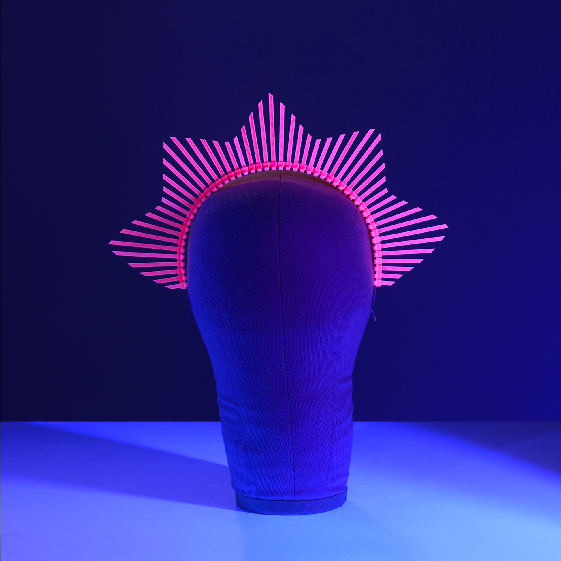 Inspired by Catholic art and iconography, angels, goddesses, and saints; the Star Shaped Crown is a striking spiked headband crown made of perfectly spaced, neon uv zip ties arranged in a heart shape on a slim metal headband. Worn alone or paired with a floral headdress or veil, this regal, avant garde headpiece is a unique statement piece.