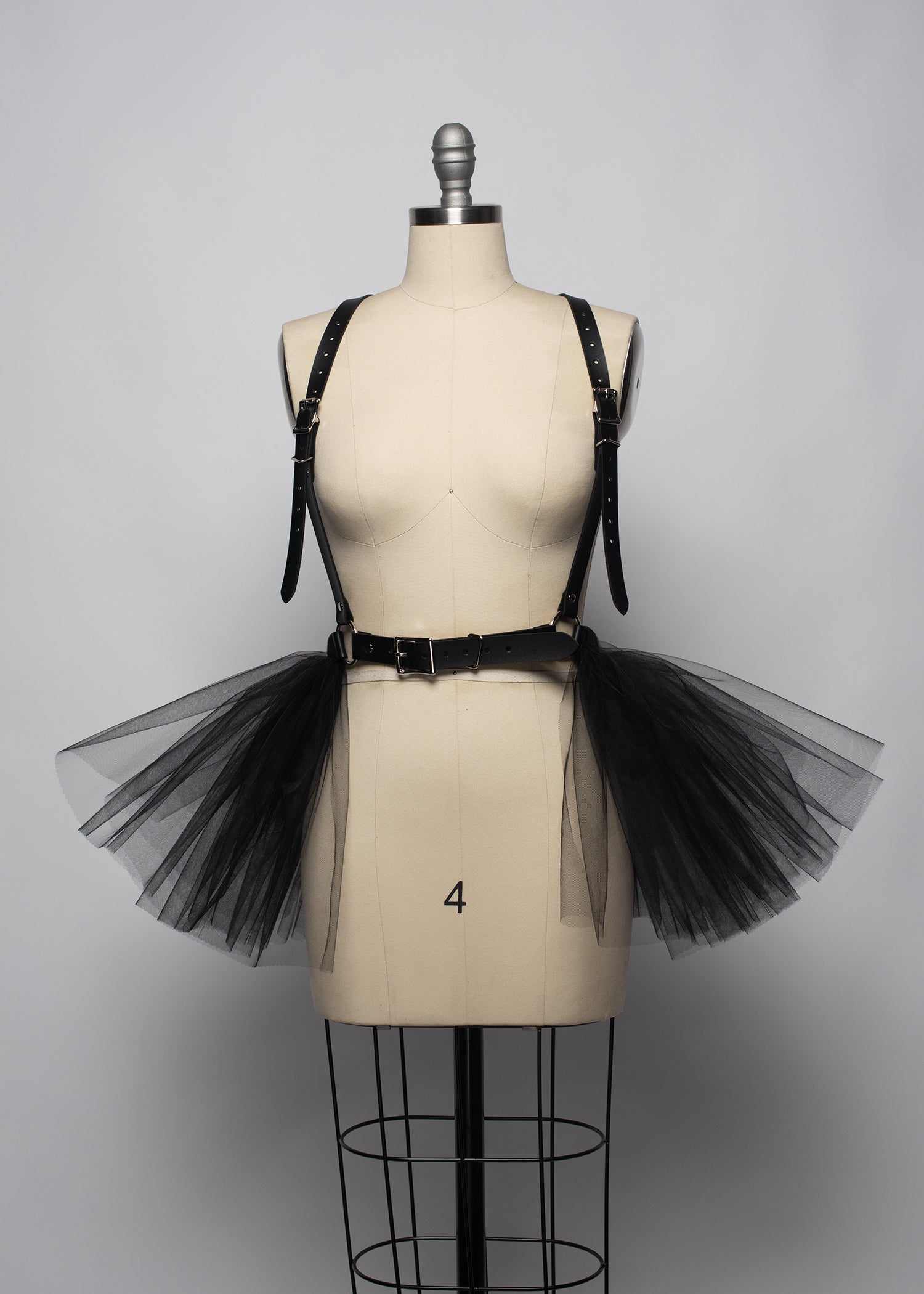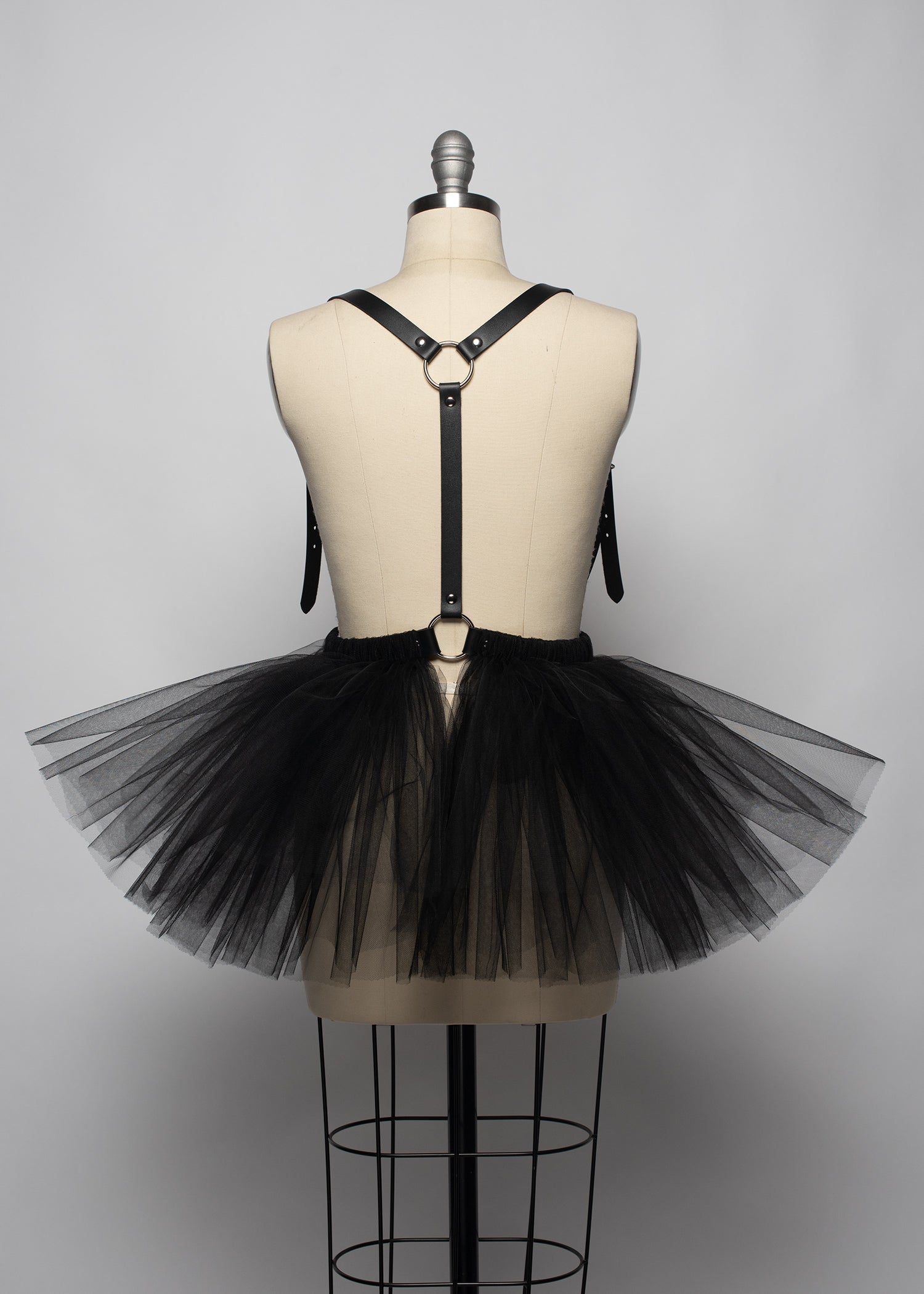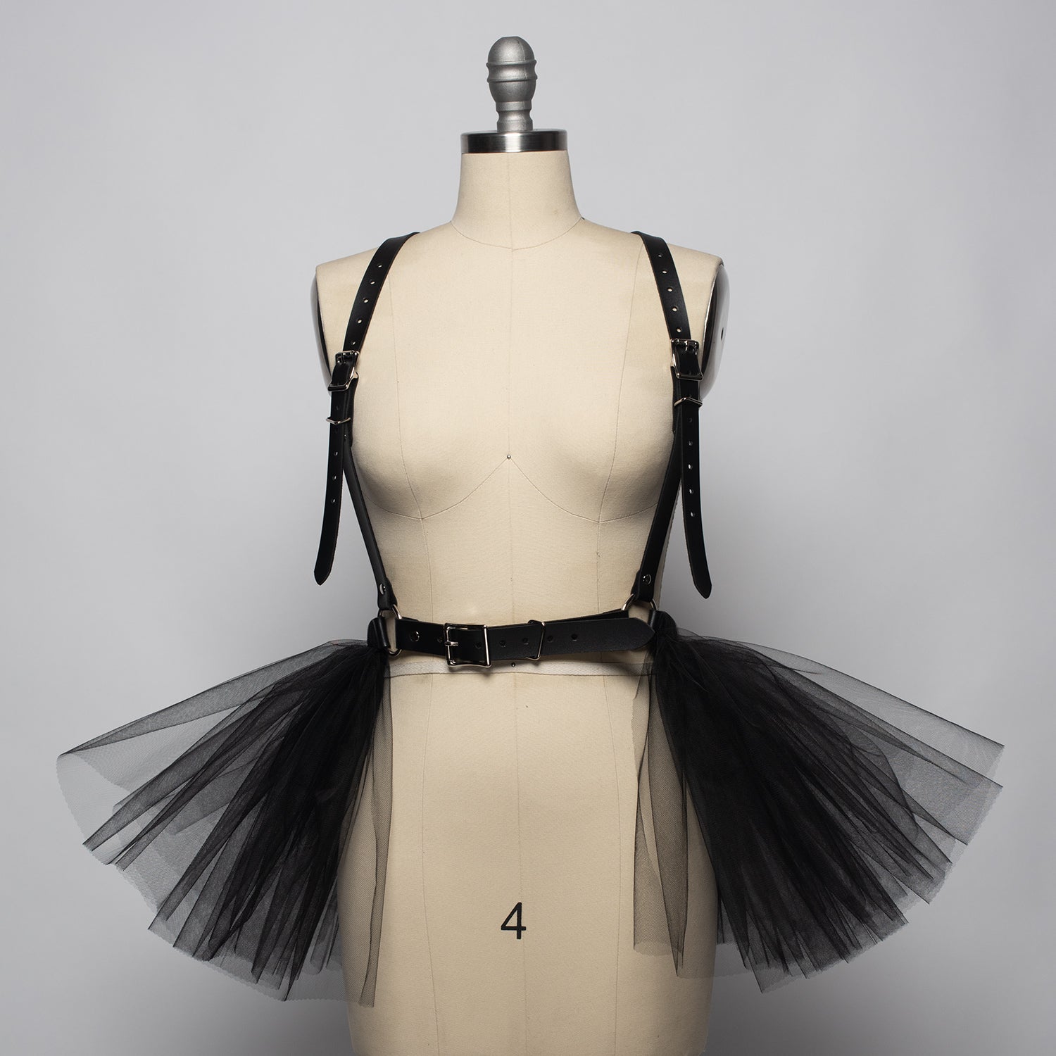 The Odette Tutu Harness Skirt is a classic harness style updated with a full and flouncy tulle skirt. Silver toned nickel plated steel hardware. Fit is adjustable at shoulders and waist. Designed to fit at the natural waist.