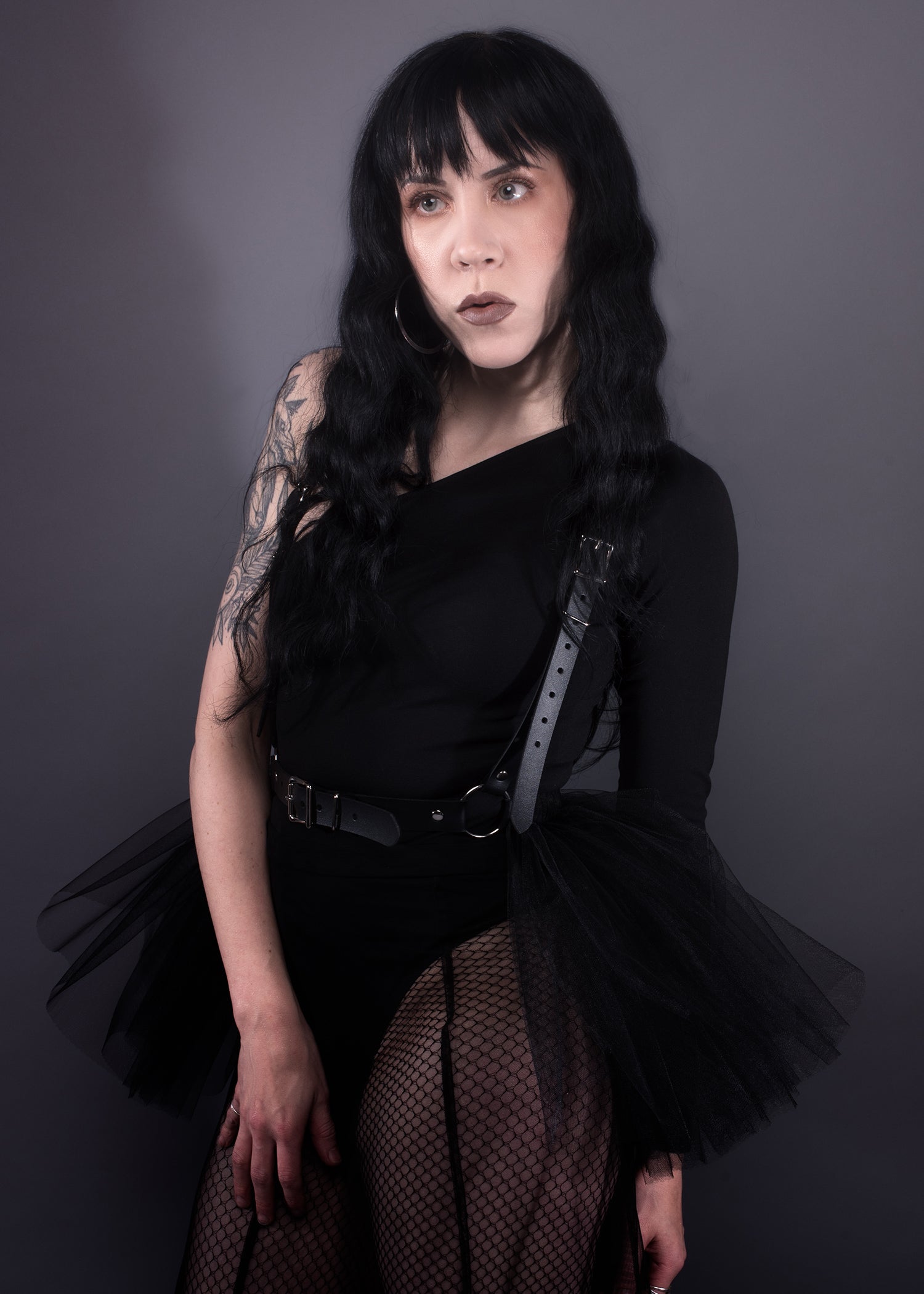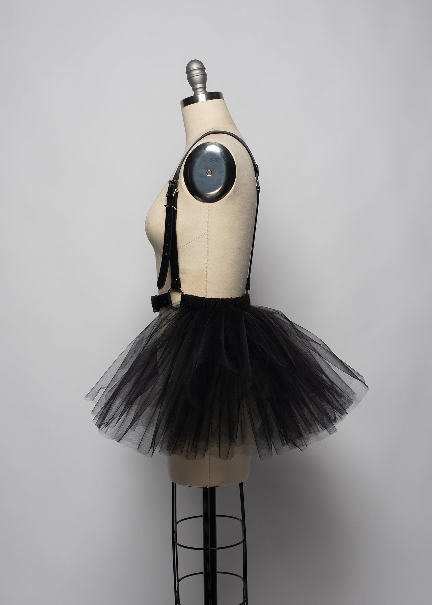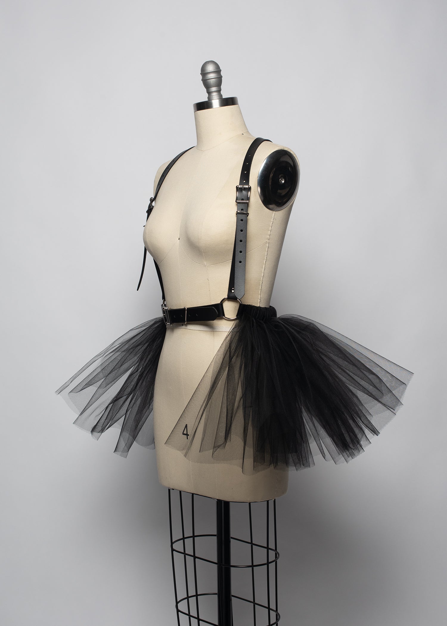 The Odette Tutu Harness Skirt is a classic harness style updated with a full and flouncy tulle skirt. Silver toned nickel plated steel hardware. Fit is adjustable at shoulders and waist. Designed to fit at the natural waist.