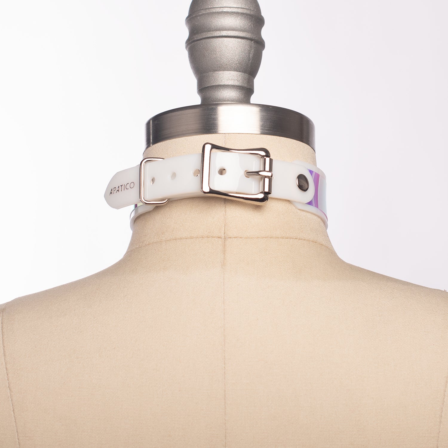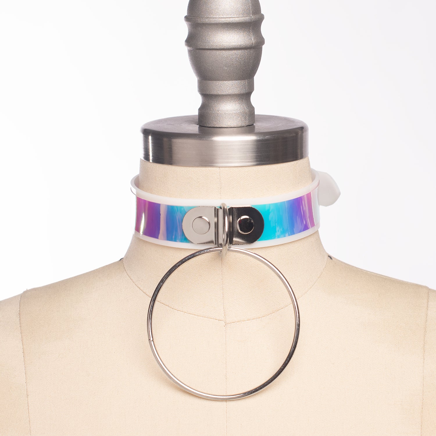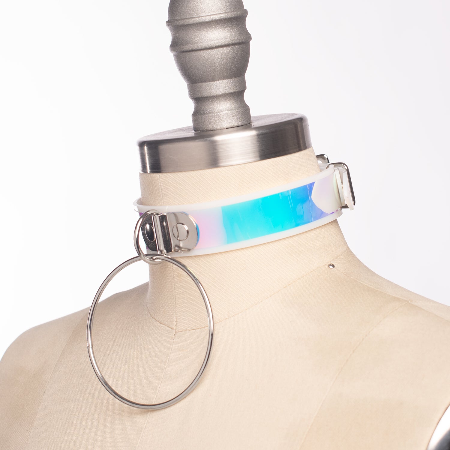 Magical, playful choker collar made in thick PVC. Holographic, iridescent PVC is layered over white. Large but delicate 3" o-ring detail in front. Silver toned nickel plated steel hardware. Fit is adjustable with buckle.