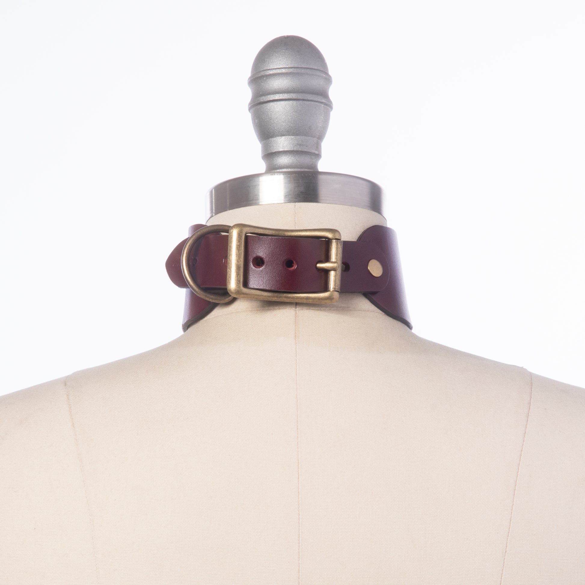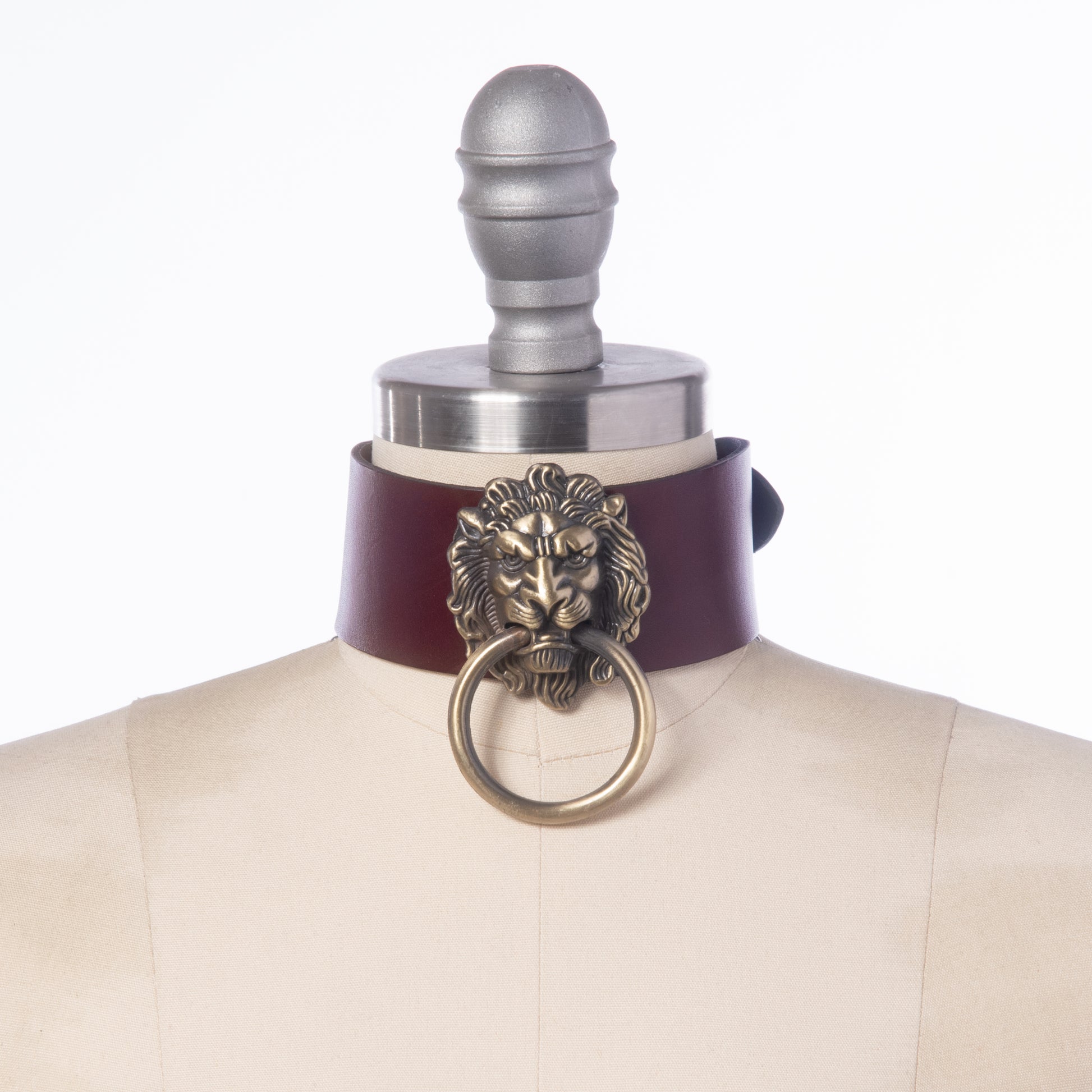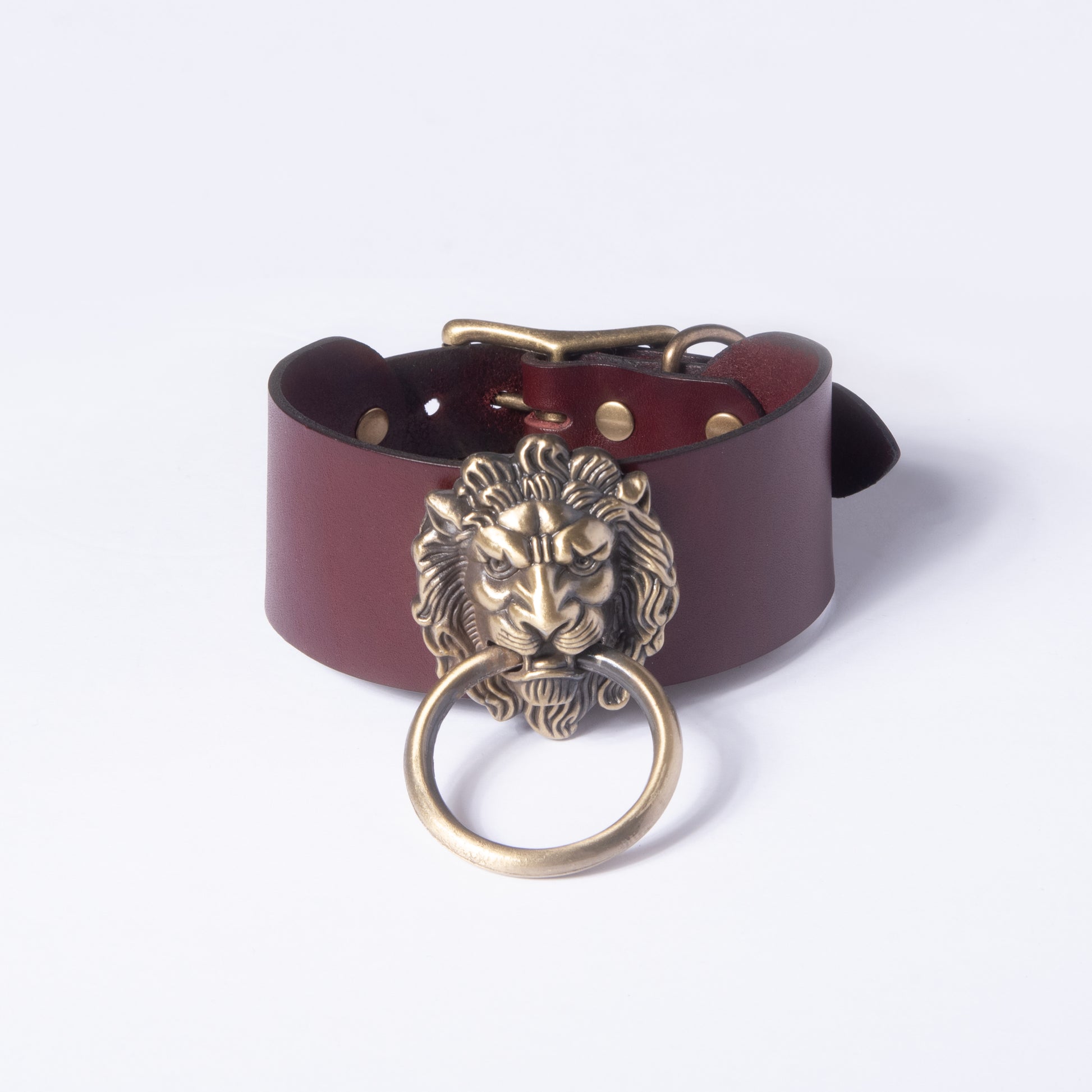 Sultry collar in burgundy oxblood leather with a beautiful, x-large lion head pull ring adornment on the front. Fastens in back with buckle. Antique gold toned hardware.