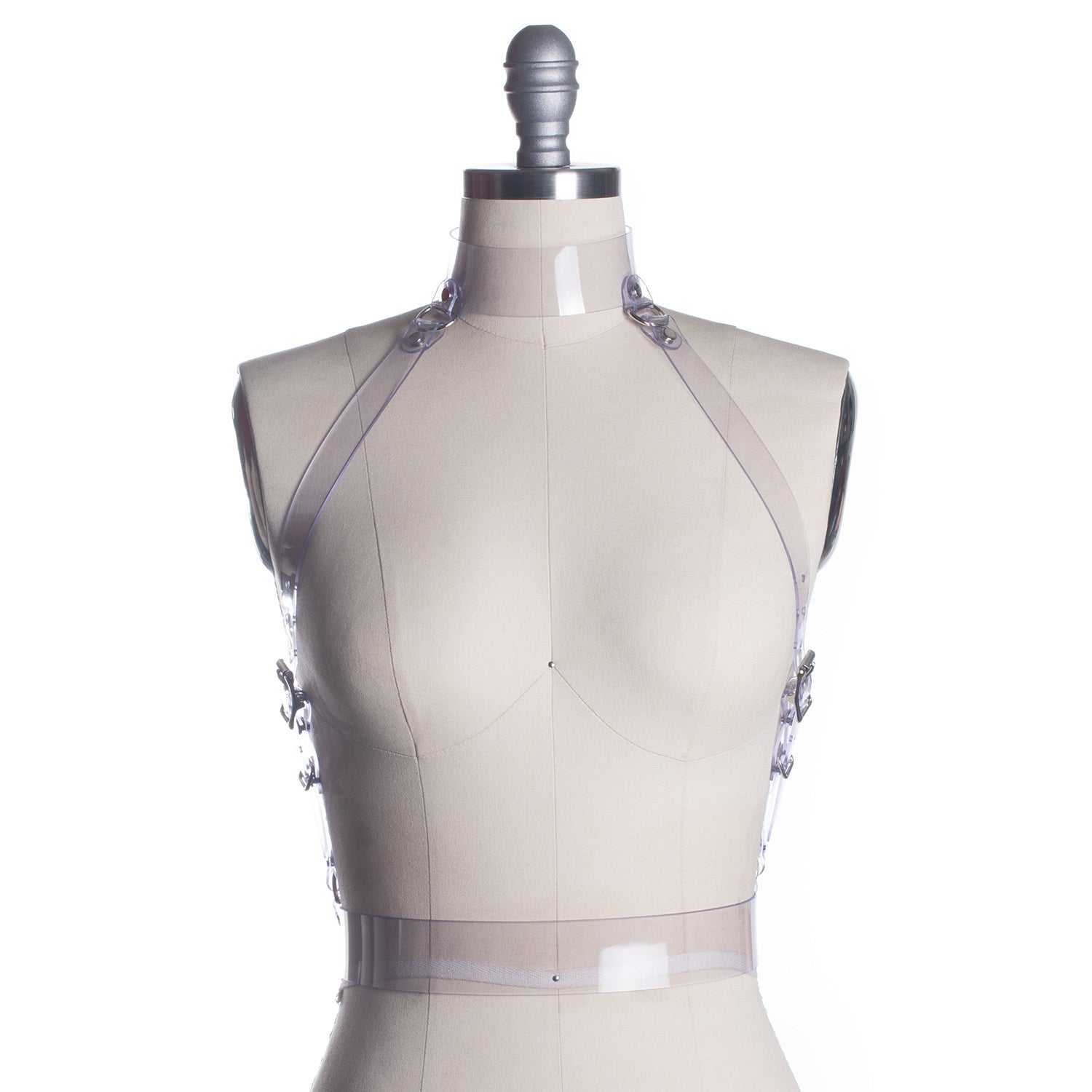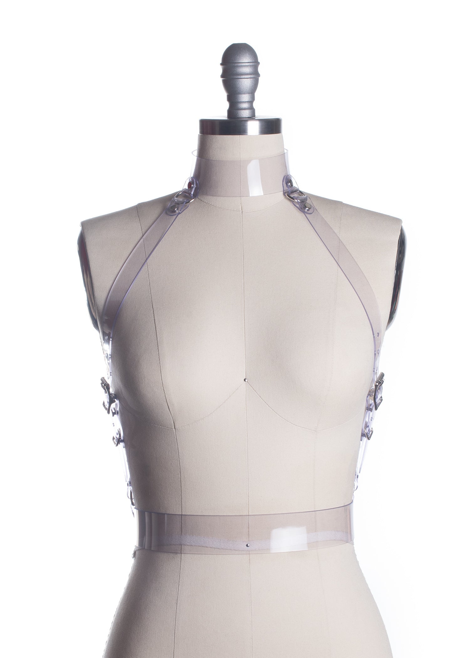 This clear PVC has two shoulder straps frame the chest and connect at both the neck and waist. Adjustable straps and buckles at shoulders. Fastens at back of neck and small of the back at the waist.