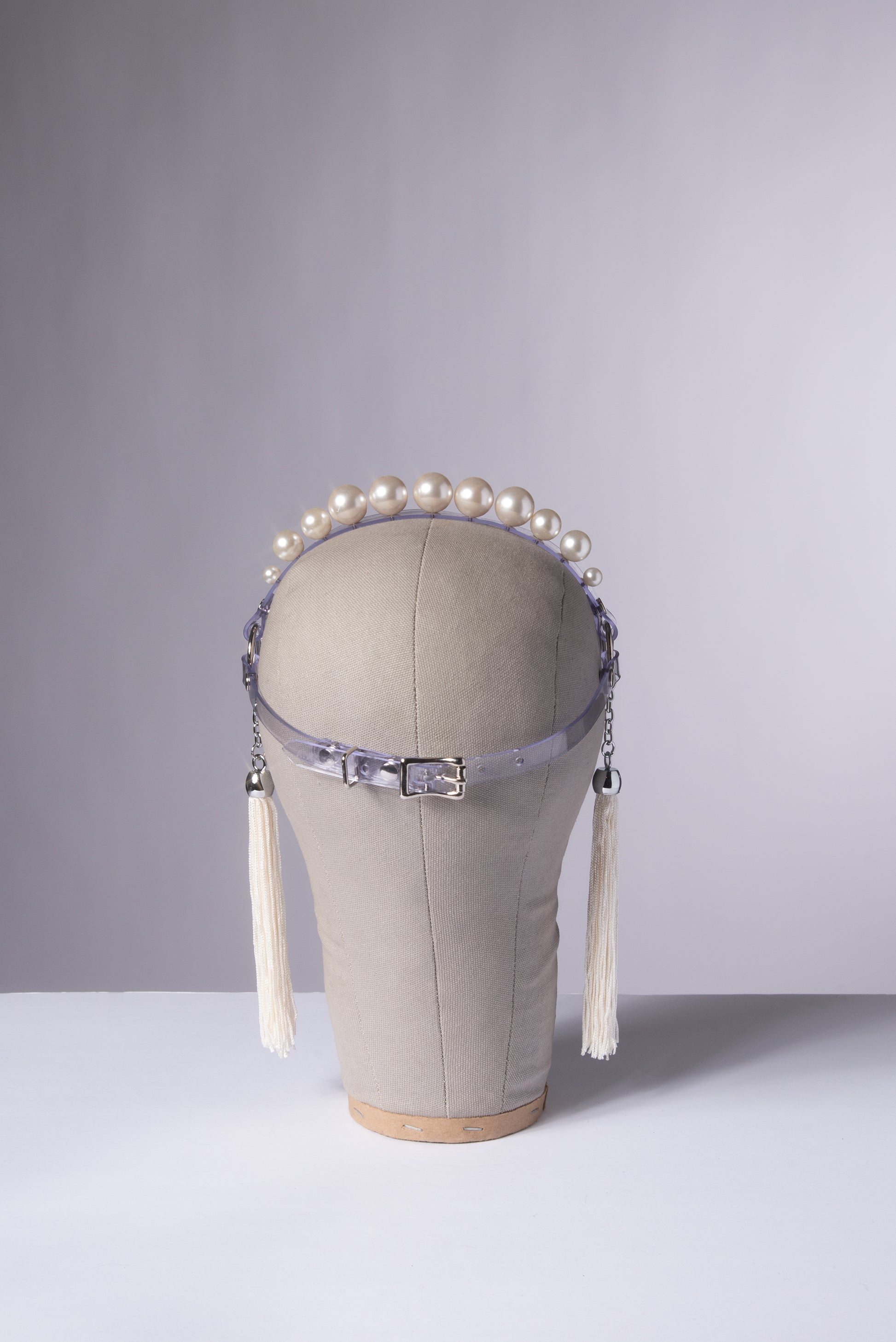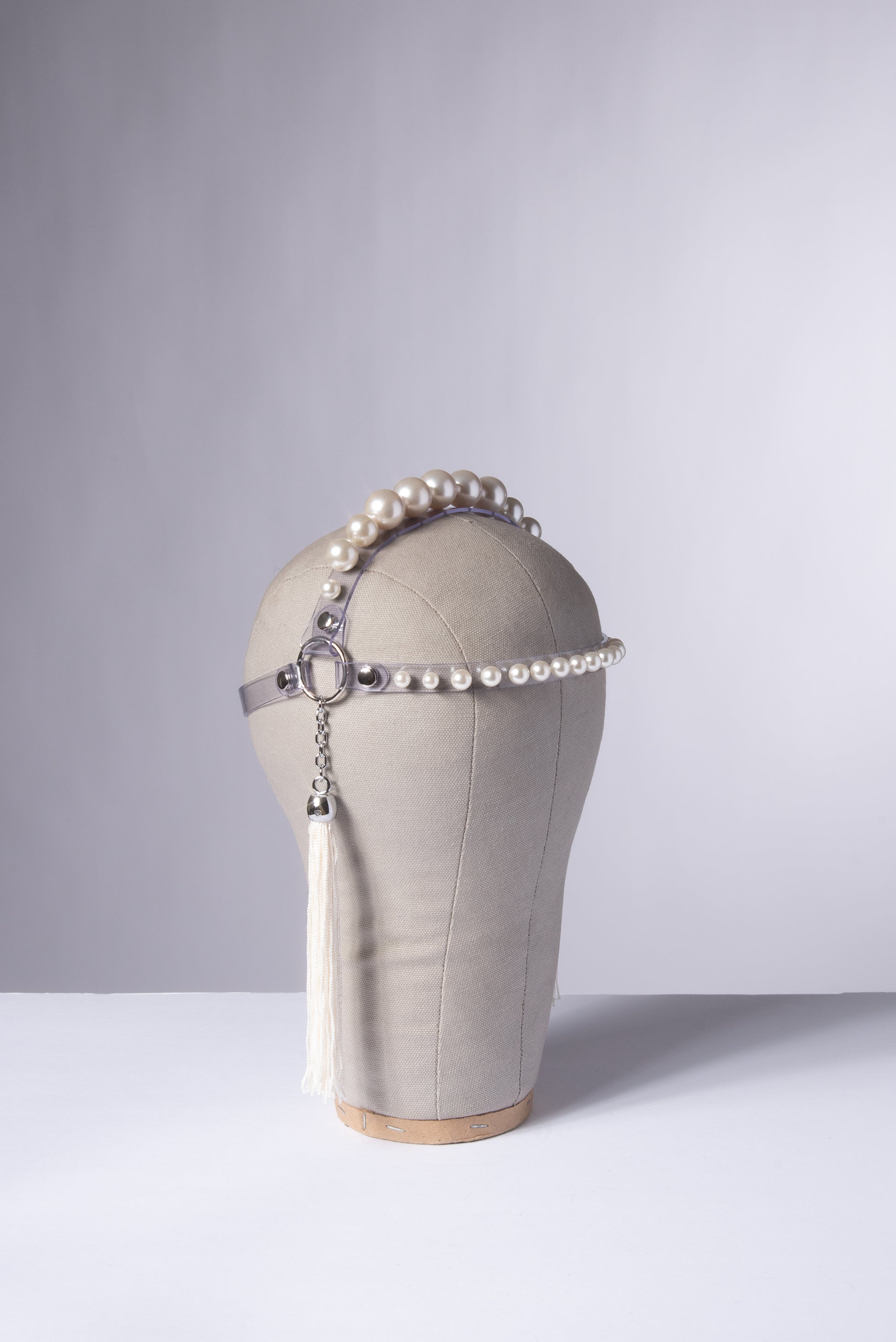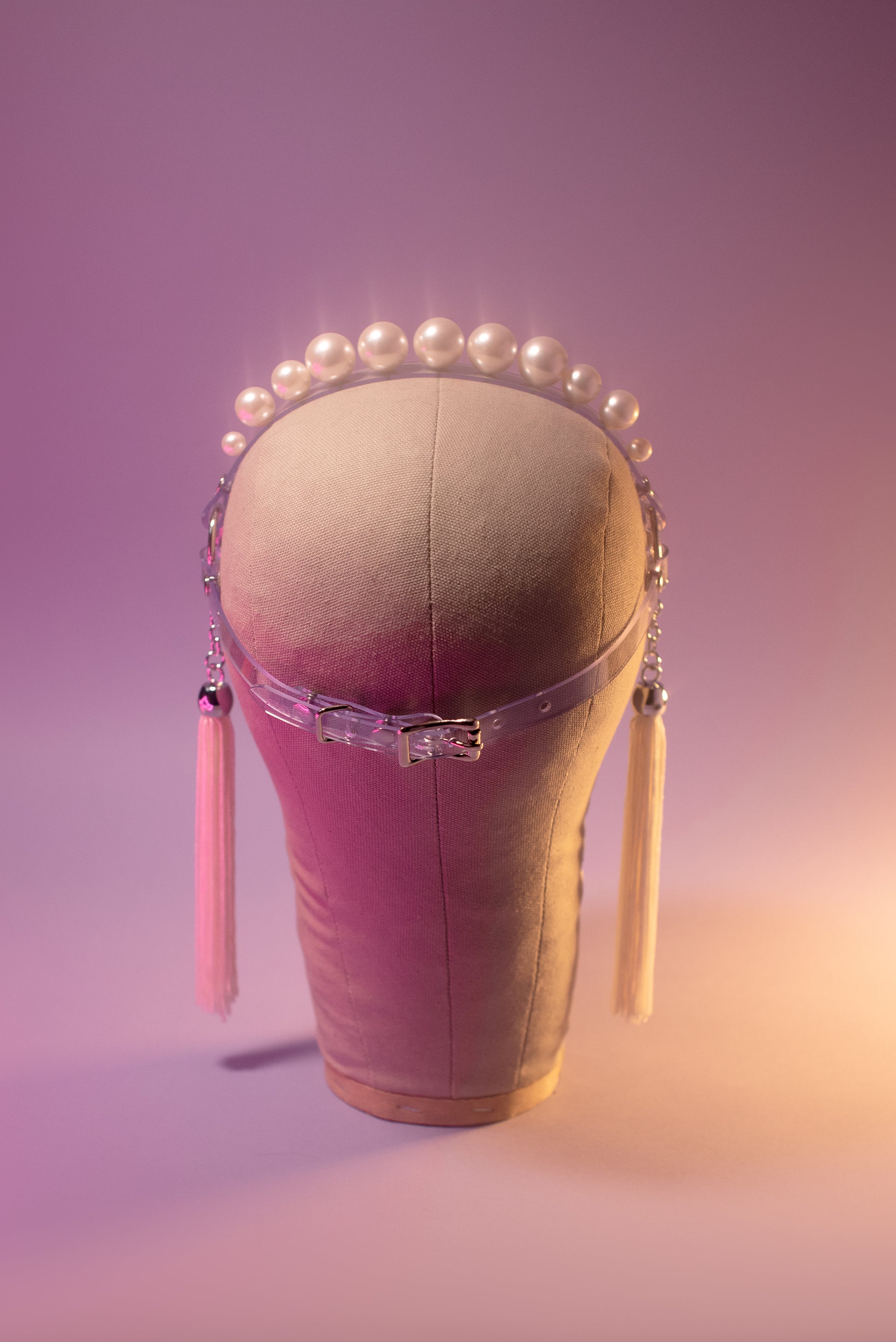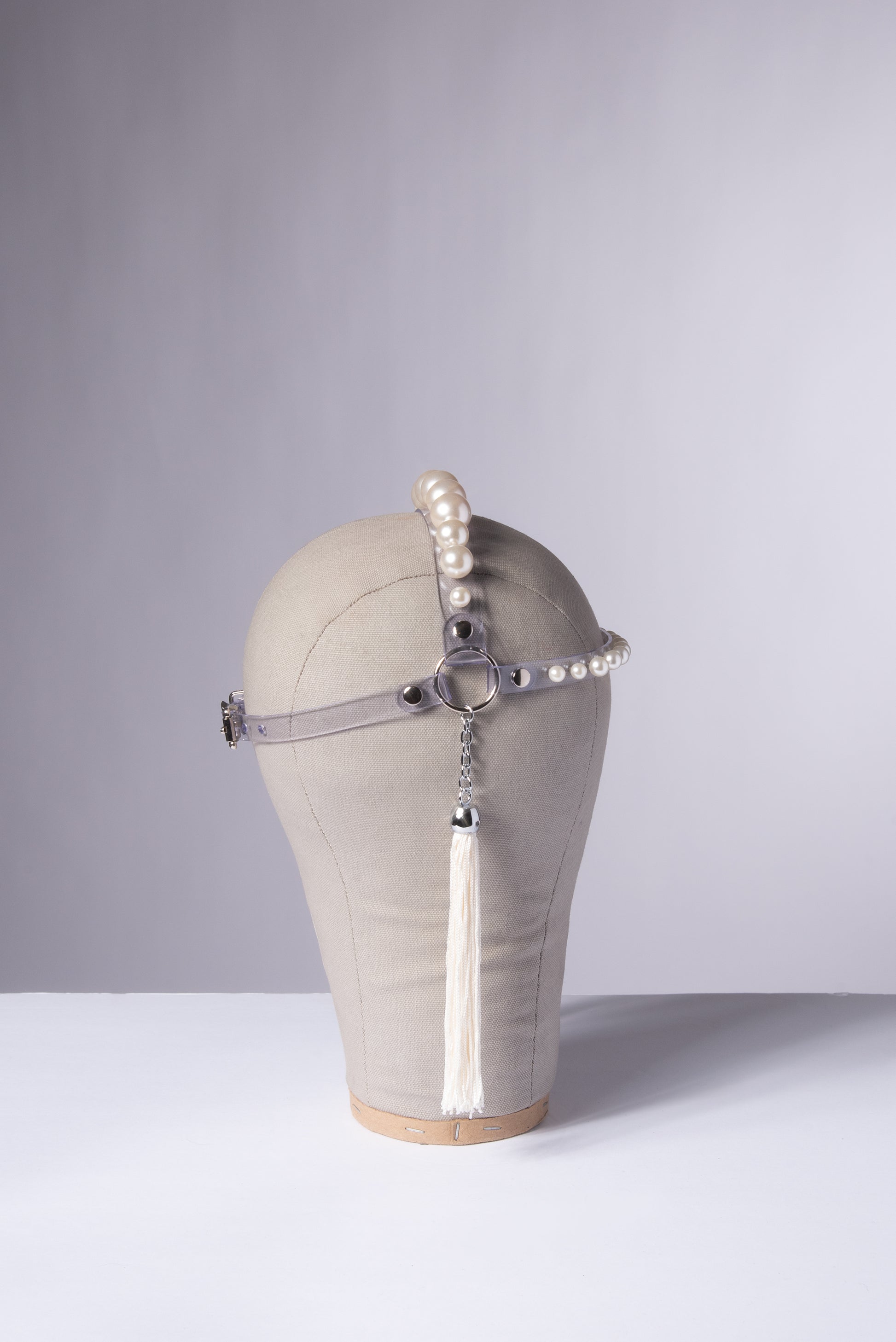 Gorgeous harness crown headpiece in clear or white PVC with large pearl sphere embellishments and long dreamy tassels. Fastens in back with buckle.