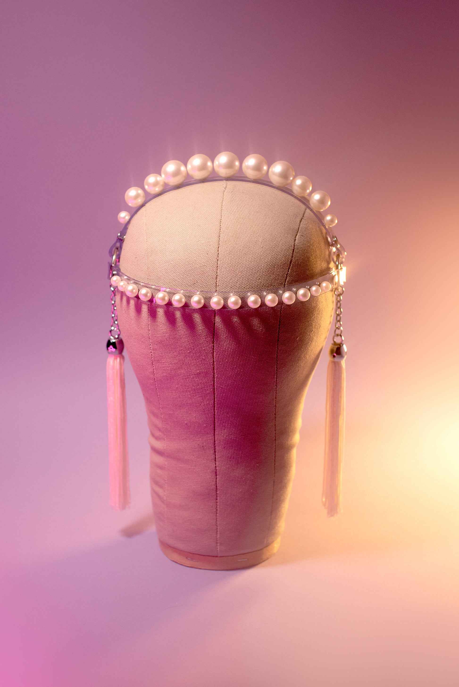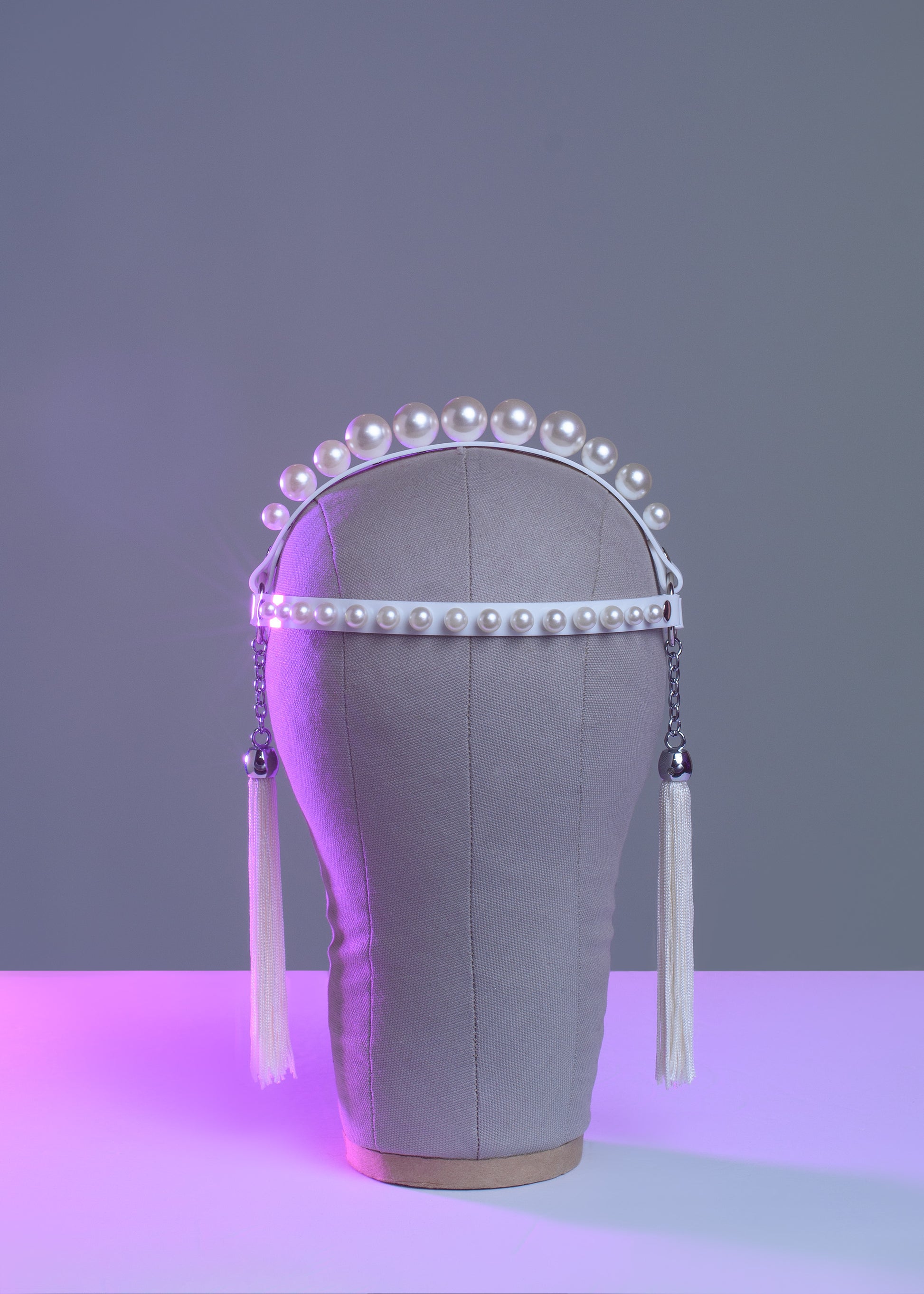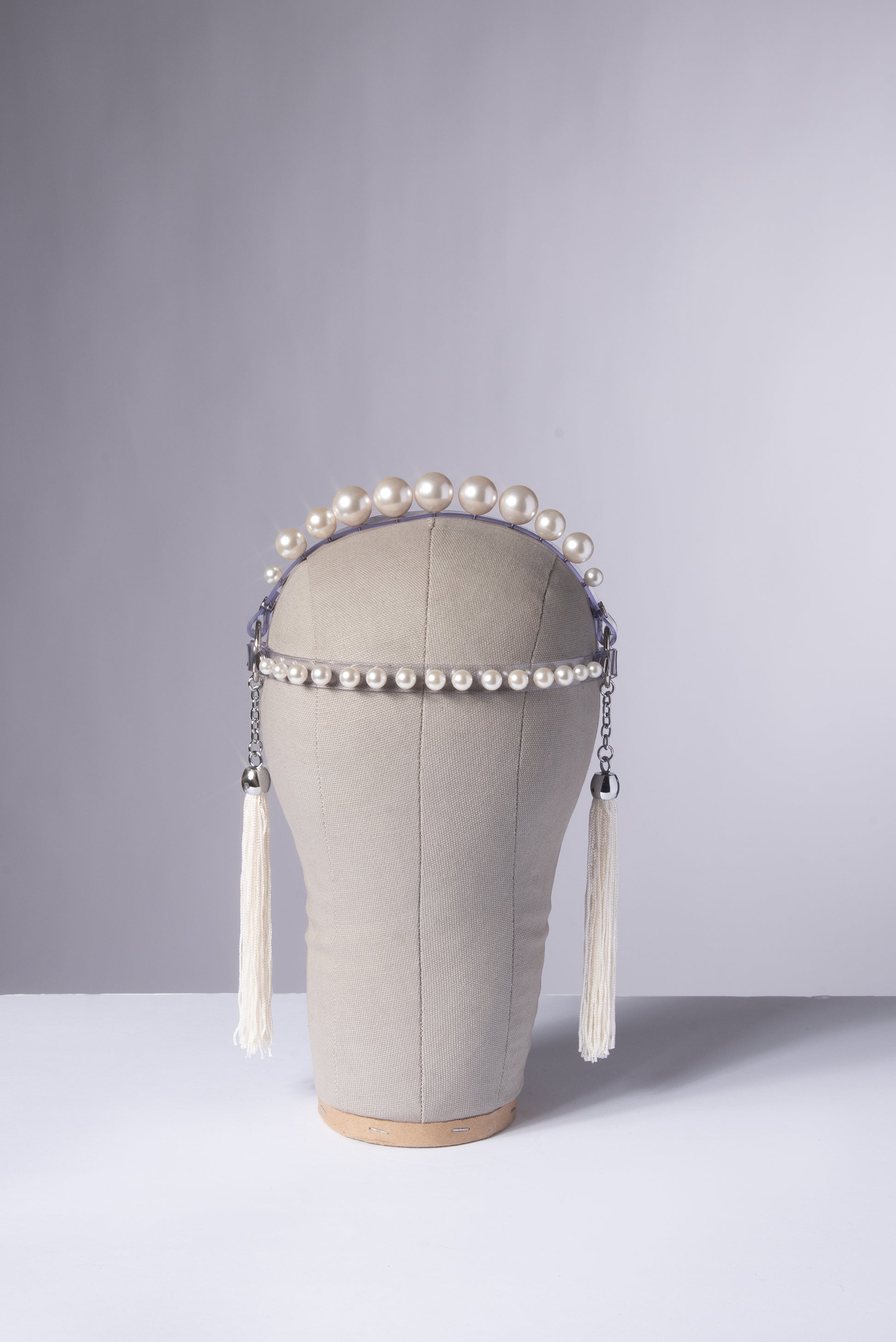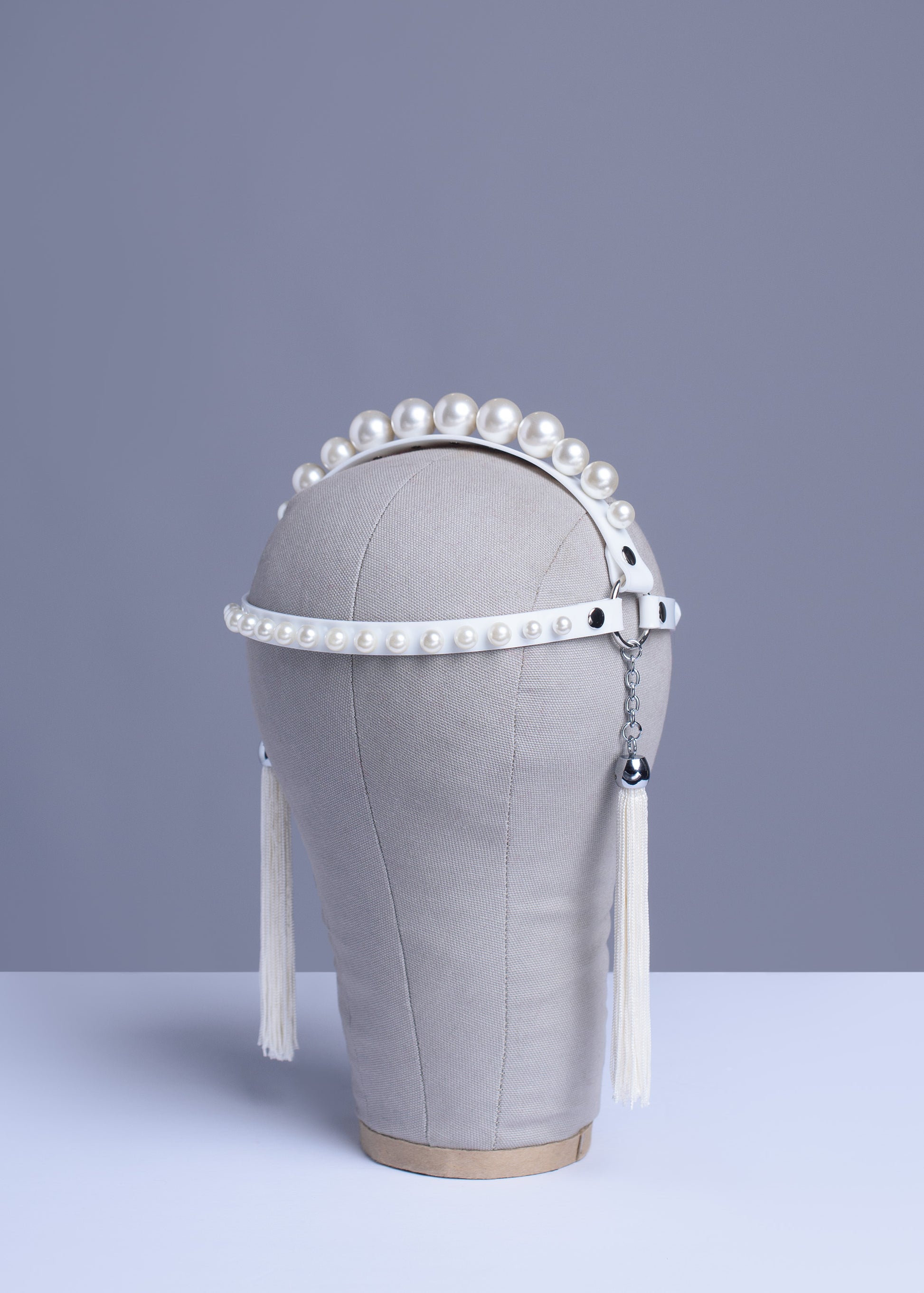 Gorgeous harness crown headpiece in clear or white PVC with large pearl sphere embellishments and long dreamy tassels. Fastens in back with buckle.