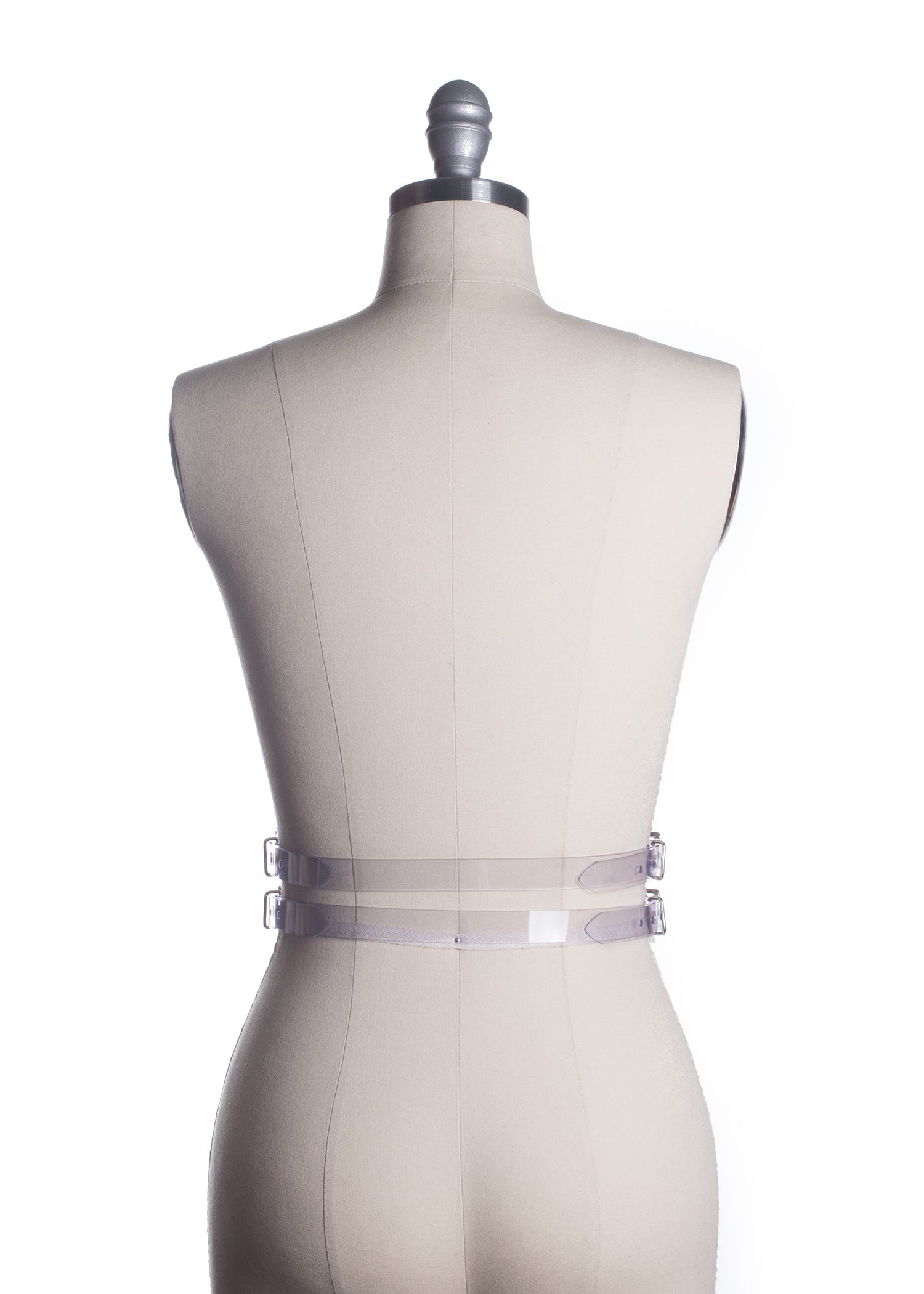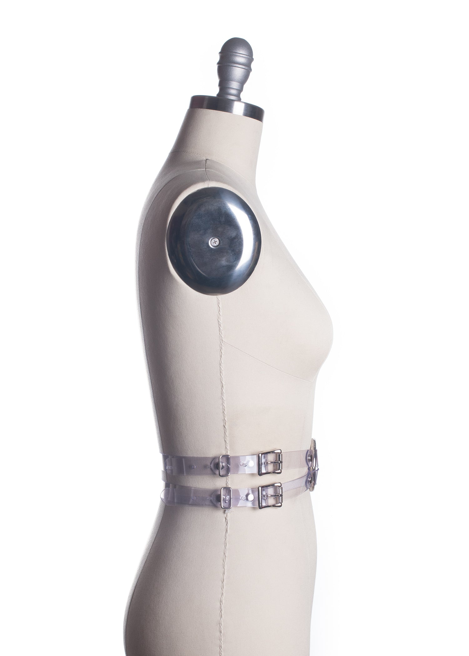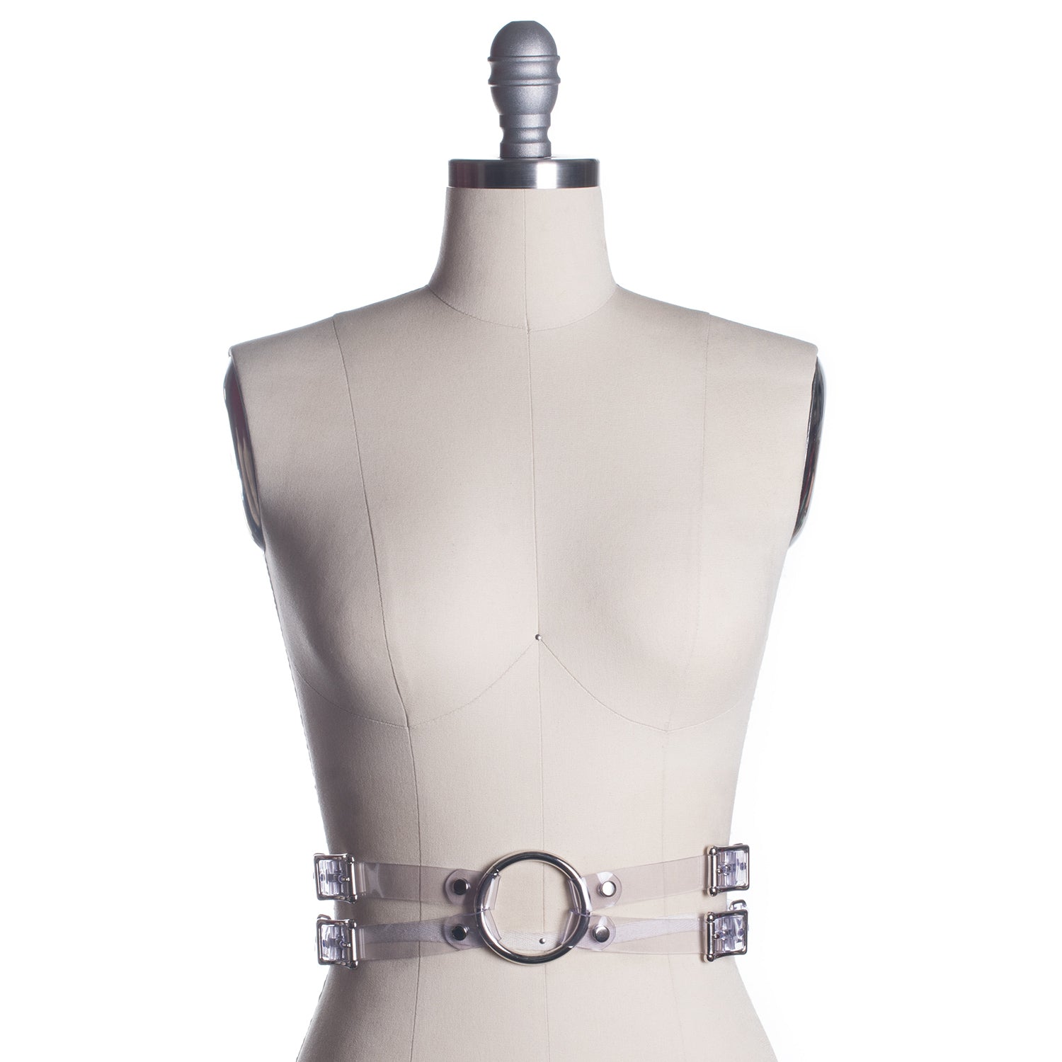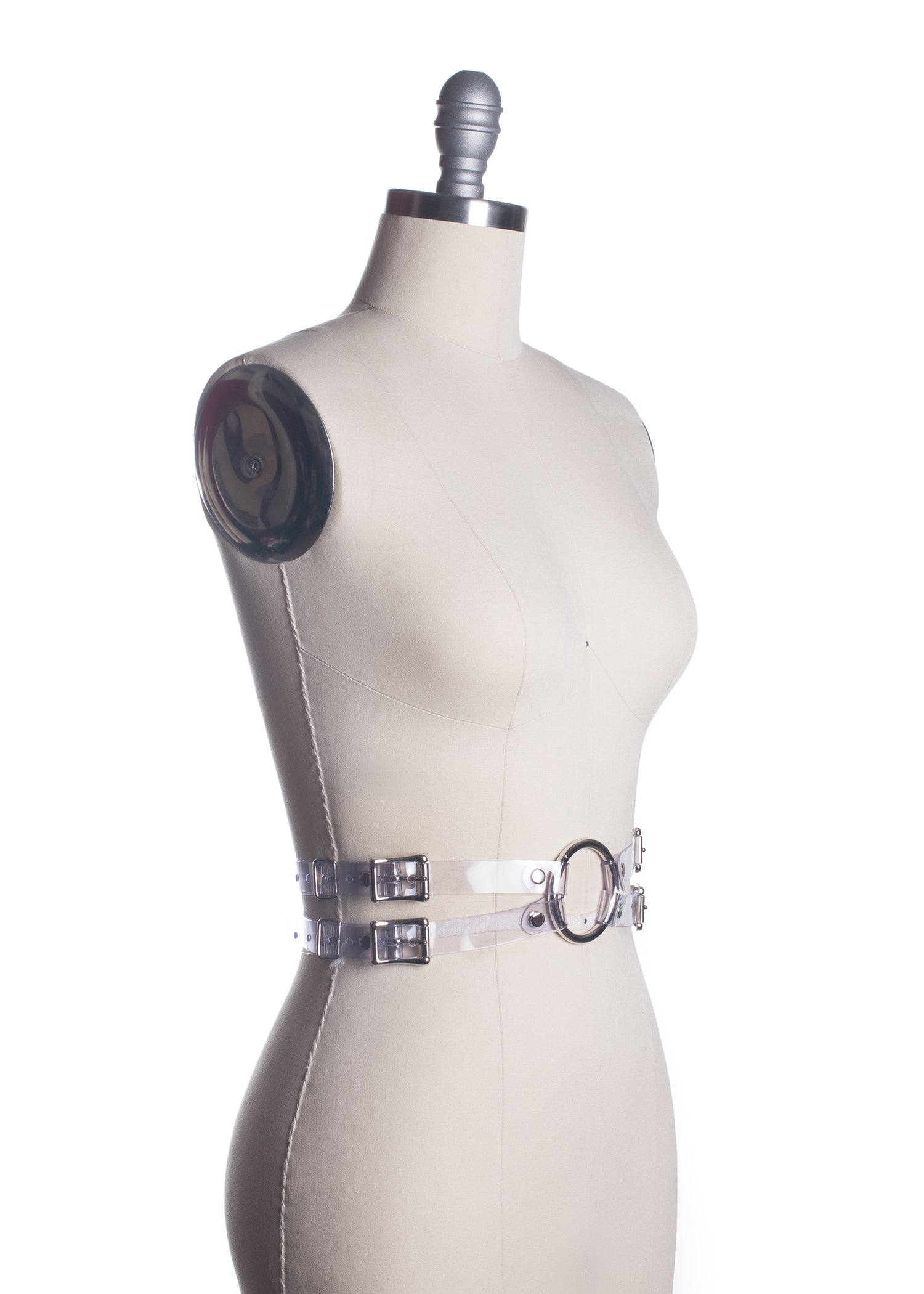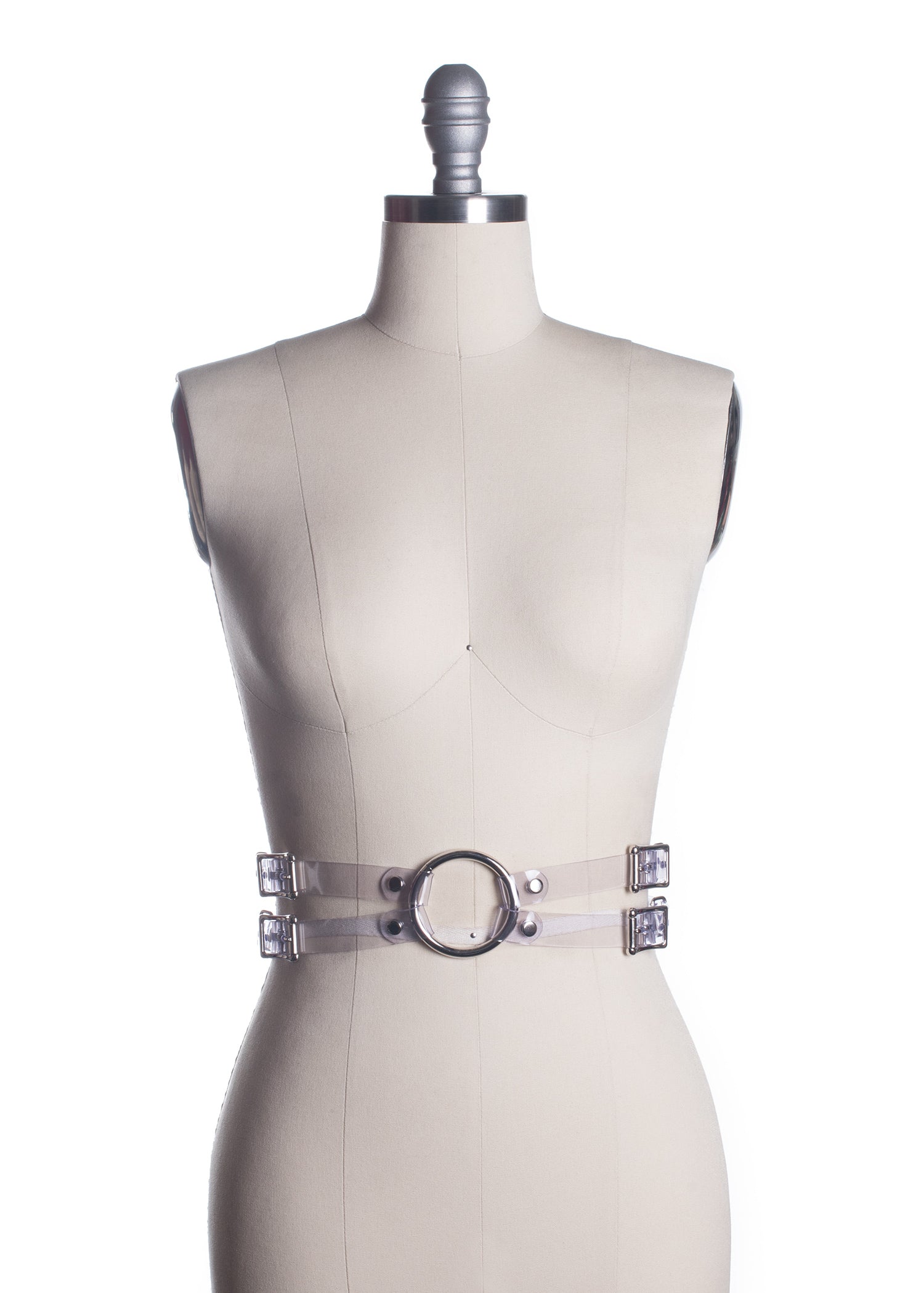 There's a fish in the percolator... and for some reason, I always picture a goldfish. So the Percolator Belt is also available in "goldfish orange" as well as clear PVC. Four buckles, two at each side, fasten at either side of the waist and join the the front with a large o-ring. Designed to be worn at the natural waist.