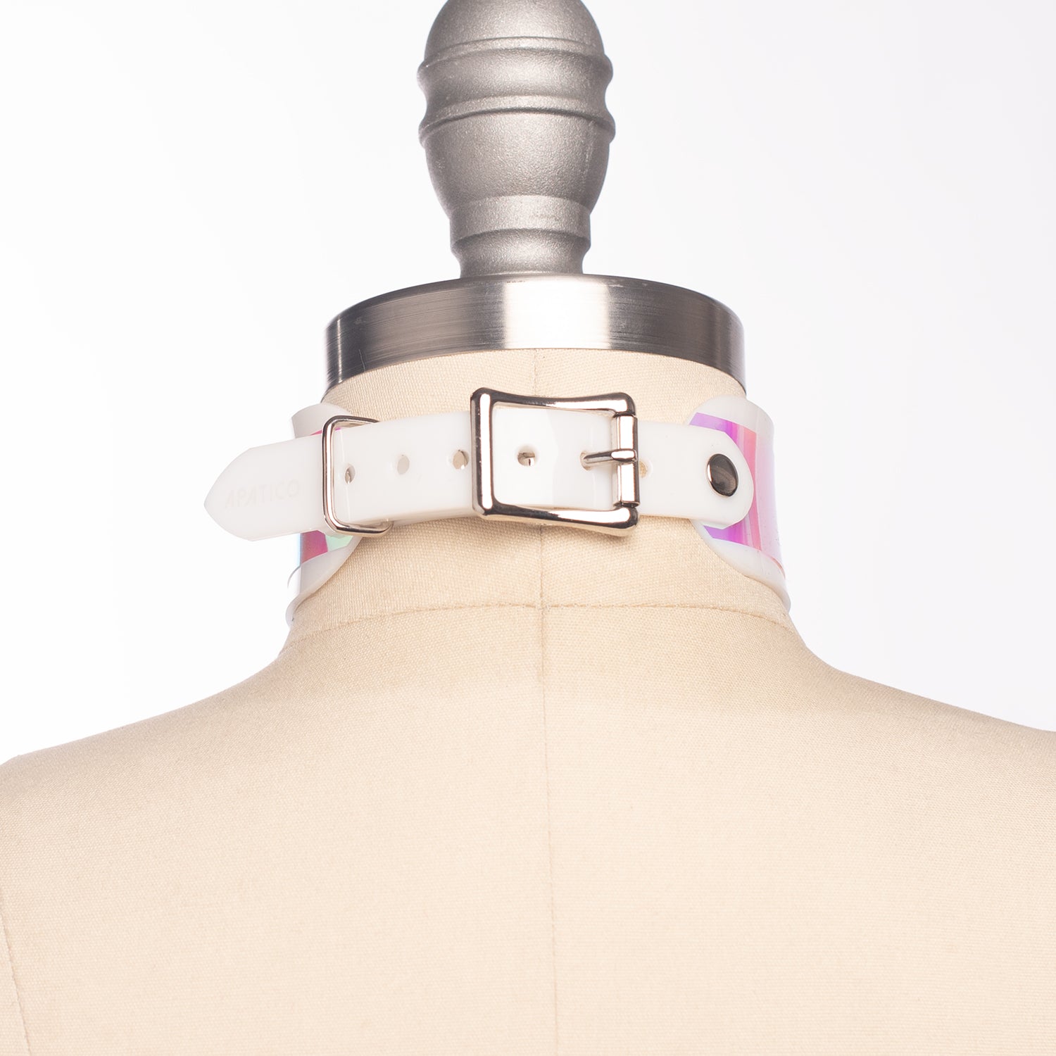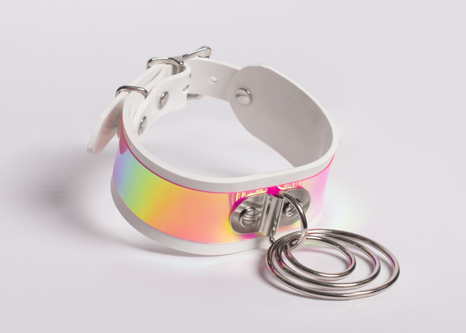 This choker collar is handmade in strong, high quality PVC. Rainbow holographic, iridescent pvc is layered over thick white PVC. Fit is adjustable with buckle in back. Silver-toned nickel plated steel hardware and with triple layered bondage style o-ring in front.
