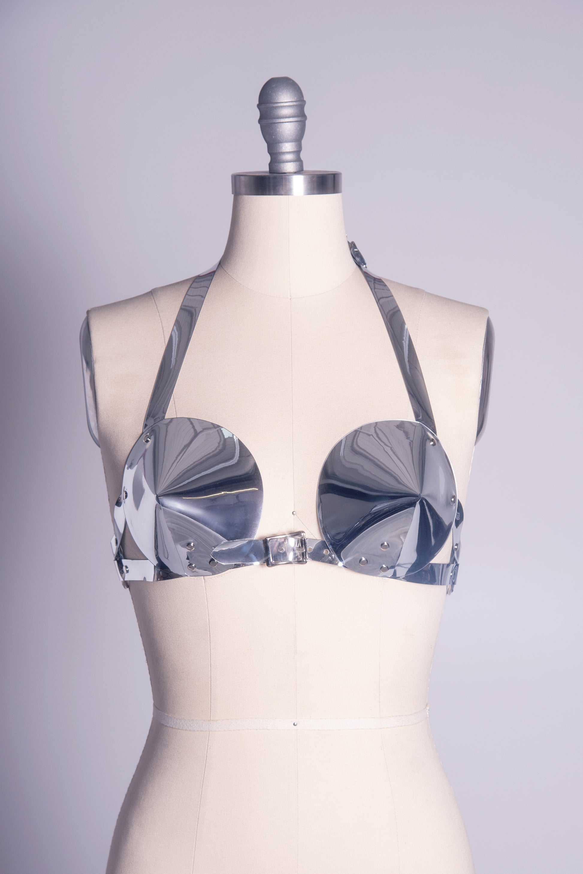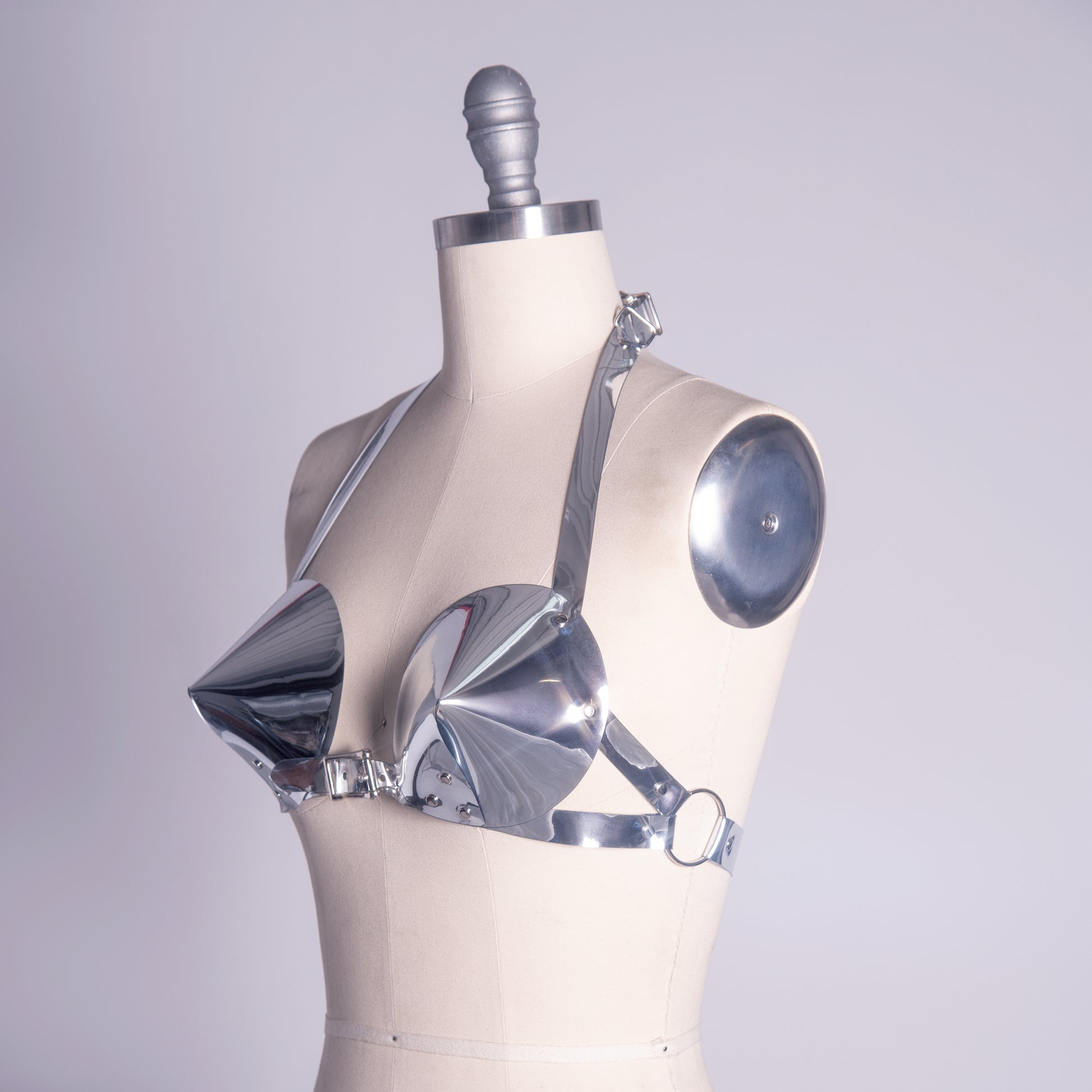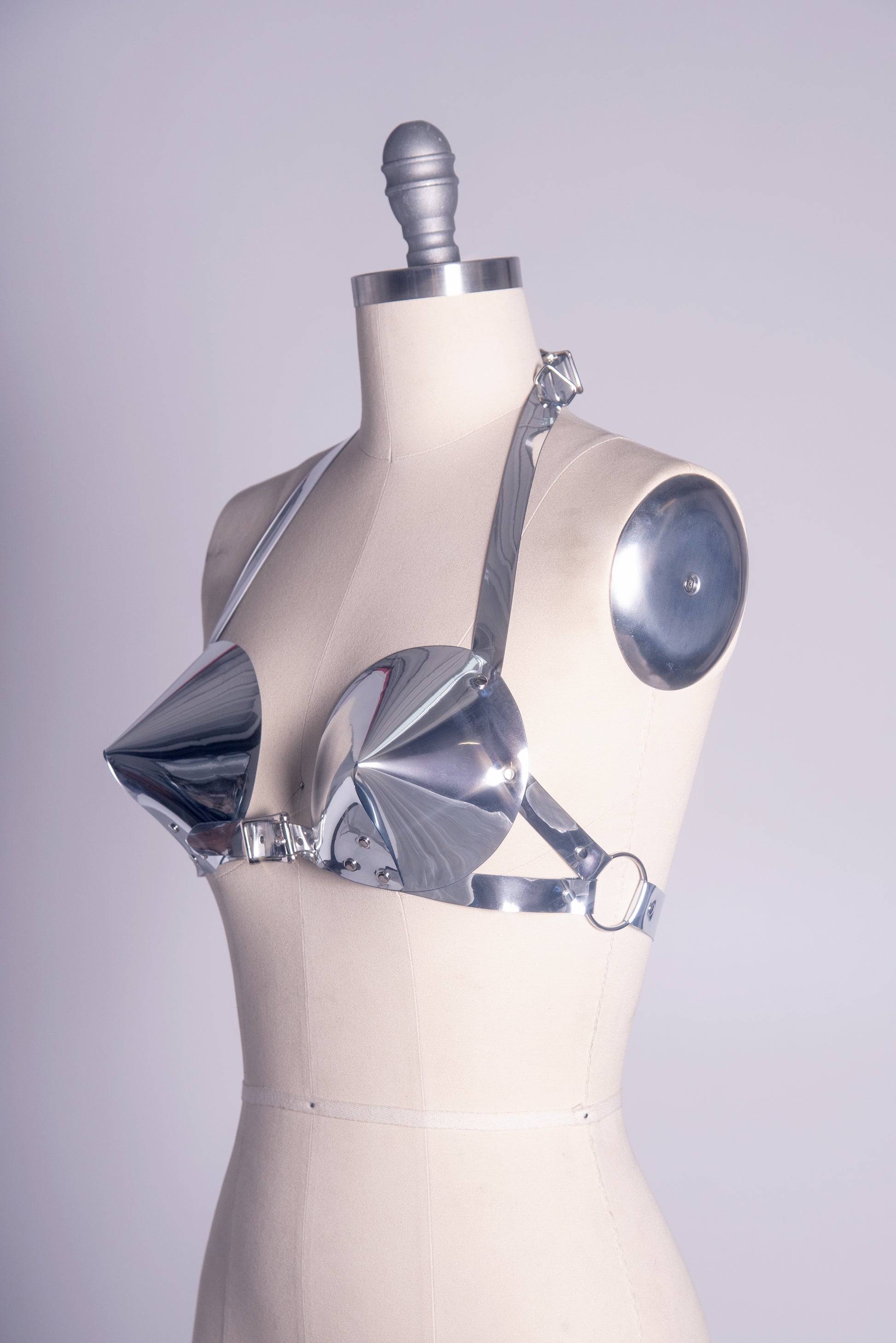 This bullet bra, or "cone bra" is inspired by retro pin-up vixens and futuristic fashion. This version is made in an amazing mirror silver PVC. This material is more lightweight than our standard PVC but still strong. Wear alone or layered and add a touch of metallic drama to any outfit.