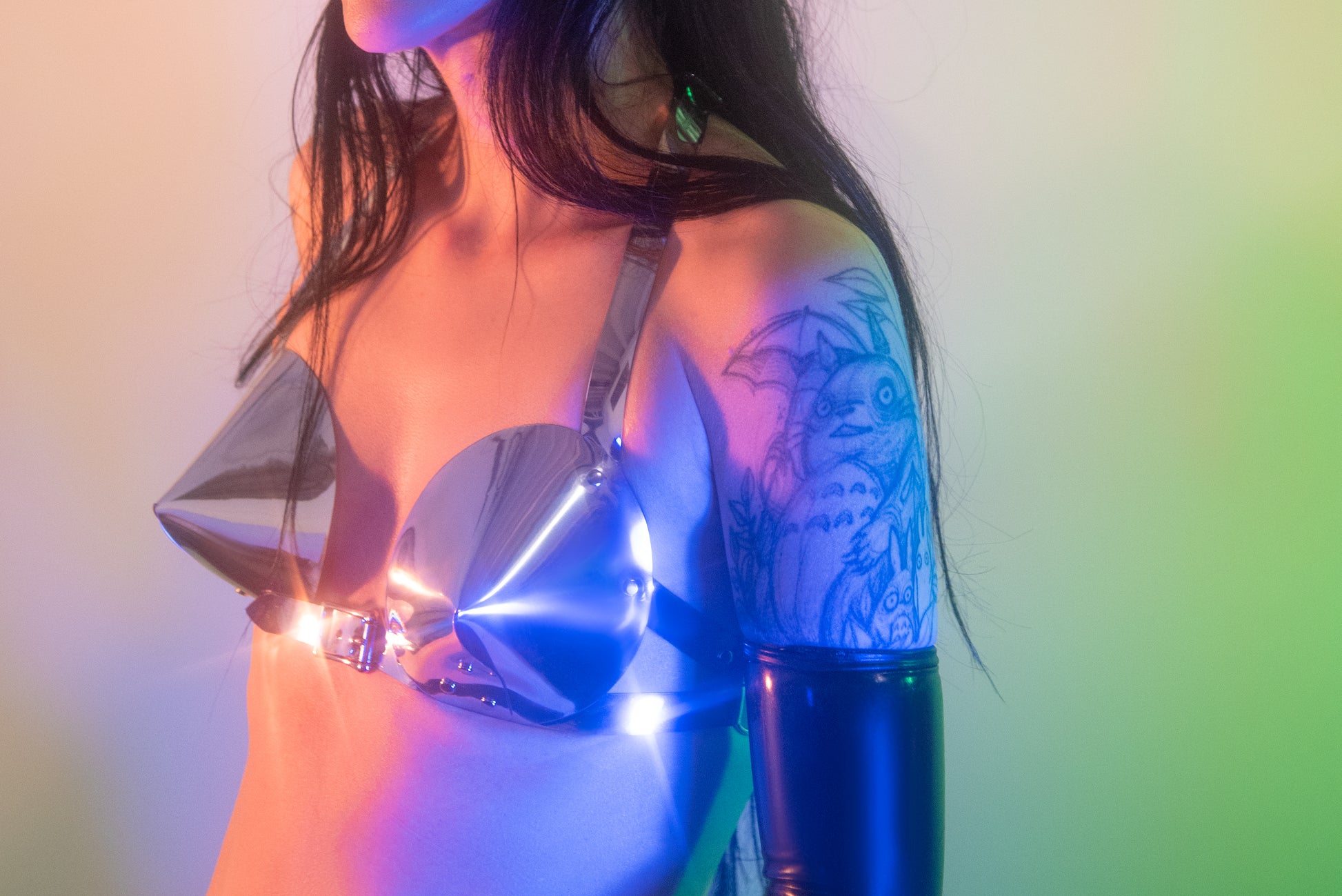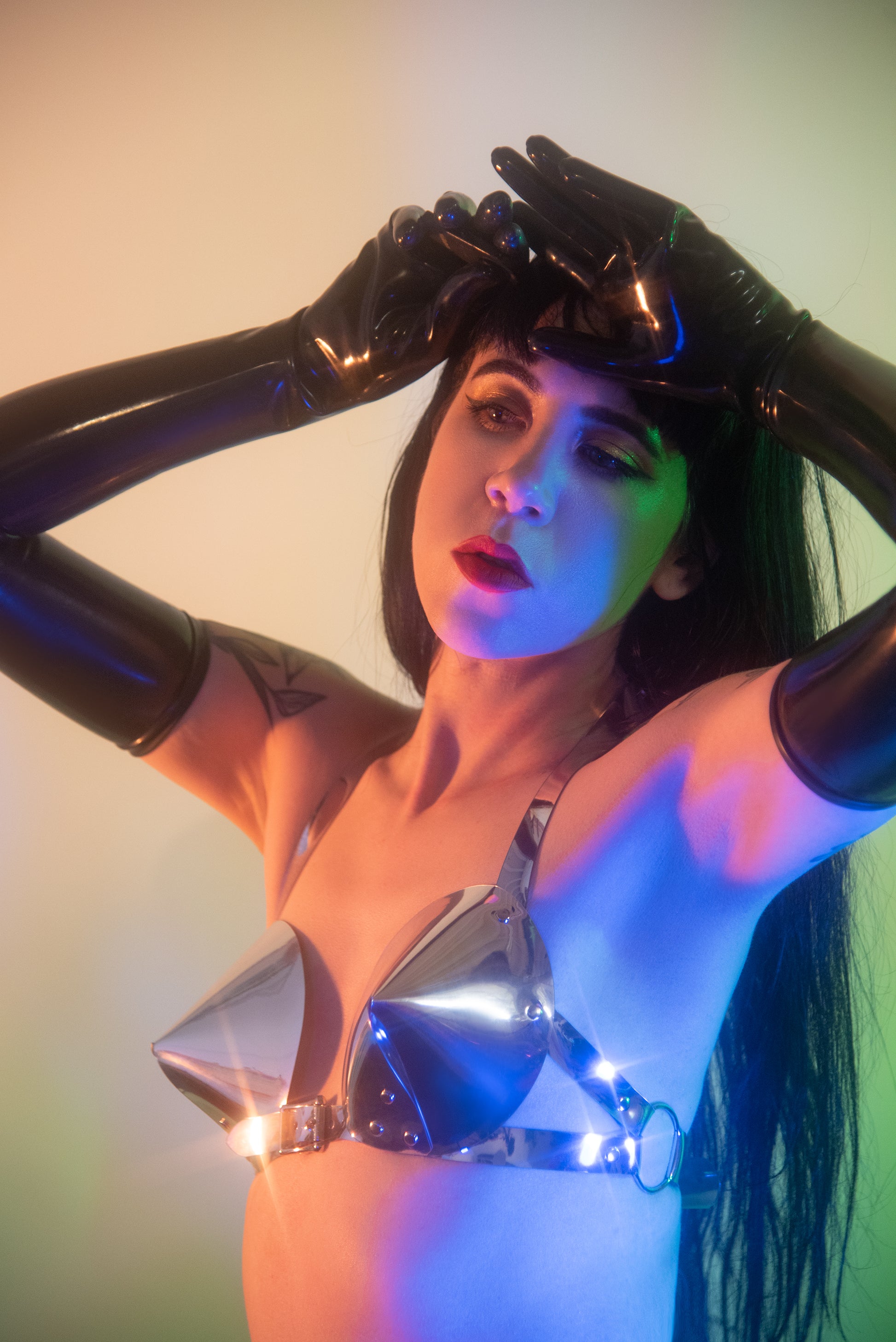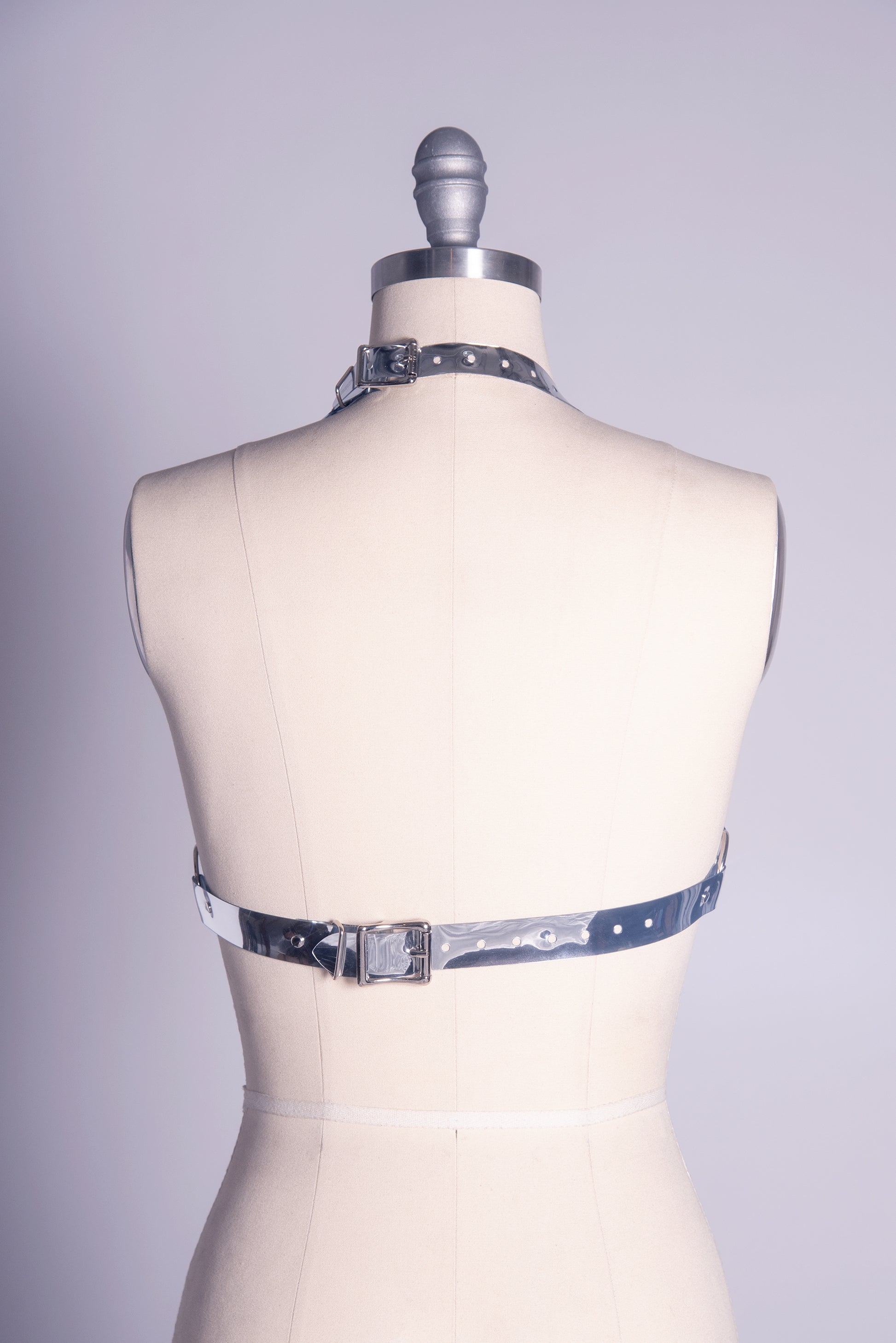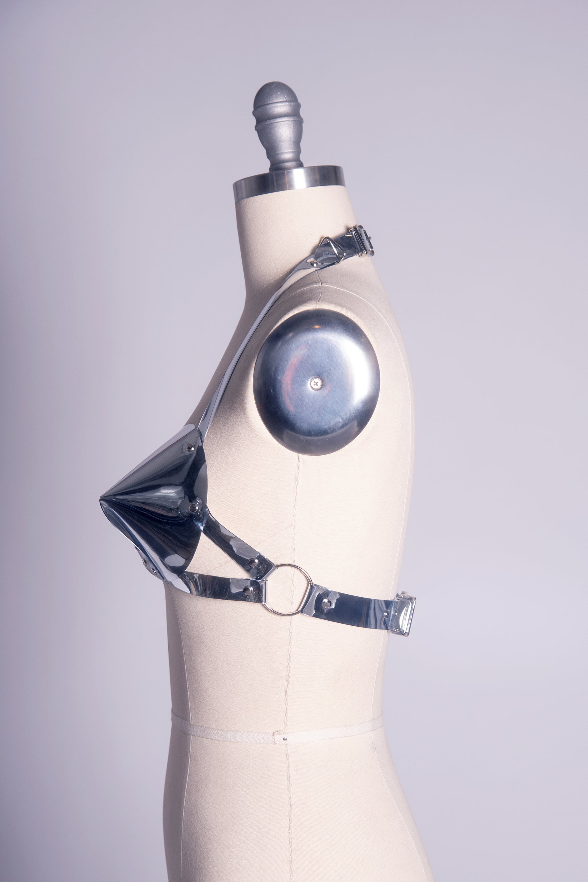 This bullet bra, or "cone bra" is inspired by retro pin-up vixens and futuristic fashion. This version is made in an amazing mirror silver PVC. This material is more lightweight than our standard PVC but still strong. Wear alone or layered and add a touch of metallic drama to any outfit.