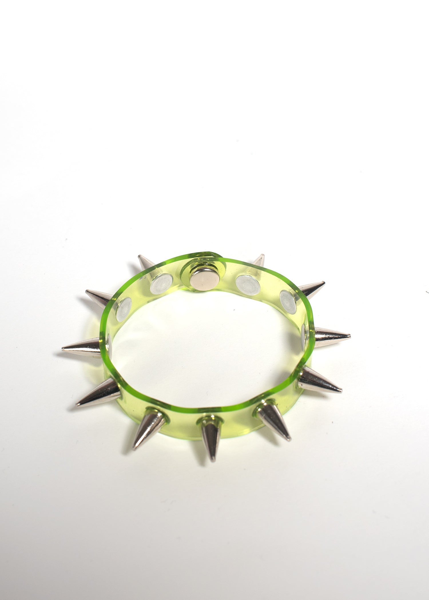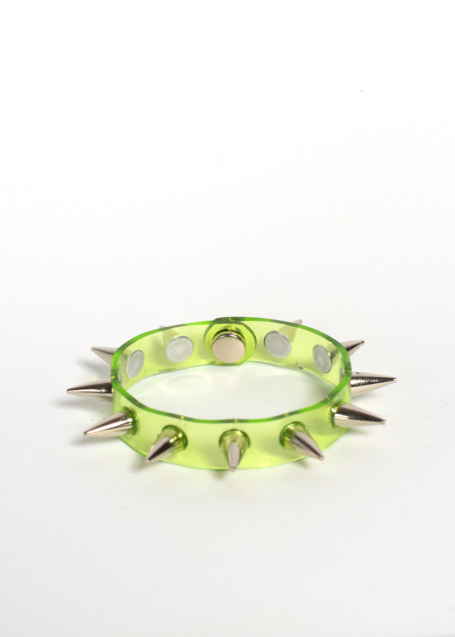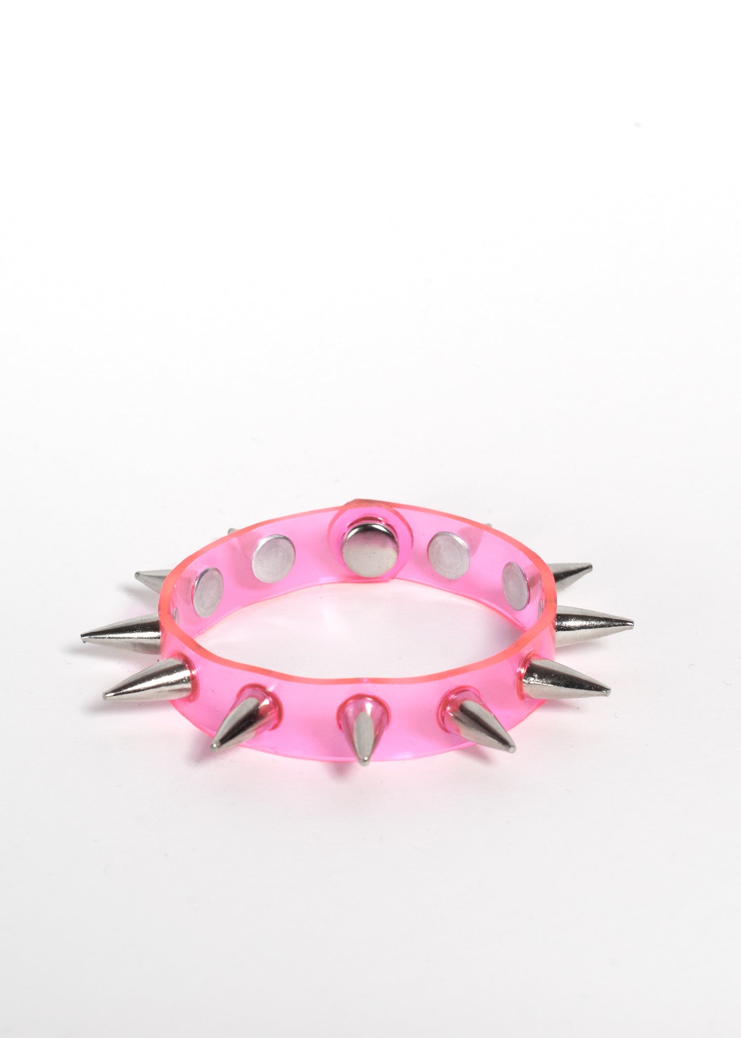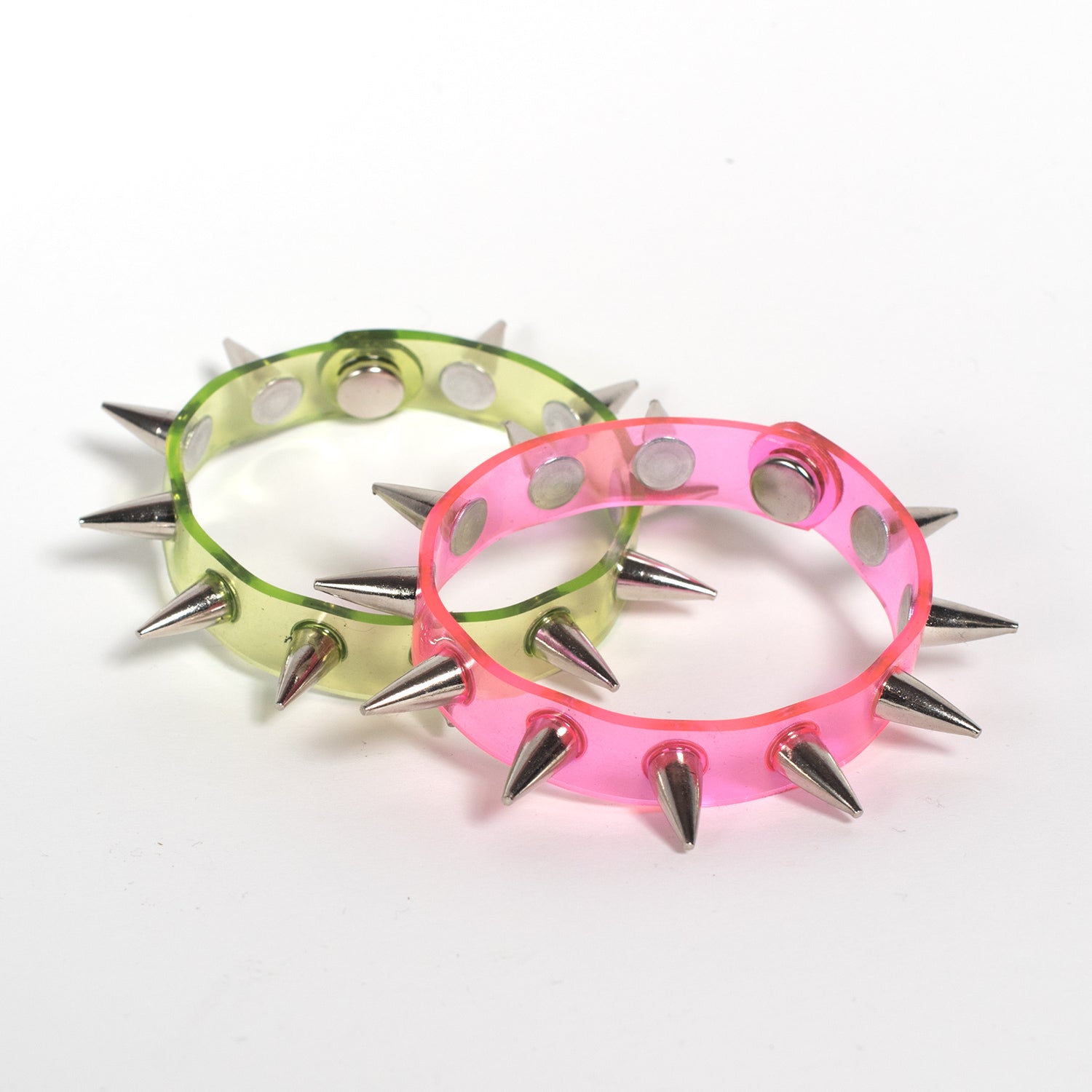 The spiked bangle bracelet slays with a row of 1/2" silver spikes and fun candy-colored PVC. Both Neon Pink and Neon Orange are UV reactive. Wear just one for a little pop of color, or stack them up and make a statement!