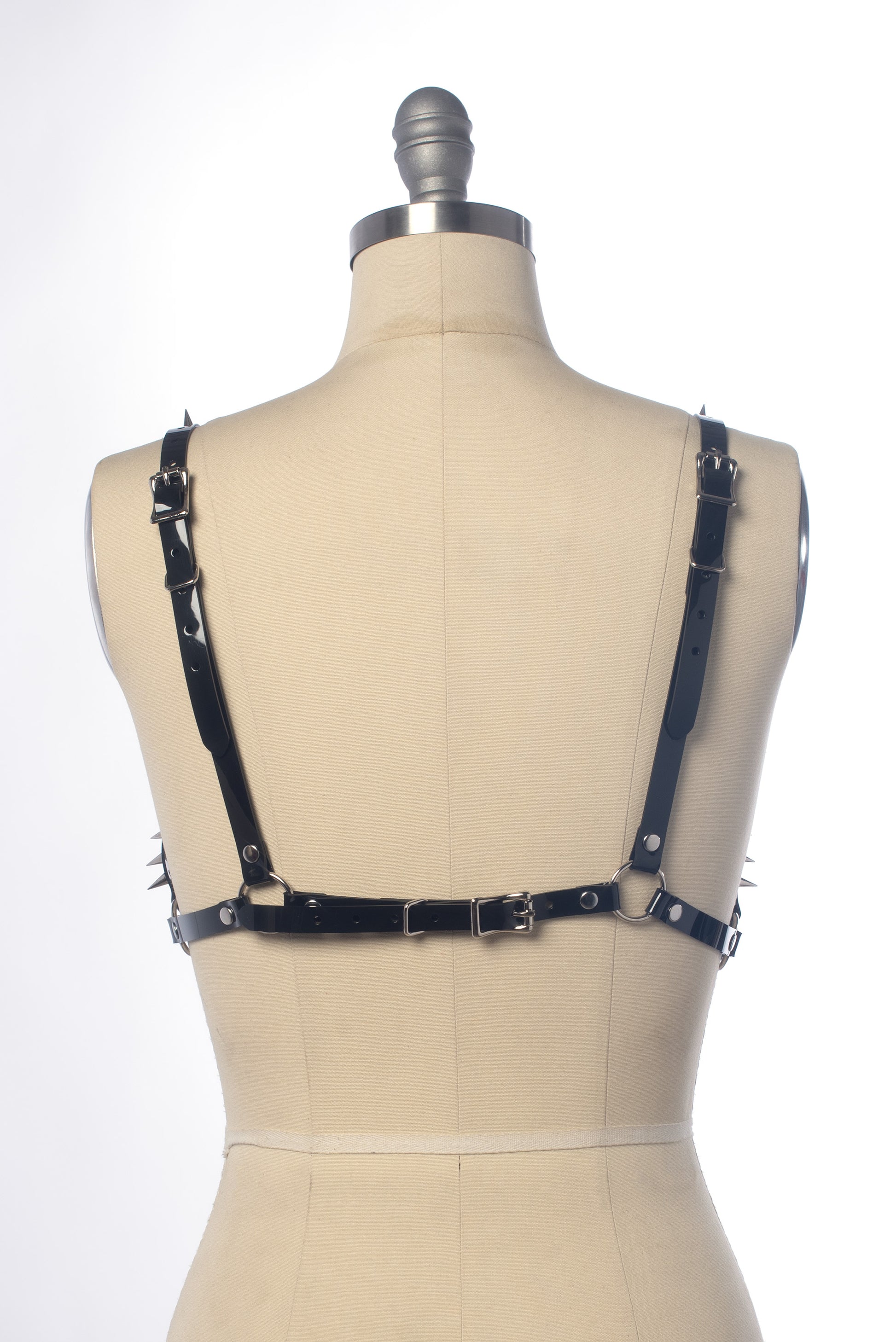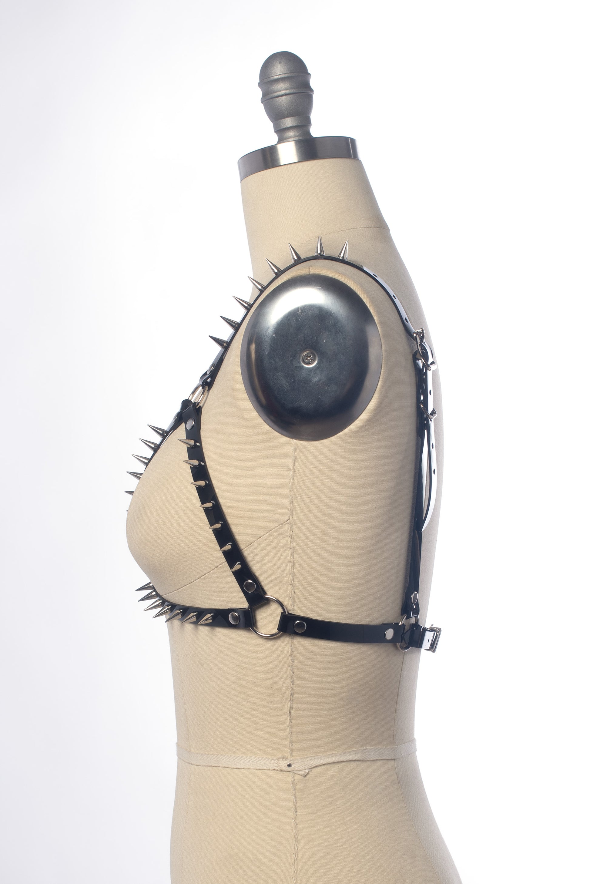 This harness cage bra is adorned with dozens of silver-toned spikes. Perfect layering piece. Buckles at the back and each shoulder strap for an adjustable fit.