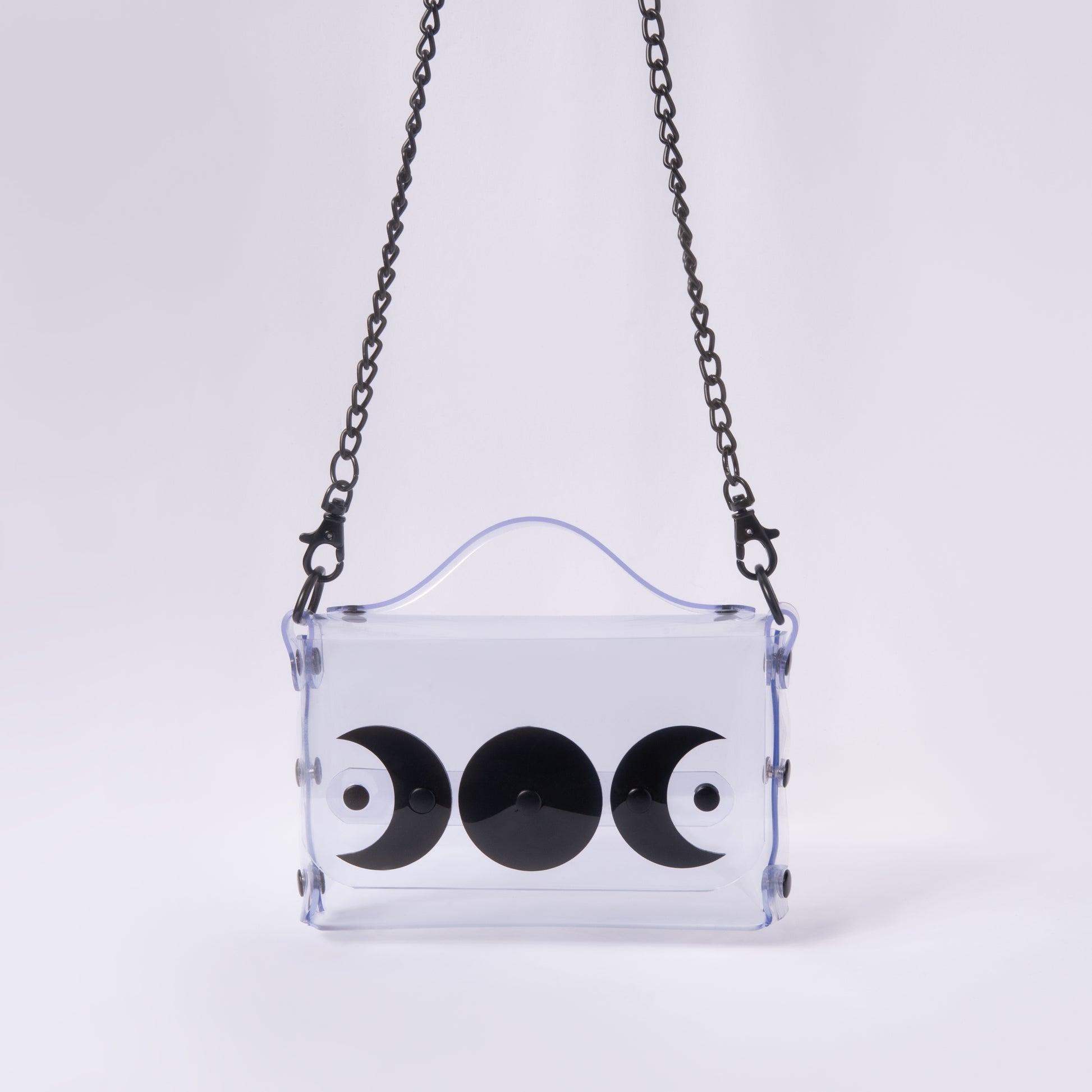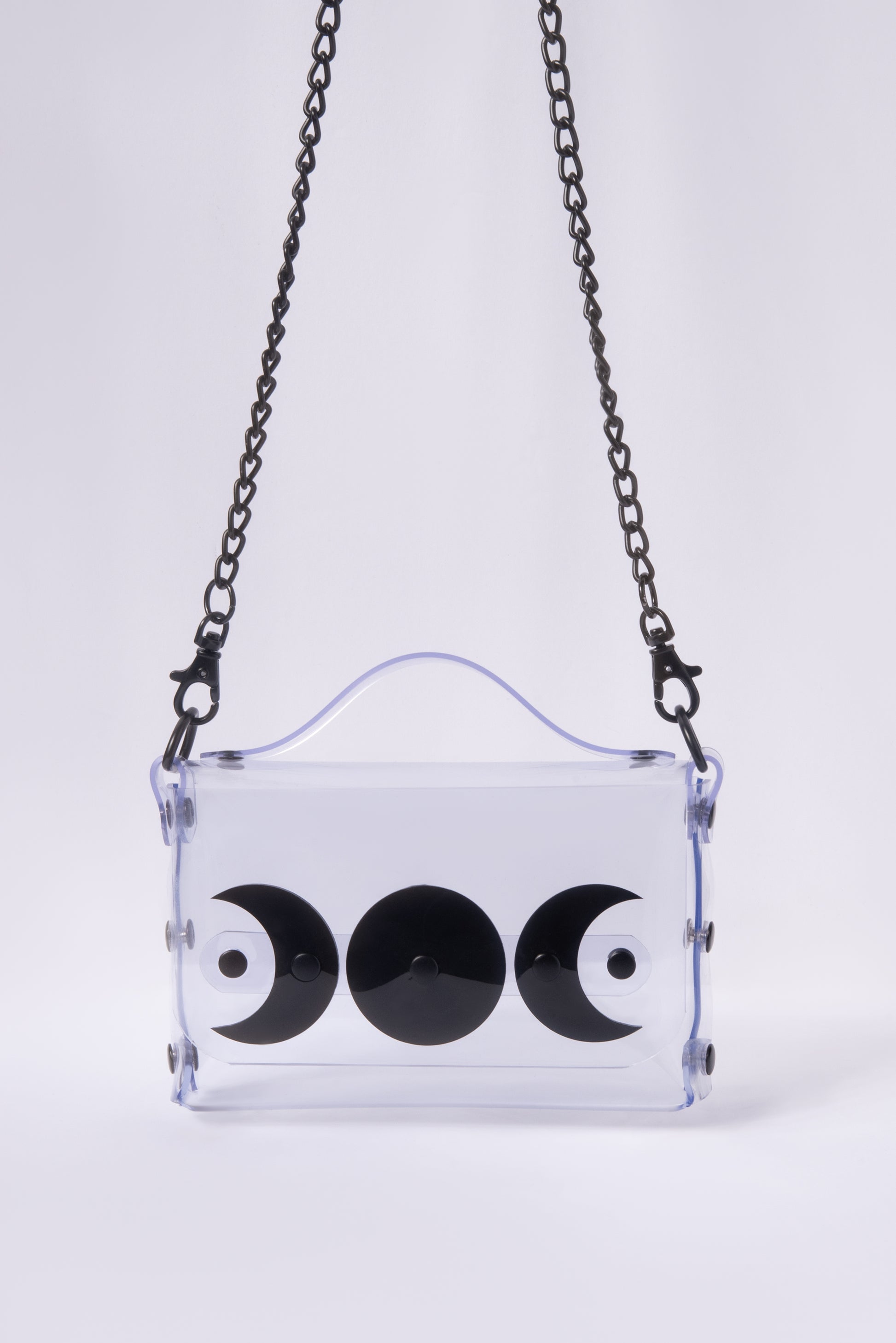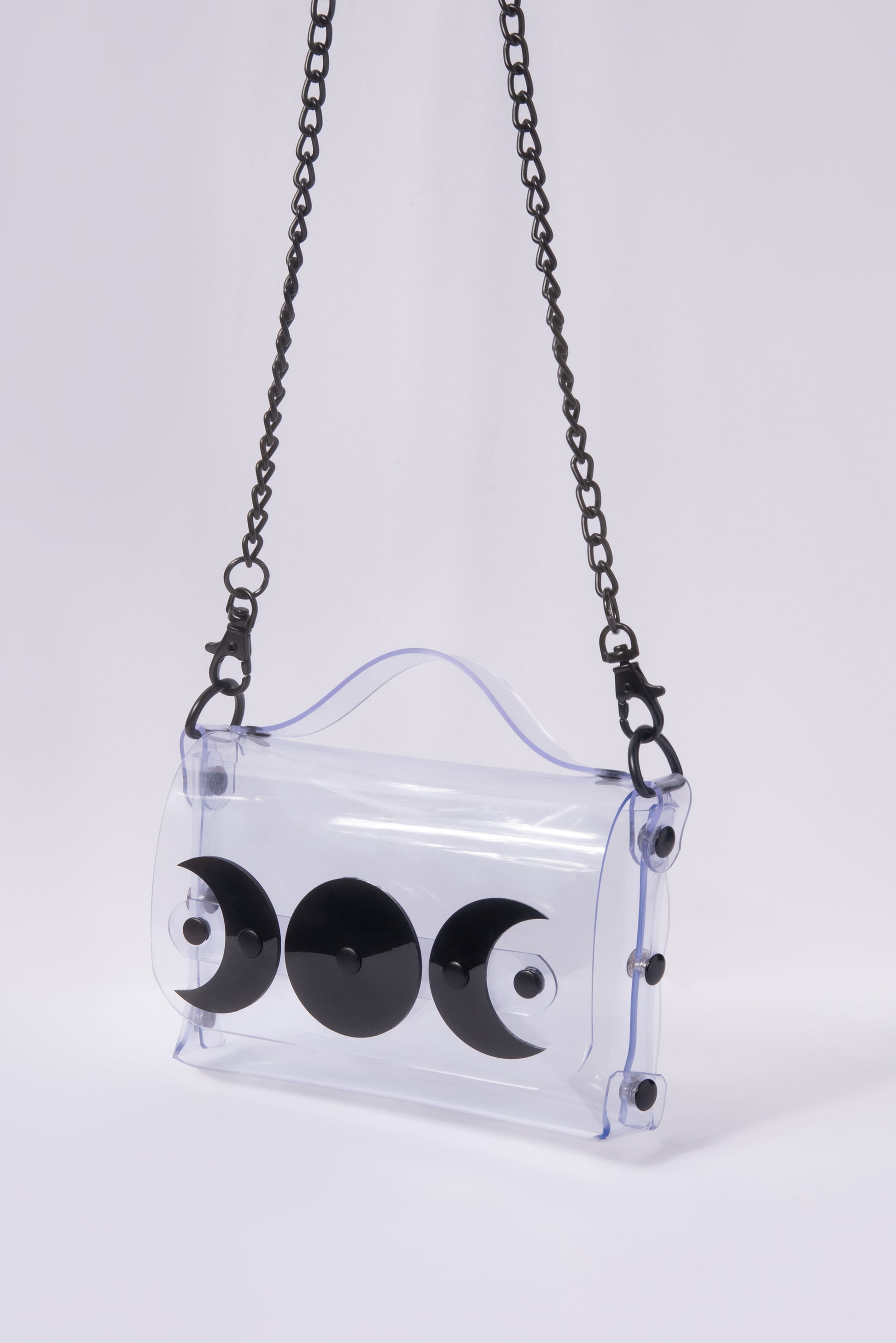 The Triple Moon Bag is small enough to be cute and just big enough to hold the going out essentials. Features a moon symbol boldly across the front, a detachable chain strap, handle, and magnetic snap closure. Shown in clear/black PVC and black/silver PVC. Also available in white PVC (black moon), red PVC (black moon), and black PVC (white moon).