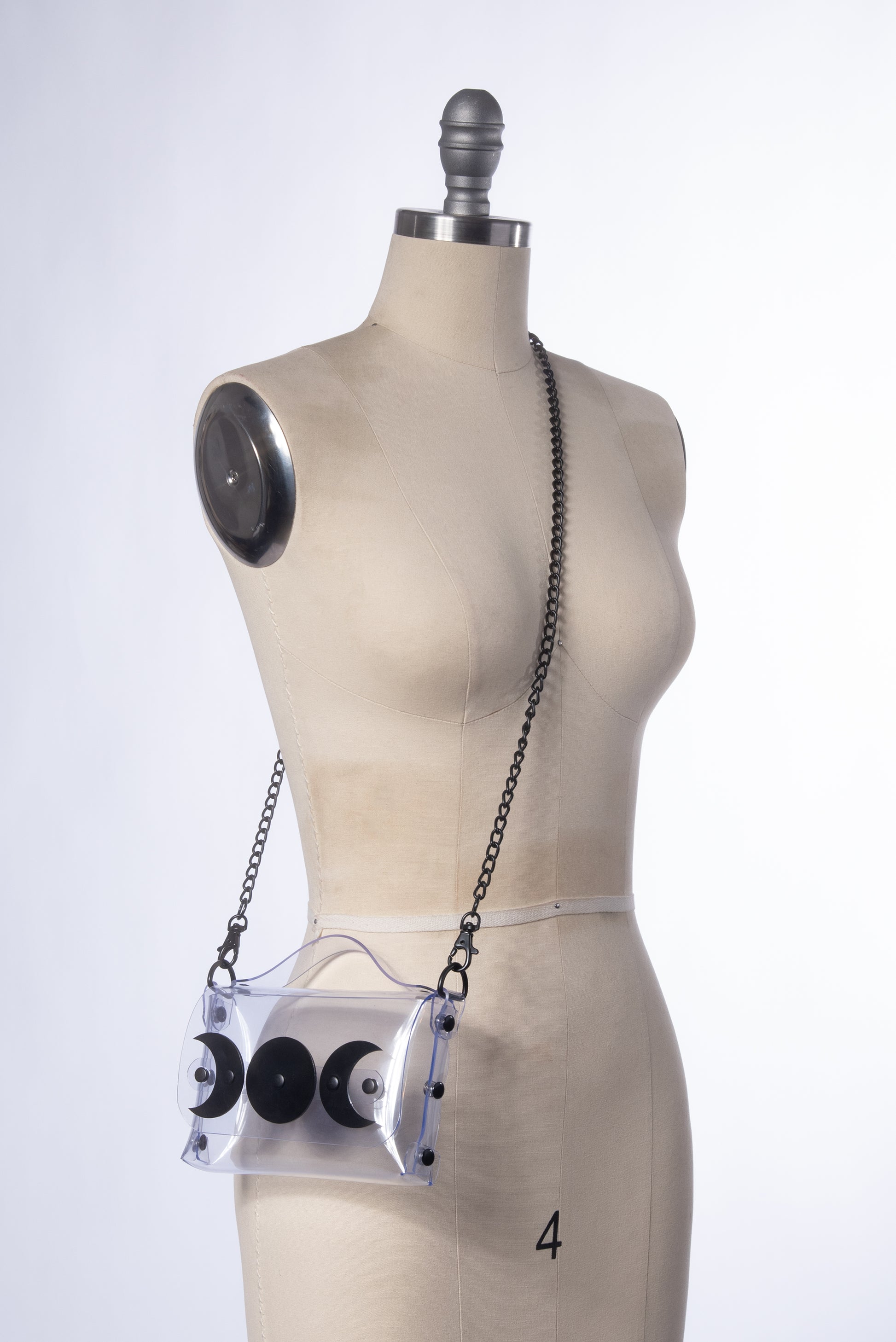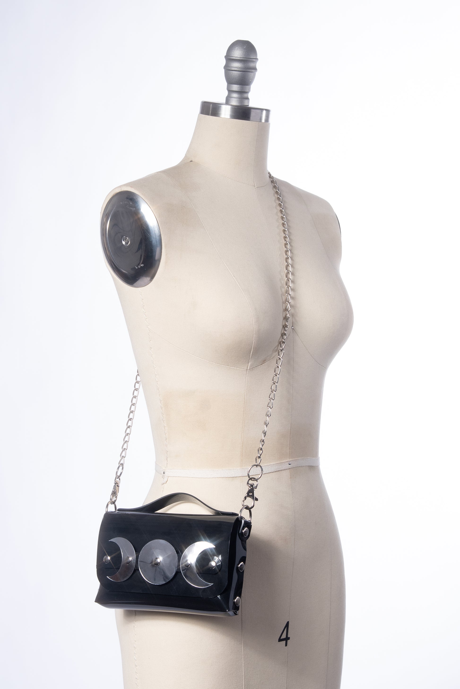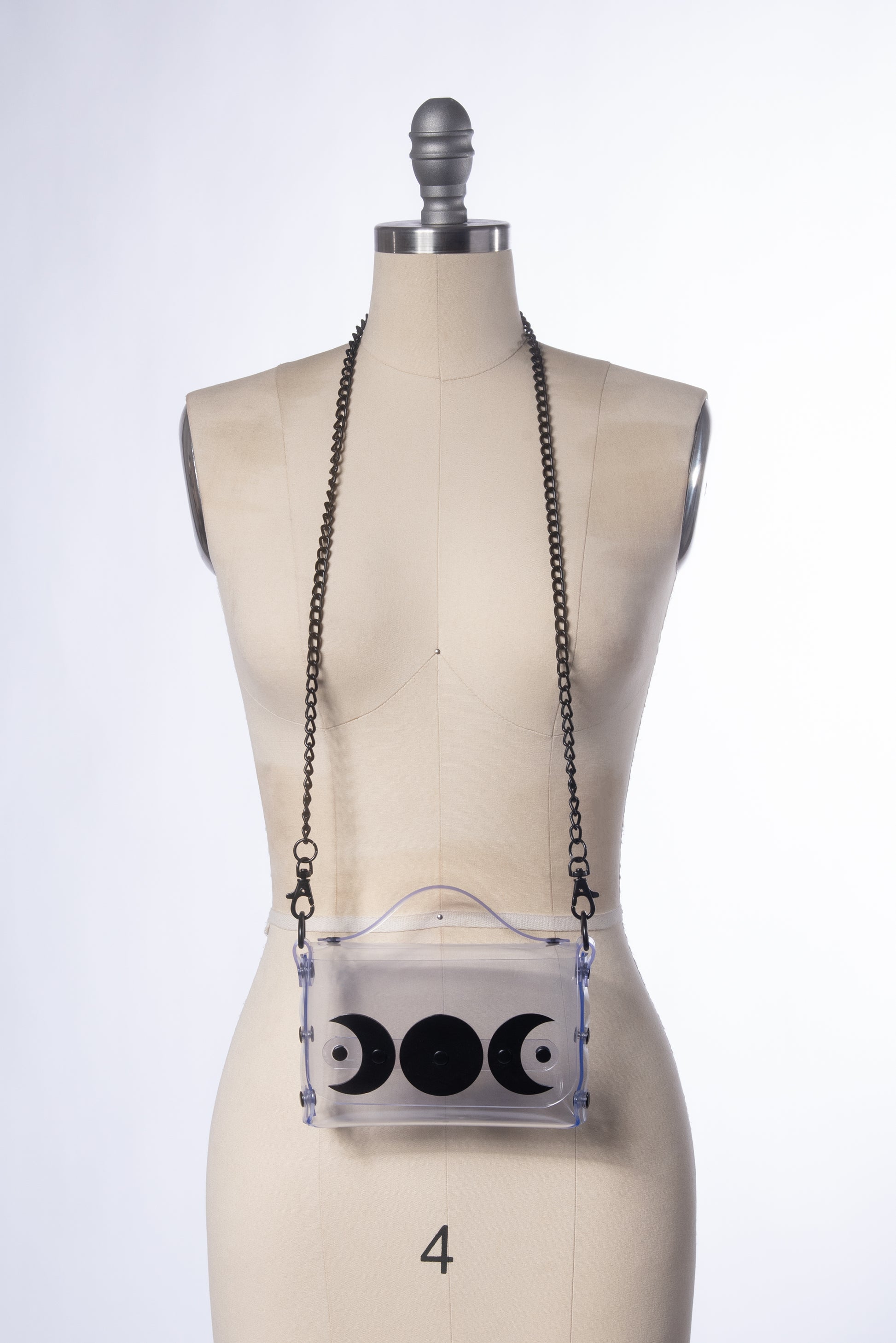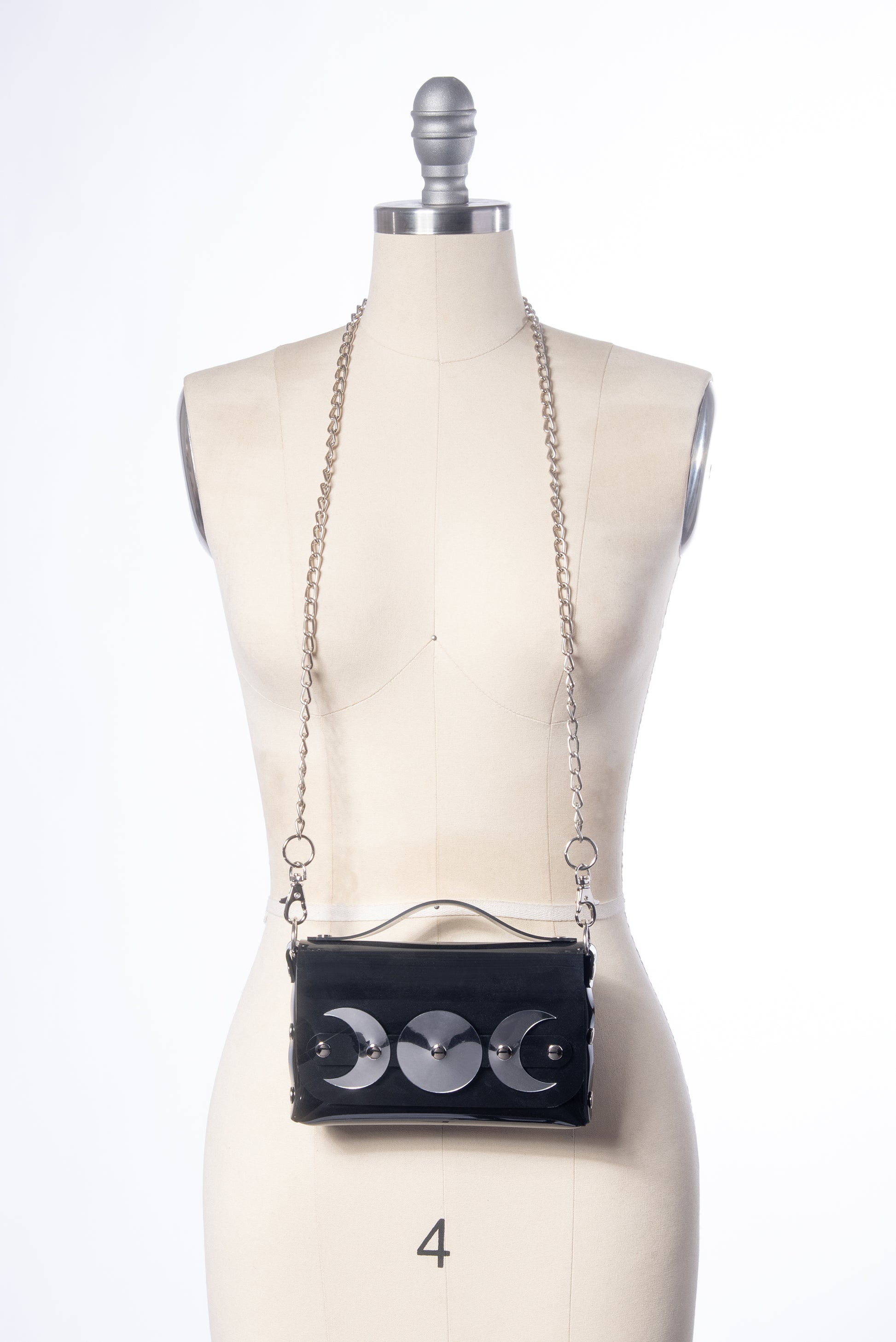 The Triple Moon Bag is small enough to be cute and just big enough to hold the going out essentials. Features a moon symbol boldly across the front, a detachable chain strap, handle, and magnetic snap closure. Shown in clear/black PVC and black/silver PVC. Also available in white PVC (black moon), red PVC (black moon), and black PVC (white moon).