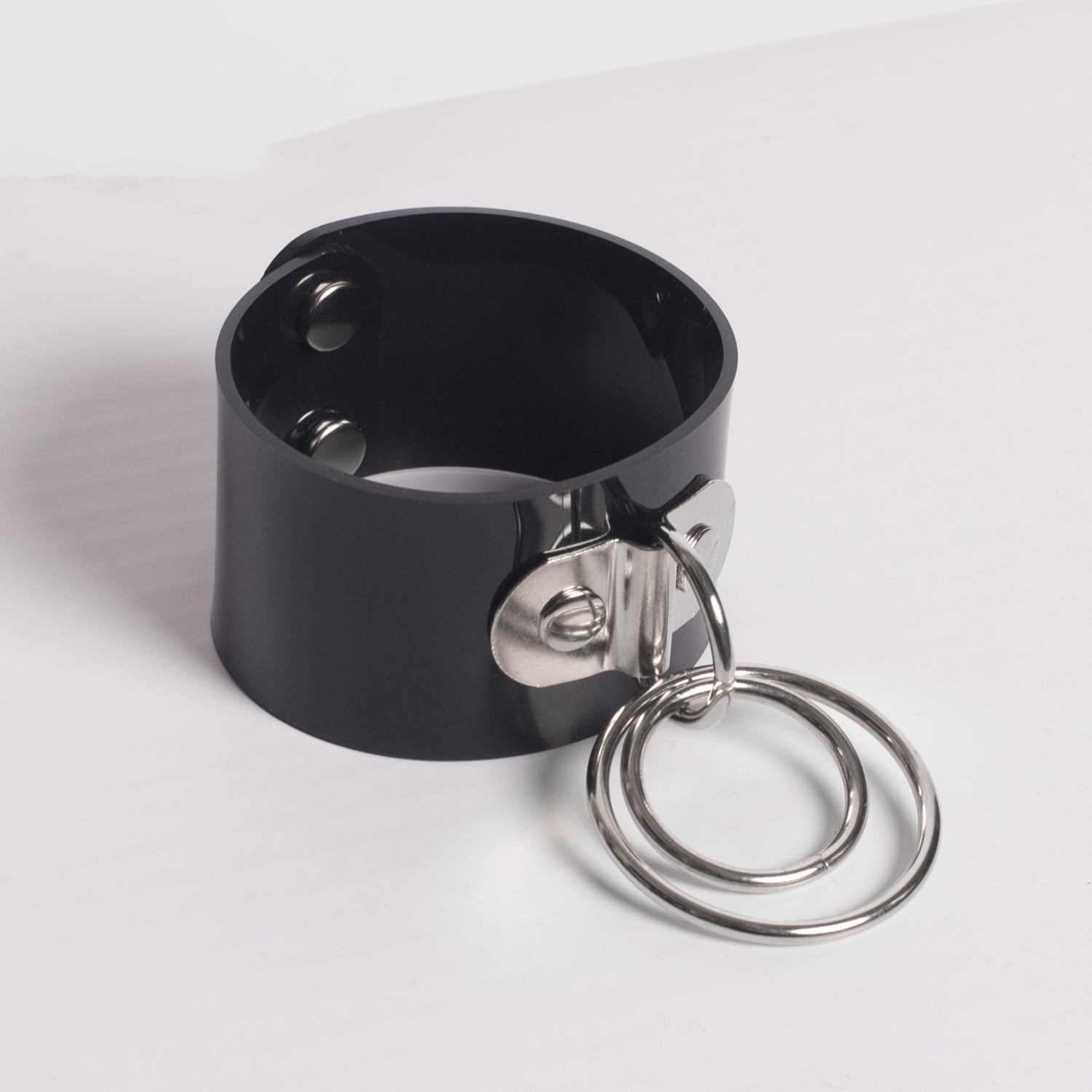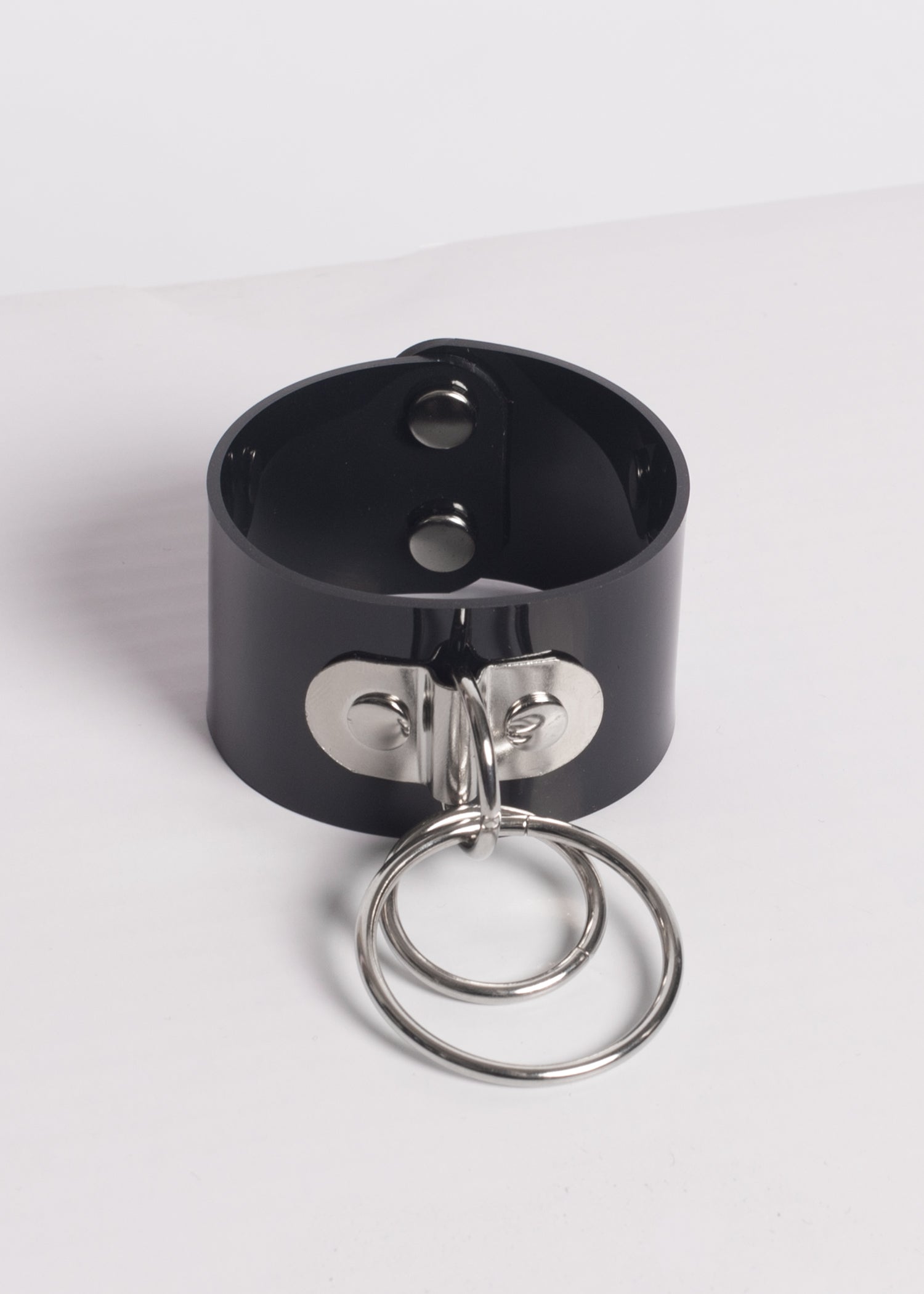 This classic cuff bracelet turns it up a notch in bright blue PVC with double-layered o-ring hardware details.