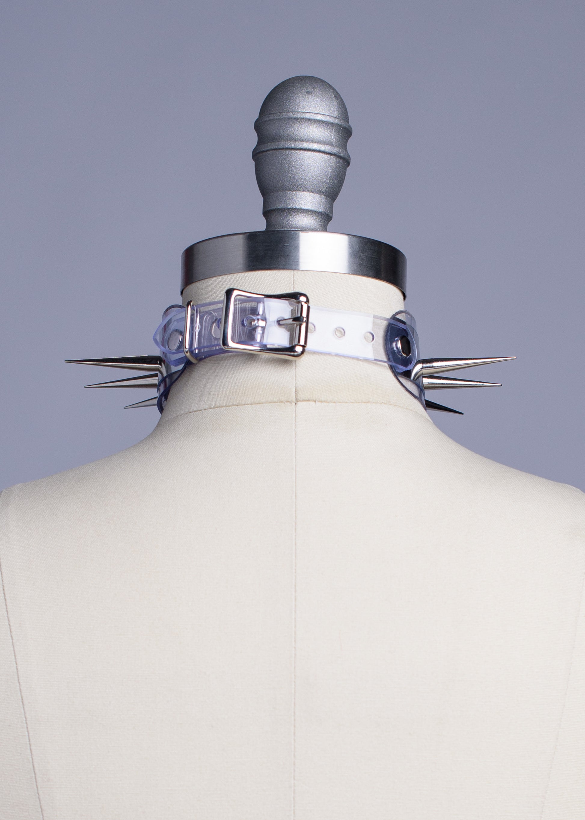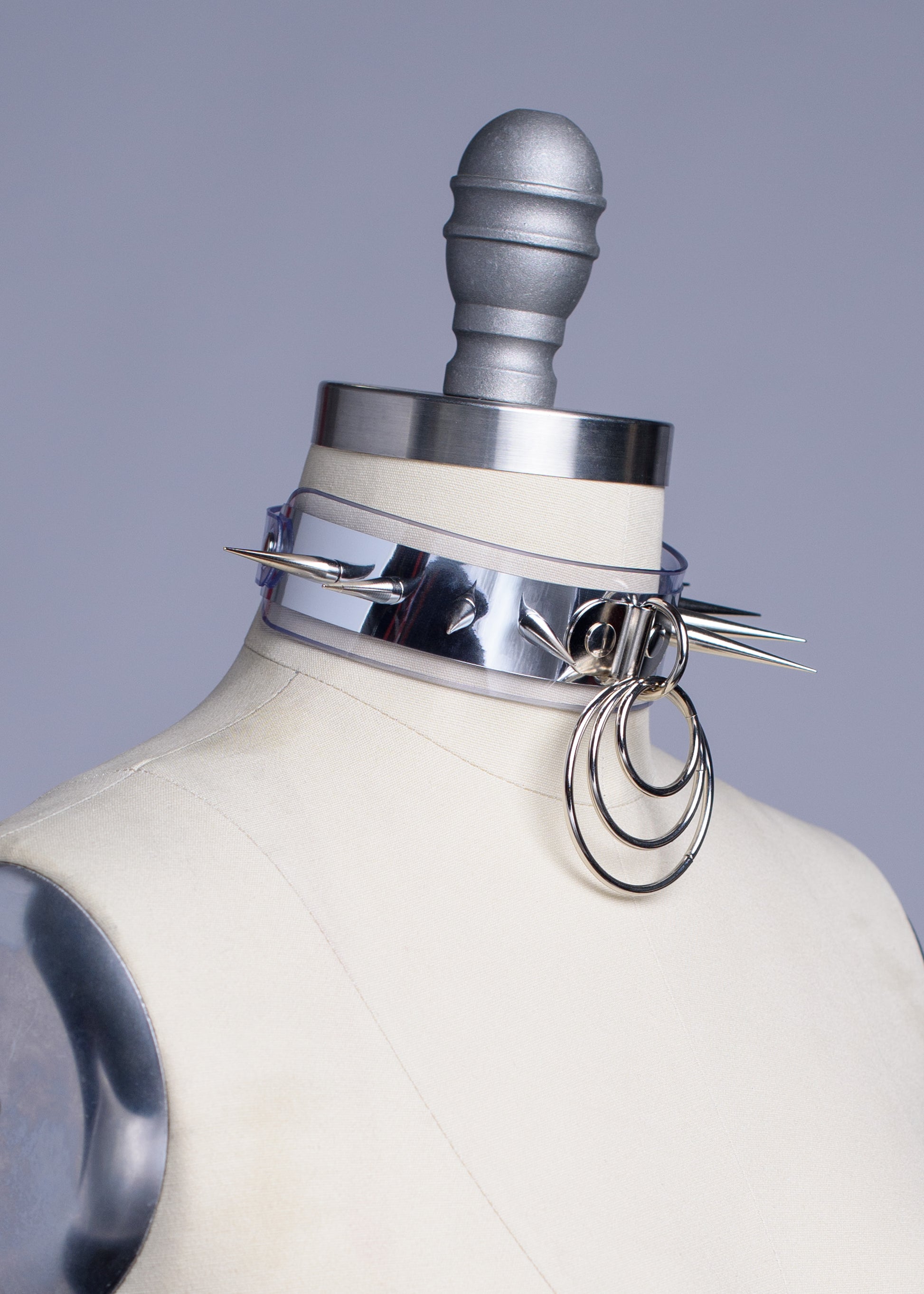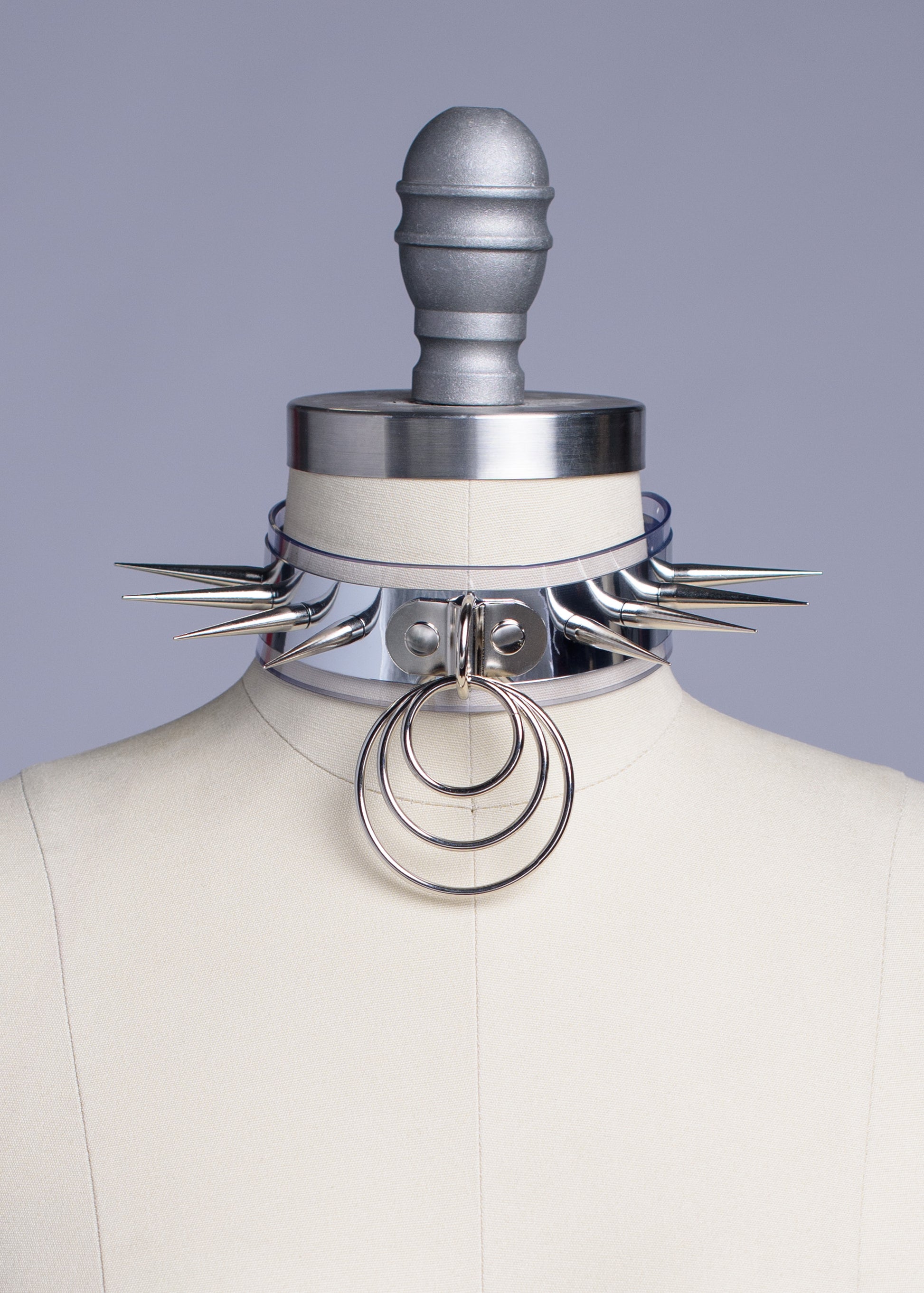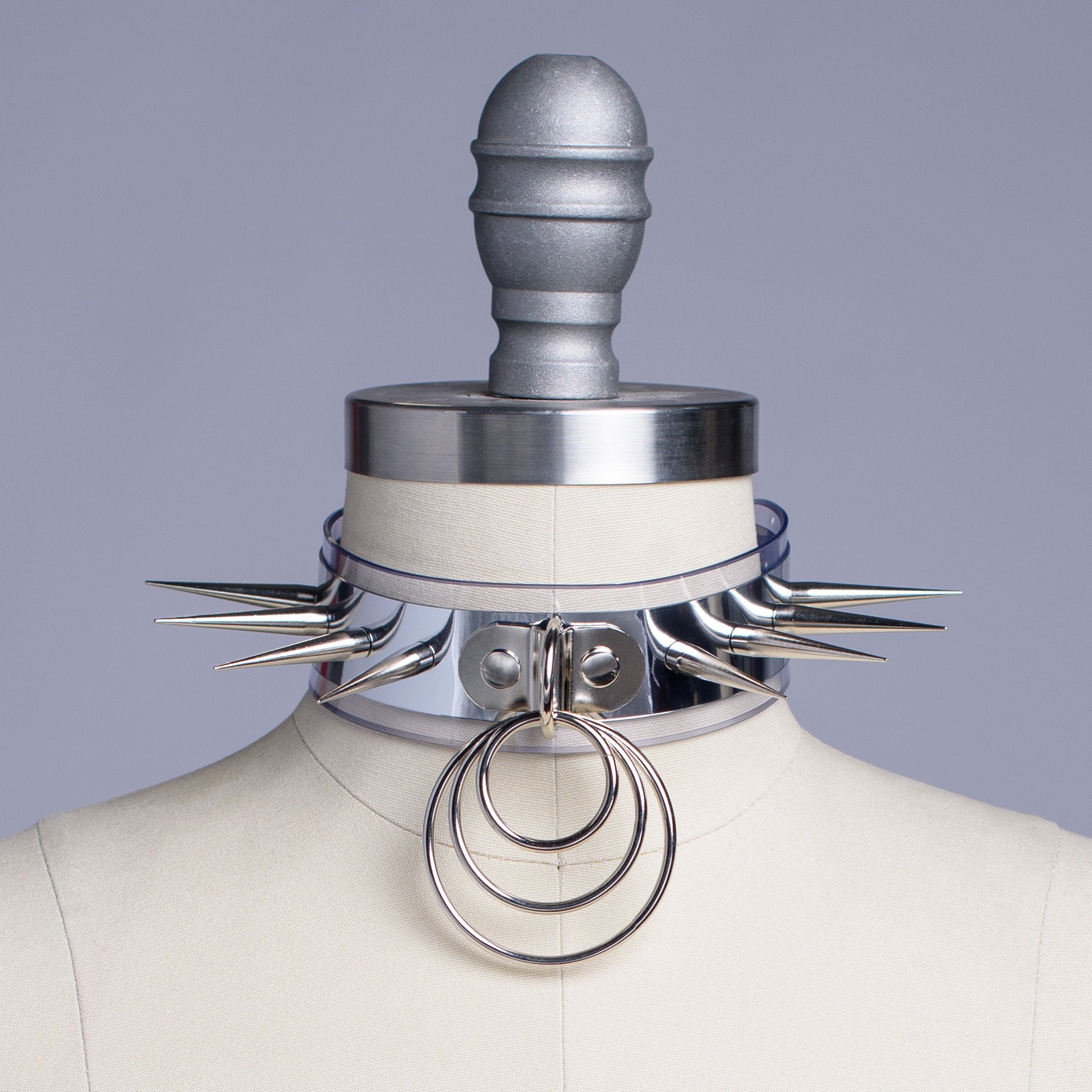 The Very Metal Choker Collar has a lot going on, in a good way. A very good way. Silver metallic PVC is layered over Clear or Black PVC. There are three layered o-rings and 2" spikes all around.